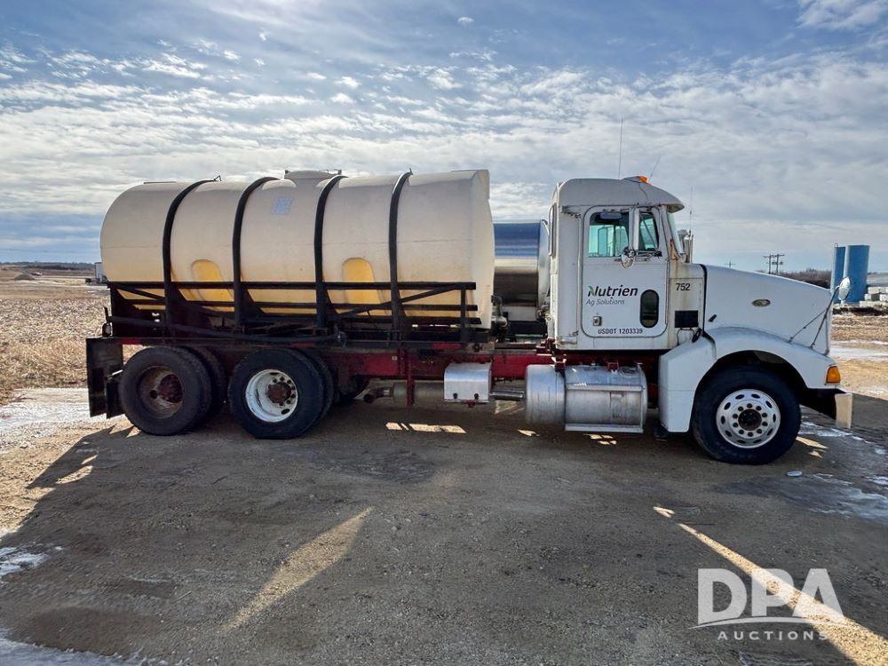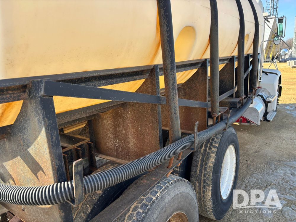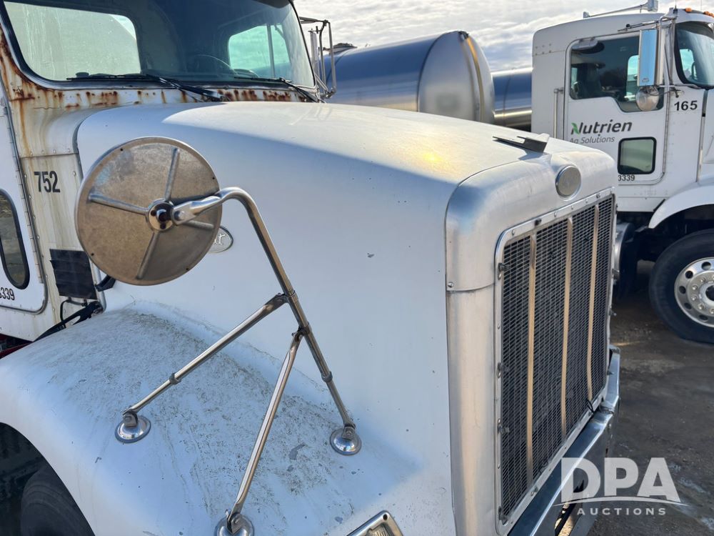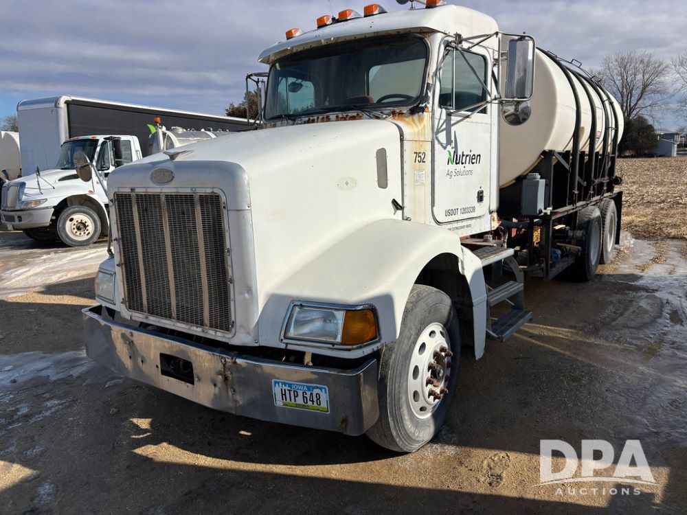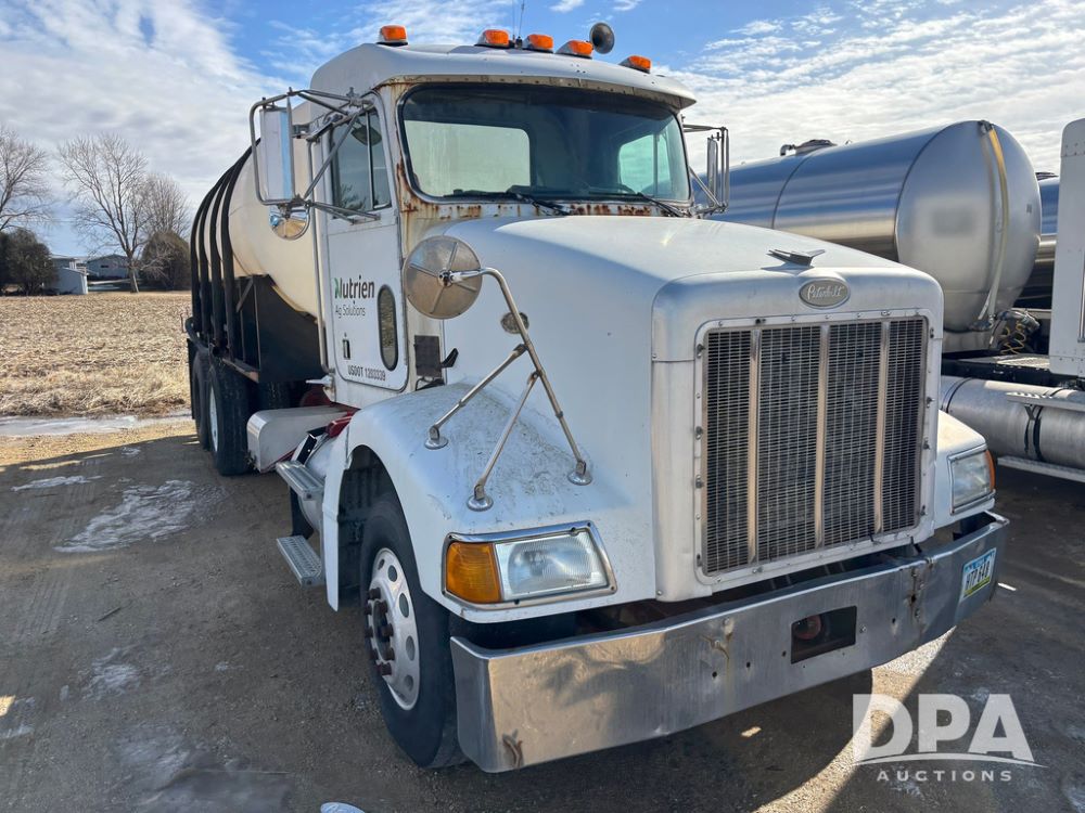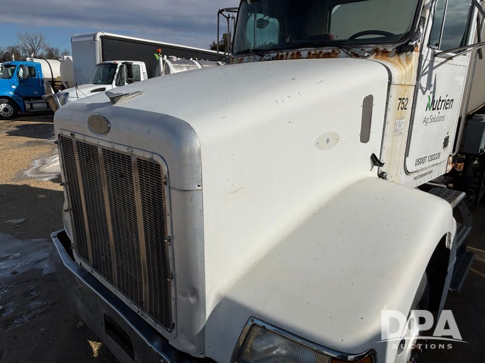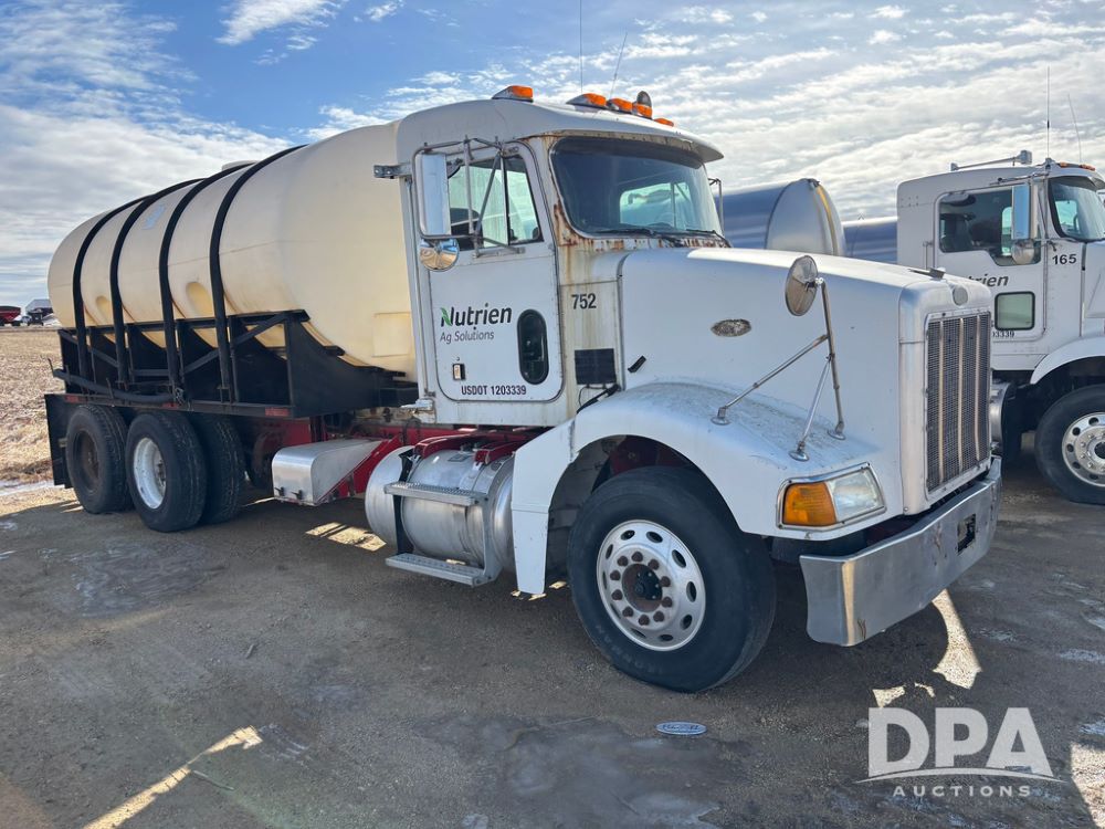 1998 Peterbilt 385 Liquid Nurse Truck (GP12781, Unit 108752), Cat diesel engine, Eaton Fuller Super 10 speed transmission, air conditioning, heat, Am/Fm radio, cruise control, engine brake, tandem axle, full screw, air ride suspension, 3200 gallon poly liquid nurse tank, hydraulic pump, 11R22.5 tires, aluminum front rims, shows 891,032 miles.