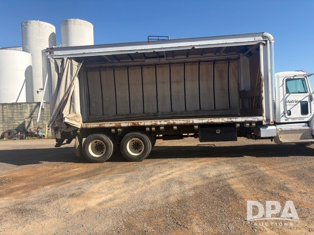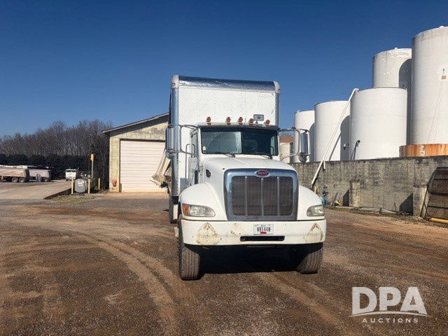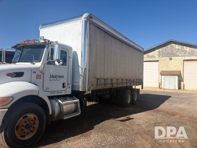 2012 Peterbilt 348 Van Truck (PZ14424, Unit 95218), diesel engine, Allison automatic transmission, air conditioning, heat, Am/Fm CD radio, tandem axle, Curtain side van box system, rear roll up door, side winches, shows 233,187 miles.
