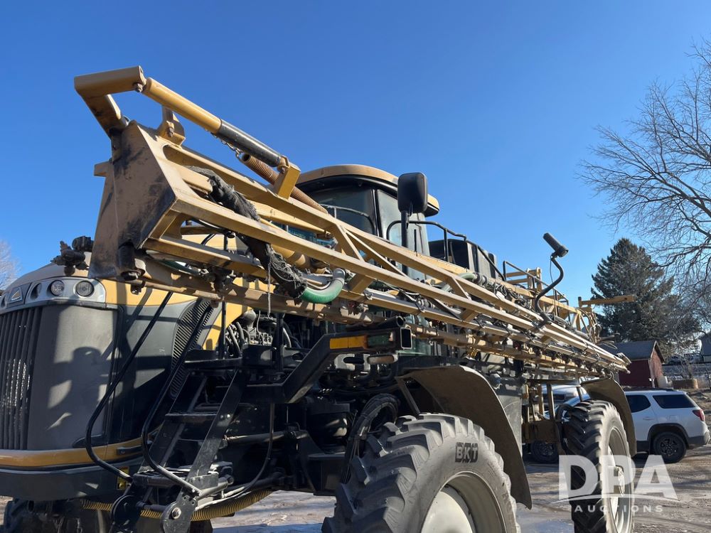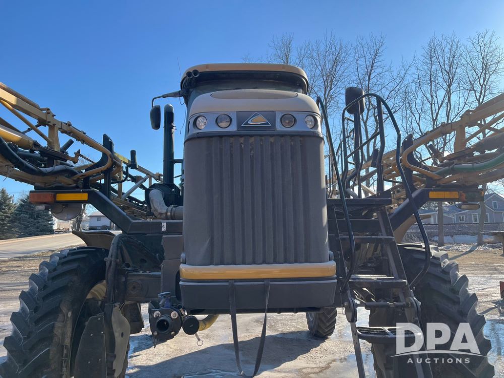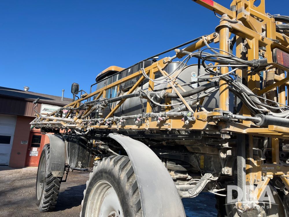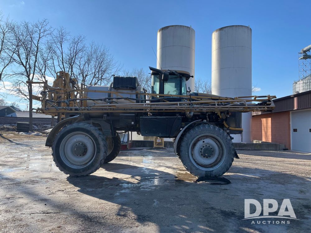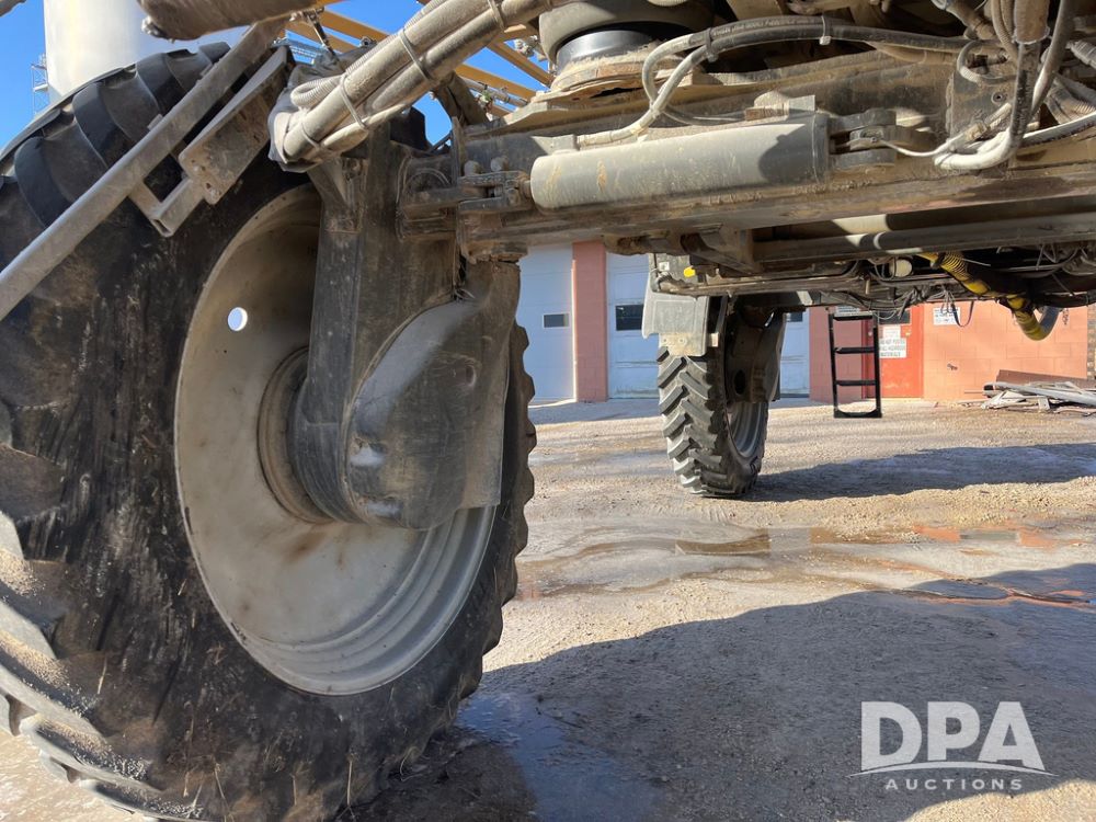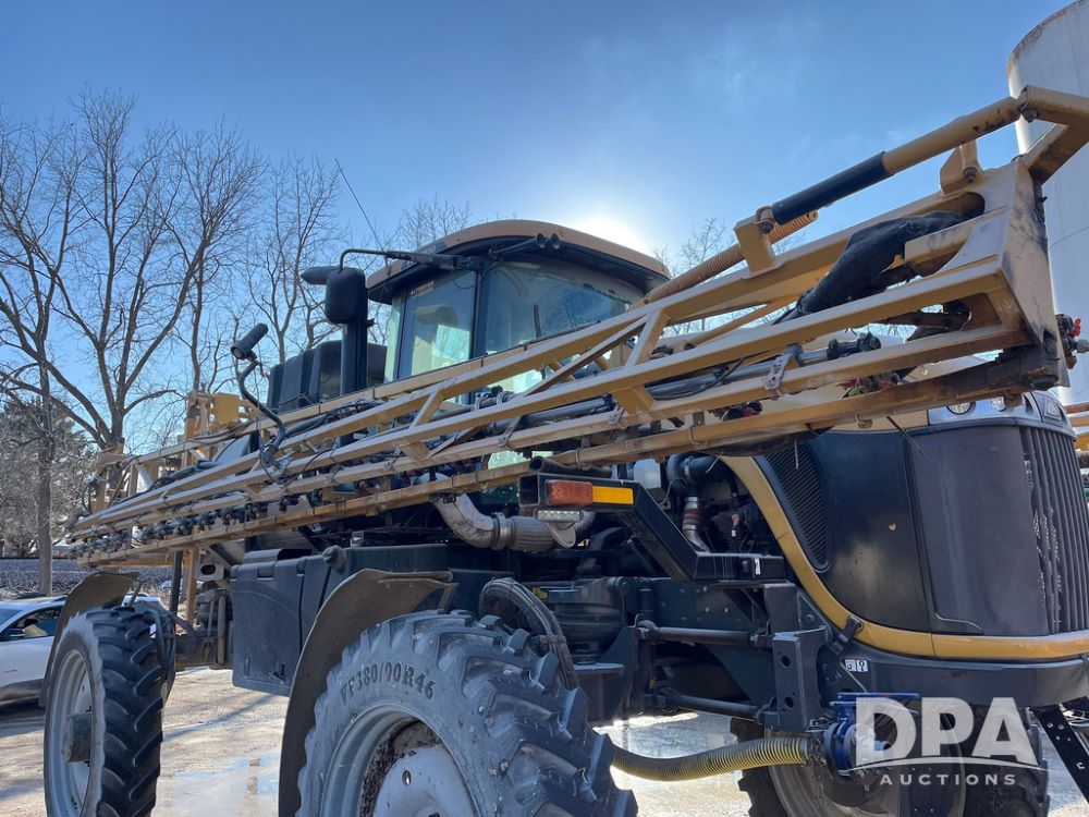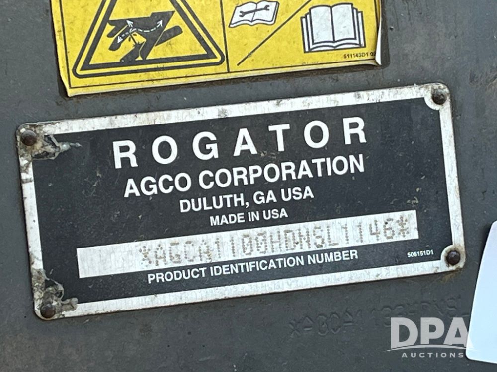 2013 RoGator 1100 Sprayer (JN3997, Unit 1055), AGCO diesel engine, hydrostatic transmission, air conditioning, heat, Am/Fm radio, buddy seat, 1100 gallon stainless steel liquid system, 100' boom, top poly rinse tank, front fill, BKT Agrimax Spargo, Firestone and Michelin VF380/90R46 tires, fenders, Raven Viper Pro monitor, shows 3,483 hours.