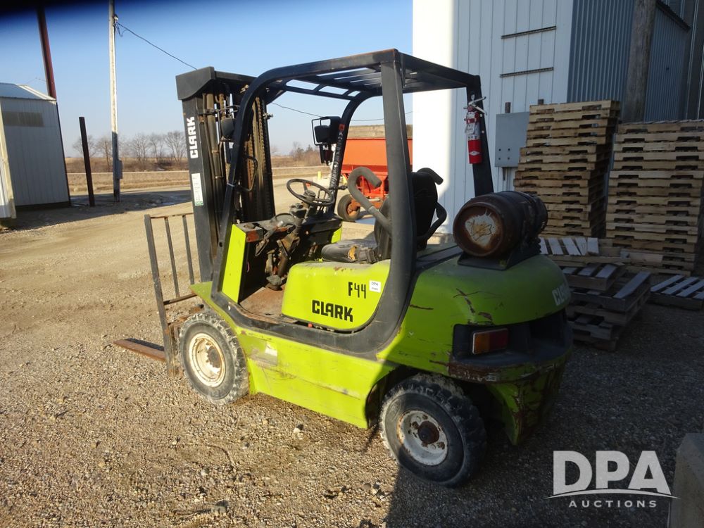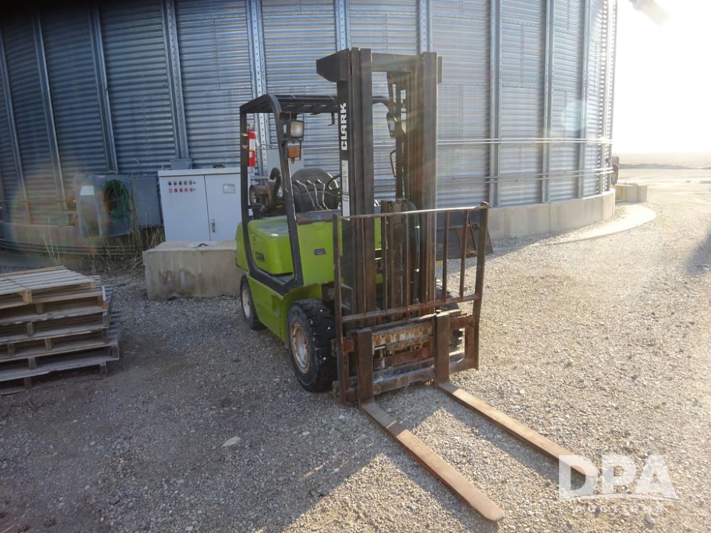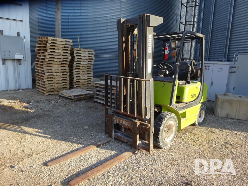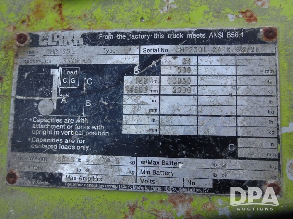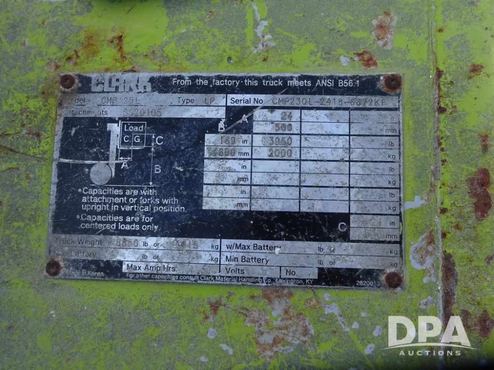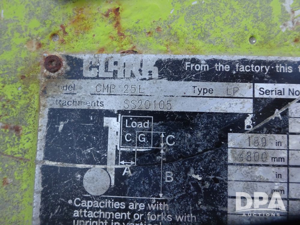 Clark Forklift (PZ14411, Unit F44), Clark model CMP 25L forklift, LP gas engine, shuttle shift transmission, canopy, lights, forks, side shift, 7.00-12 front tires, 650-10 rear tires, shows 5,603 hours.
