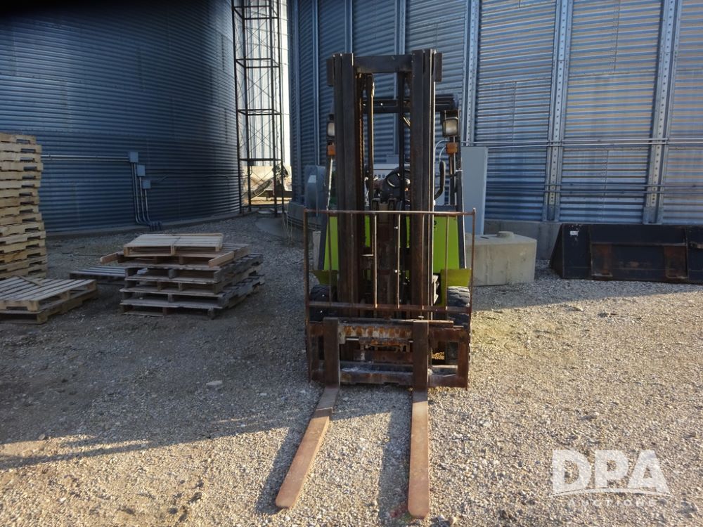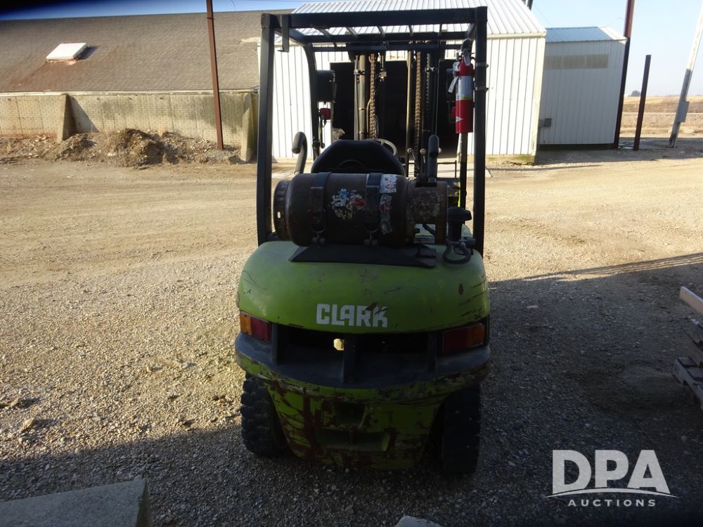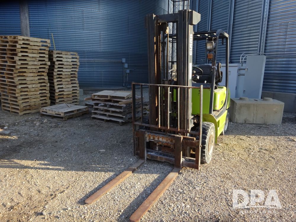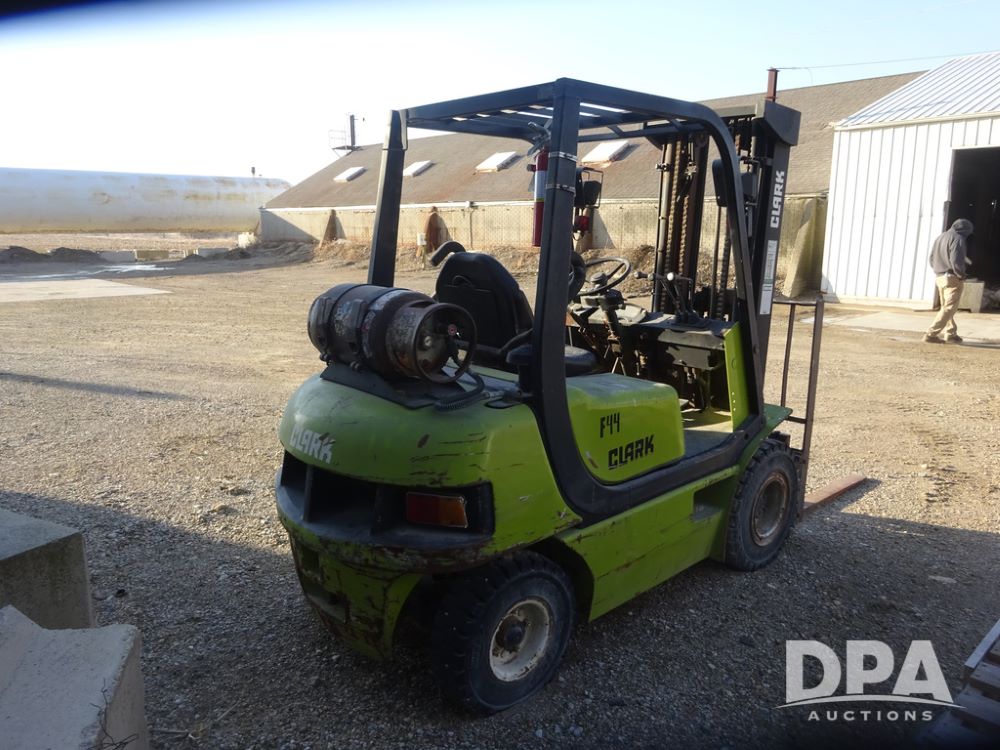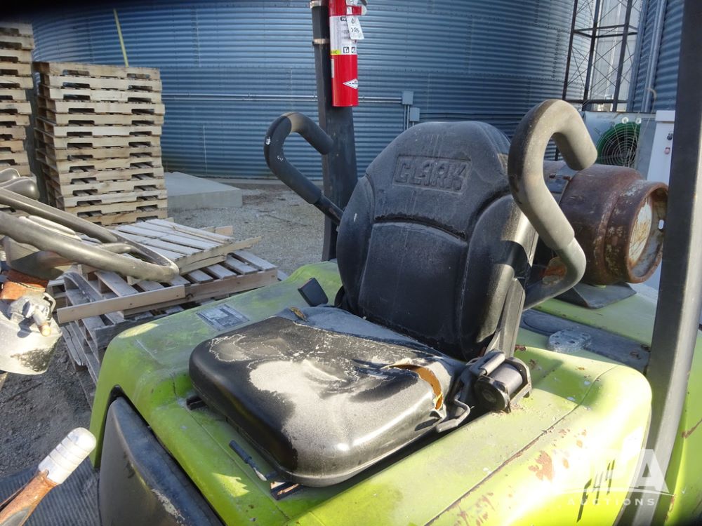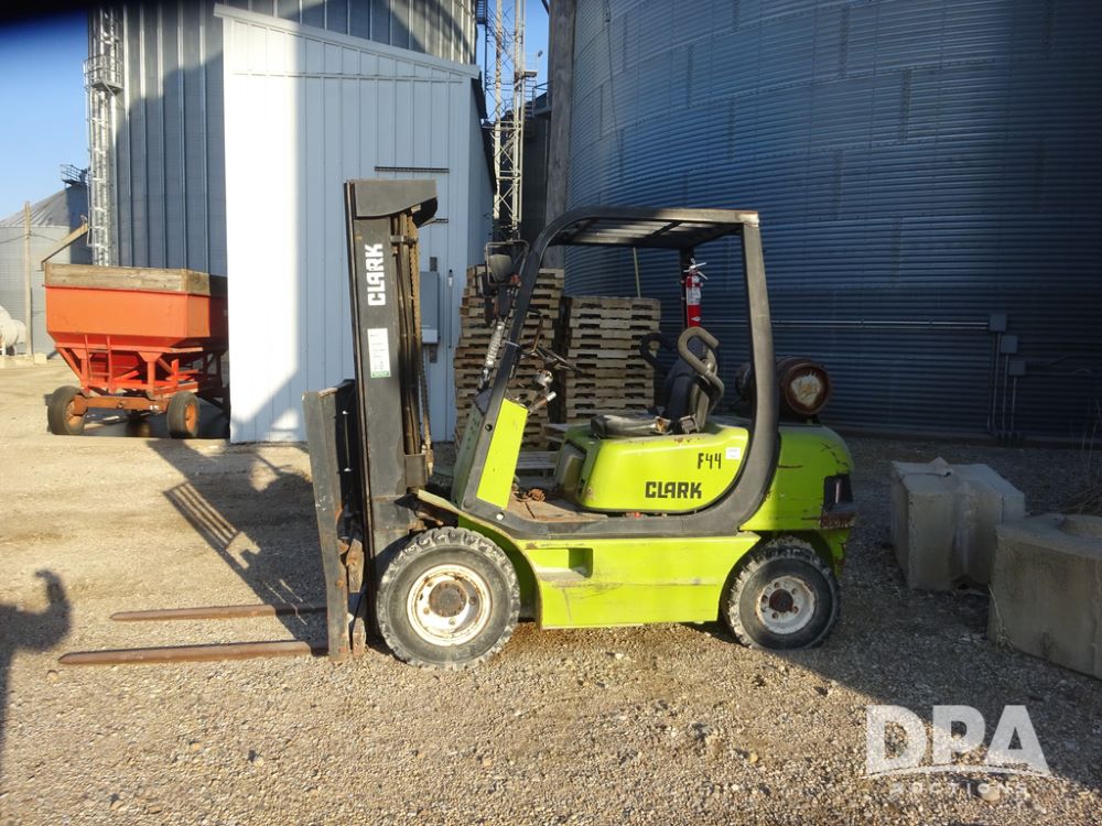 Clark Forklift (PZ14411, Unit F44), Clark model CMP 25L forklift, LP gas engine, shuttle shift transmission, canopy, lights, forks, side shift, 7.00-12 front tires, 650-10 rear tires, shows 5,603 hours.