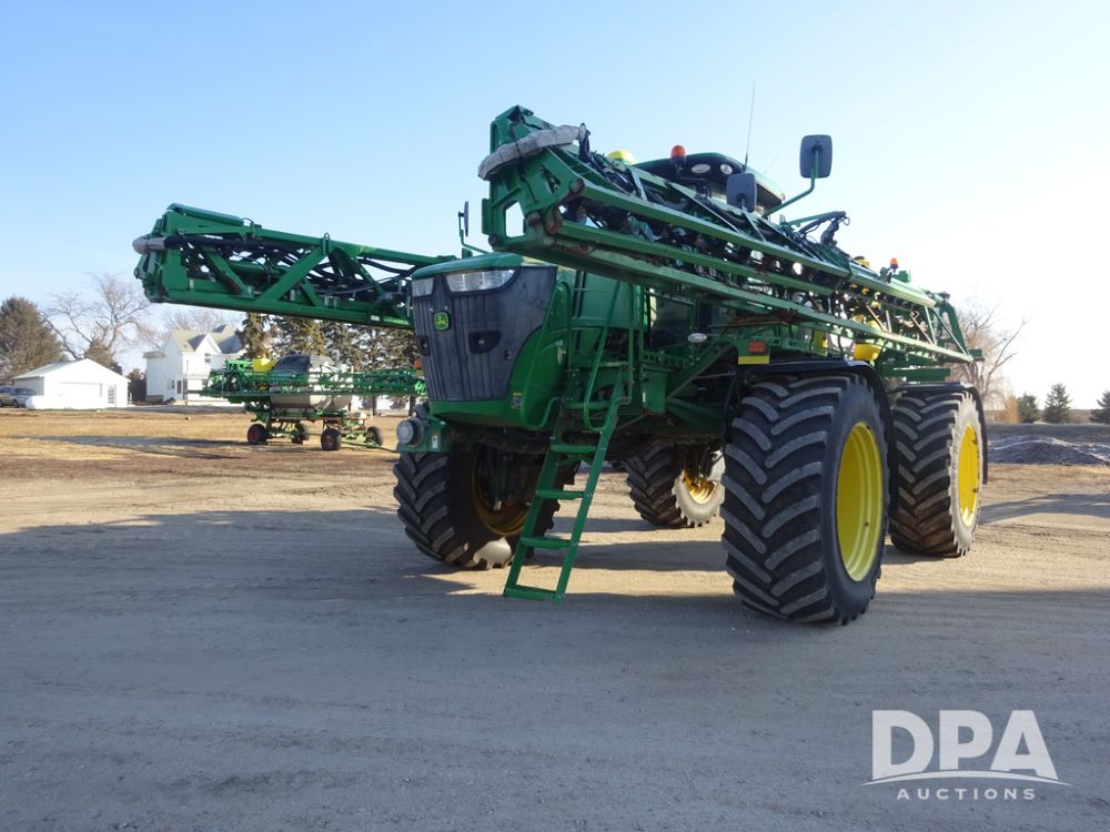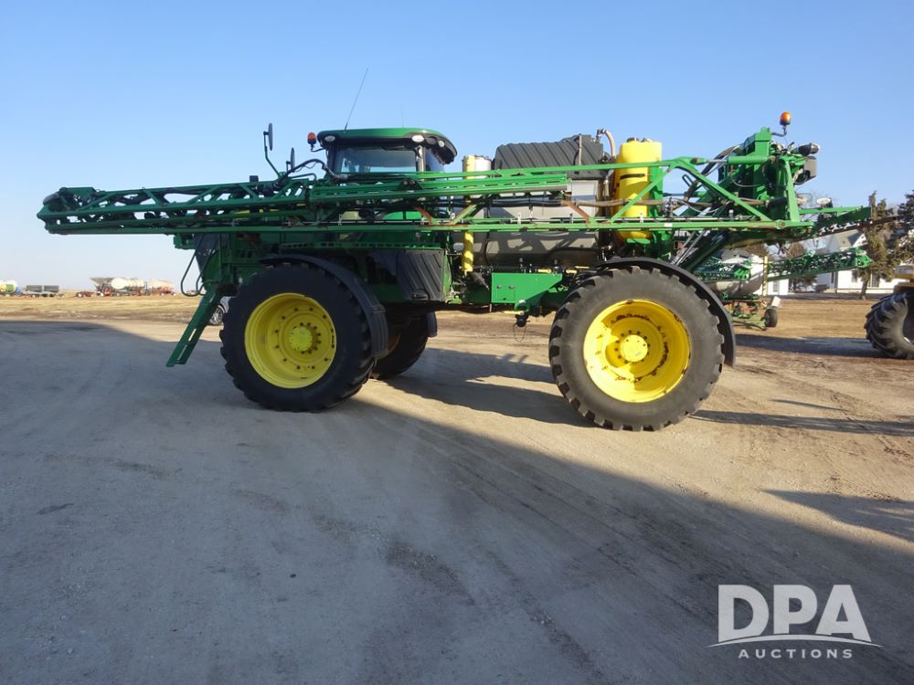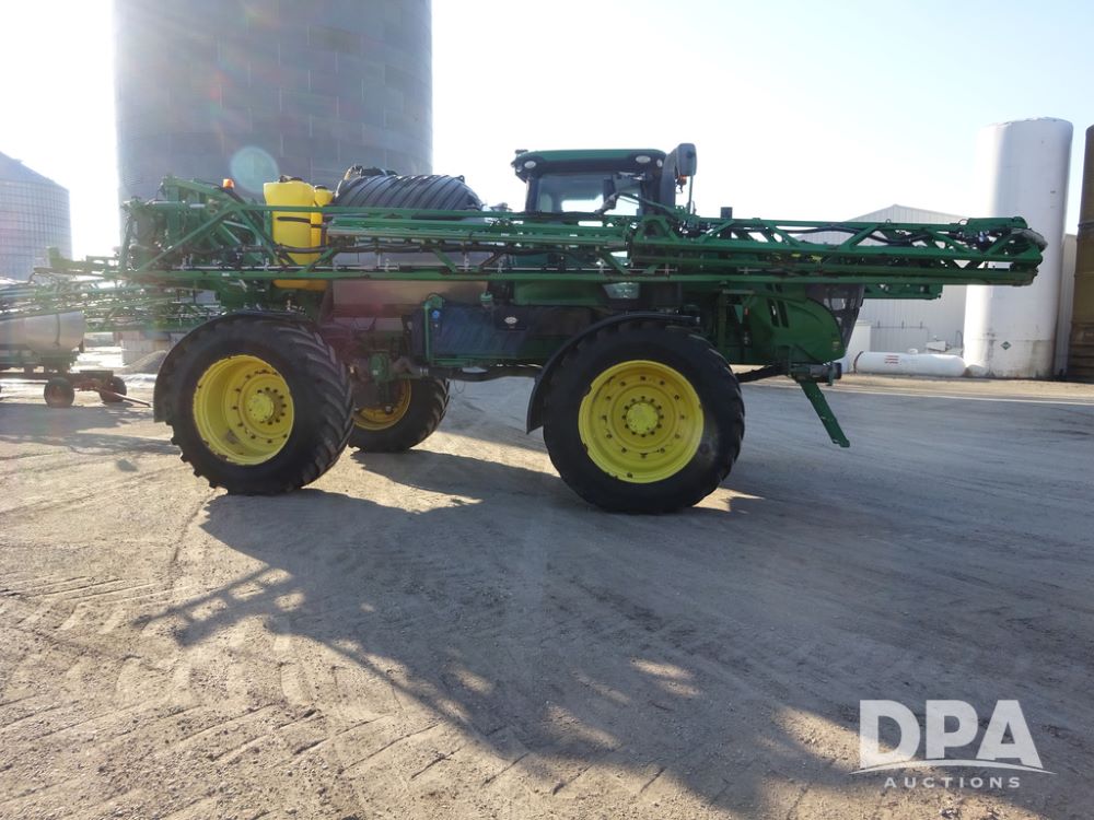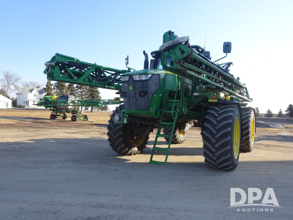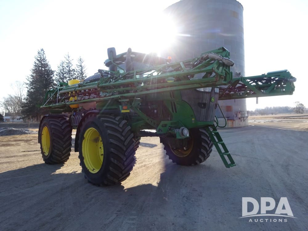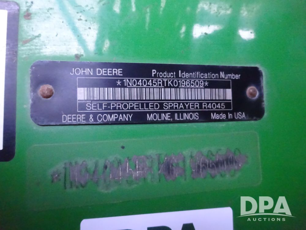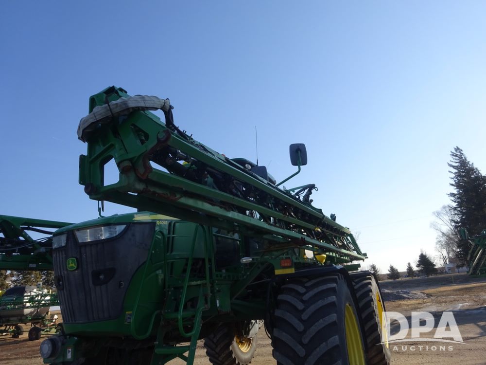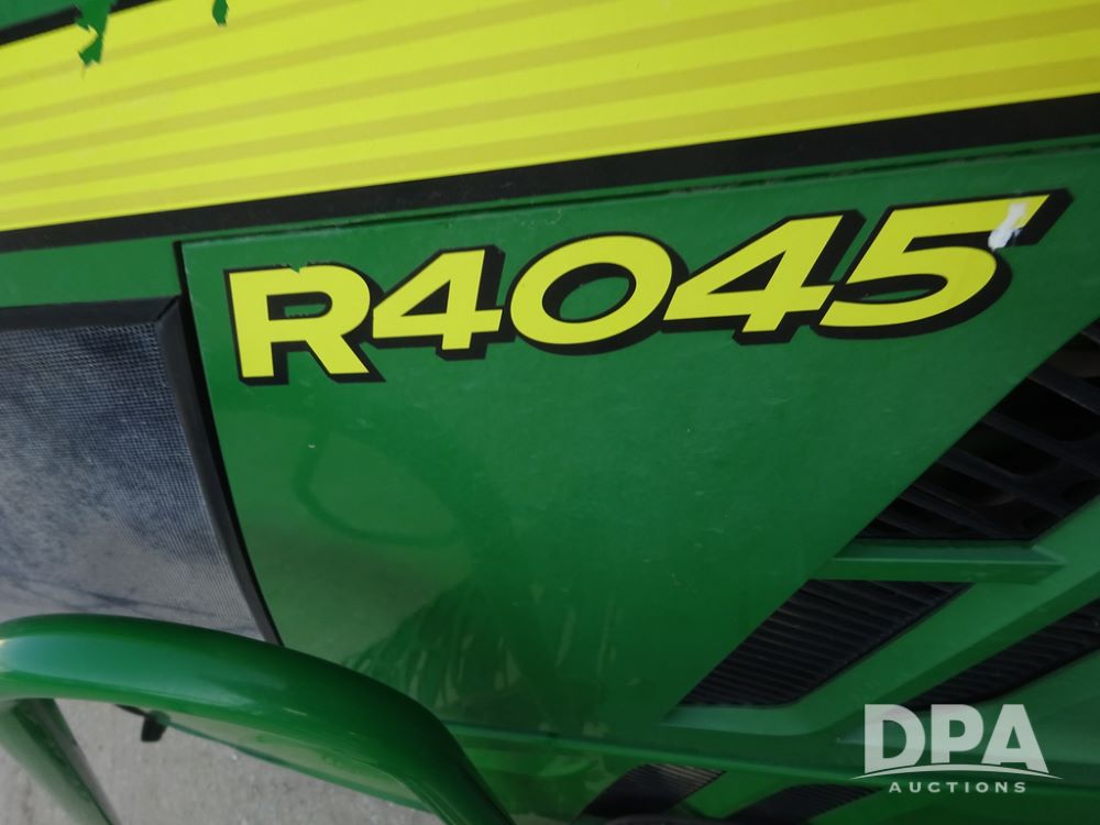 2019 John Deere R4045 Sprayer (PZ14412, Unit 1049), John Deere diesel engine (S/N RG6090U068074), hydrostatic transmission, air conditioning, heat, Am/Fm radio, leather seat, buddy seat, beacon light, 1200 gallon stainless steel liquid system, 120' boom, top poly rinse tank, 4 - 50 gallon poly injection tanks, 2 - Raven Sidekick Pro pumps, automatic solution control, Vogelsang front fill system, Mitas VF750/60R46 flotation tires and fenders, John Deere StarFire 6000 globe, shows 5,436 hours.