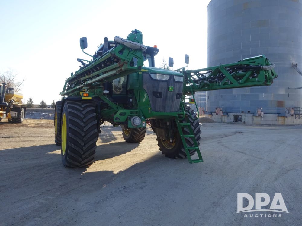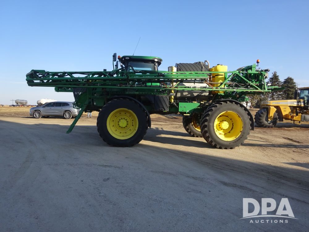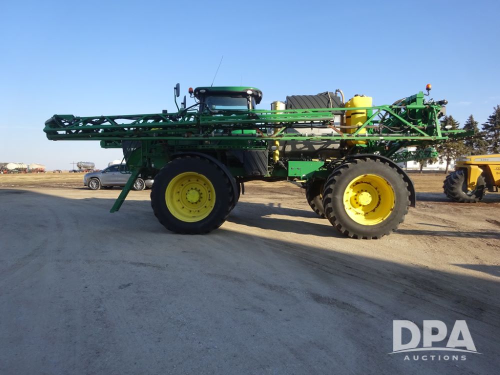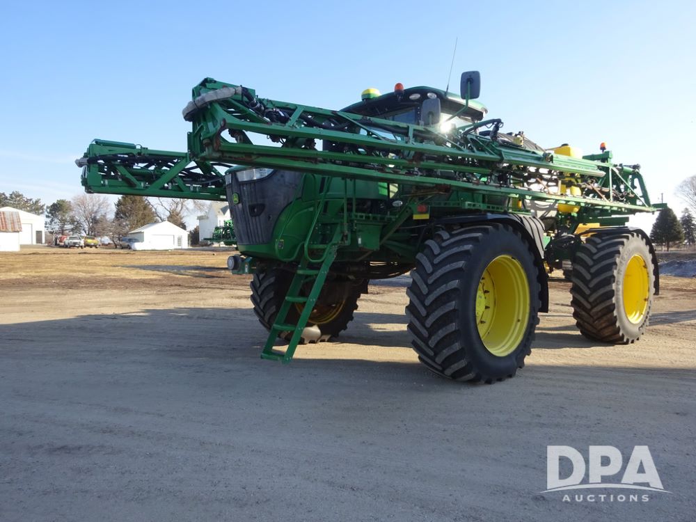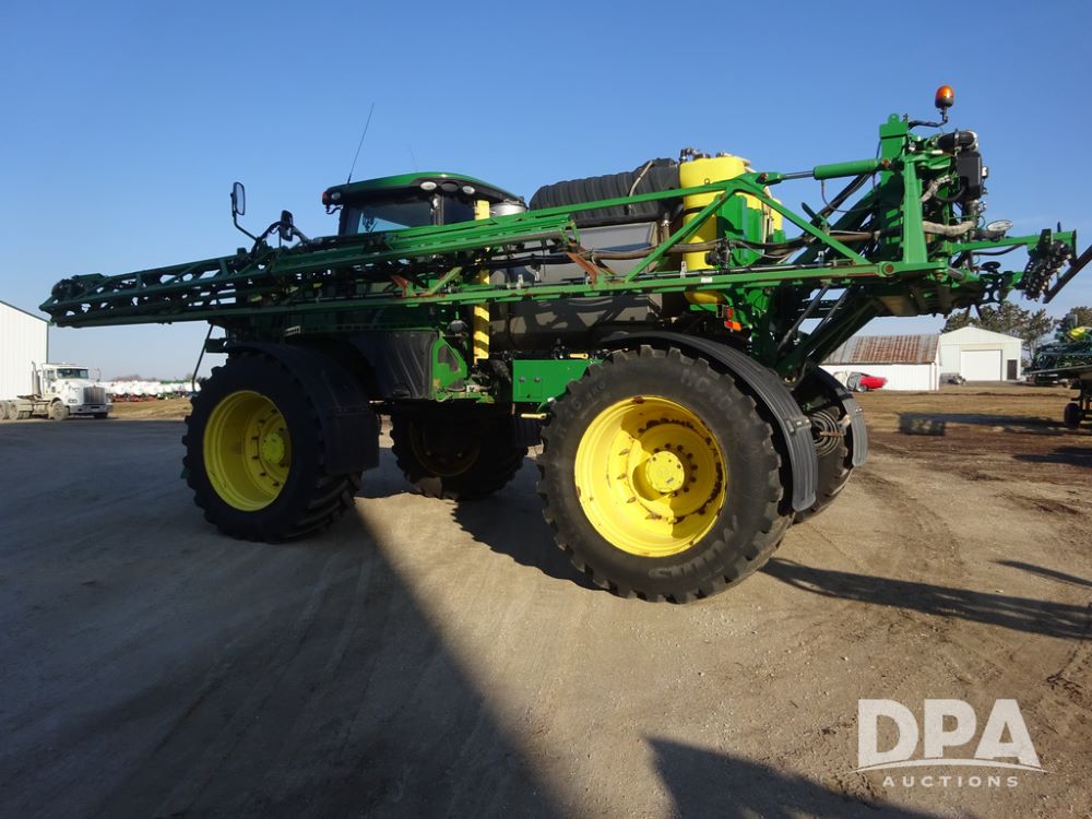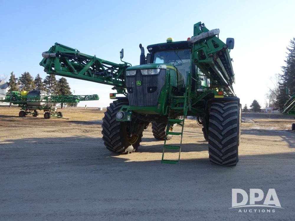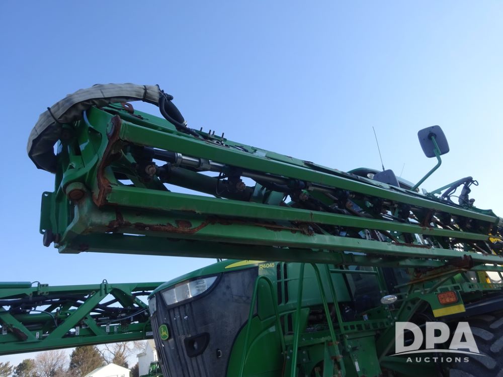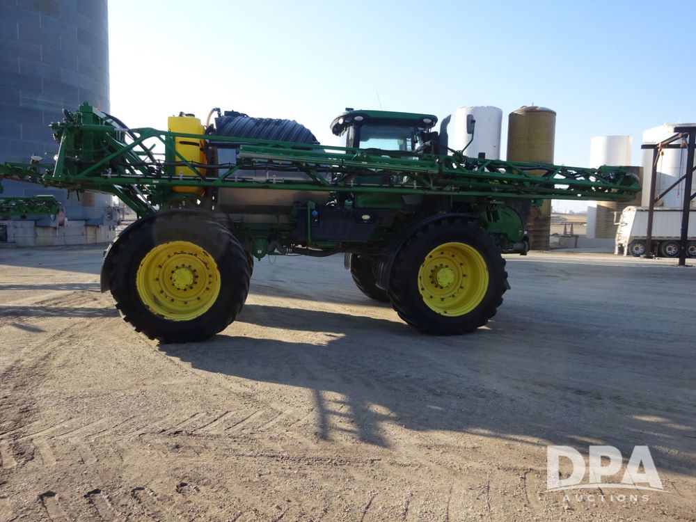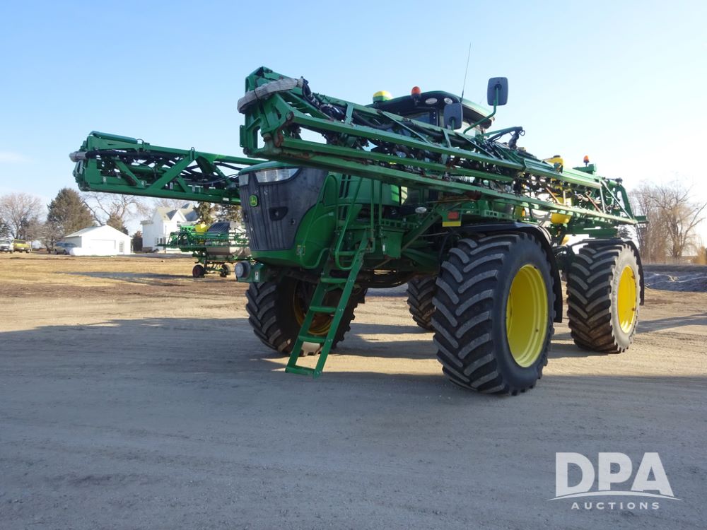 2019 John Deere R4045 Sprayer (PZ14412, Unit 1049), John Deere diesel engine (S/N RG6090U068074), hydrostatic transmission, air conditioning, heat, Am/Fm radio, leather seat, buddy seat, beacon light, 1200 gallon stainless steel liquid system, 120' boom, top poly rinse tank, 4 - 50 gallon poly injection tanks, 2 - Raven Sidekick Pro pumps, automatic solution control, Vogelsang front fill system, Mitas VF750/60R46 flotation tires and fenders, John Deere StarFire 6000 globe, shows 5,436 hours.