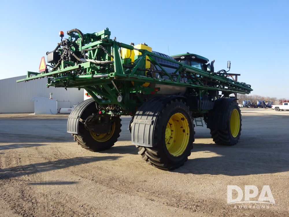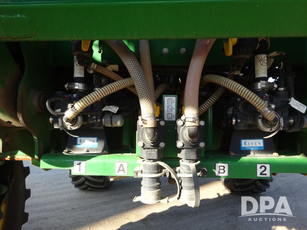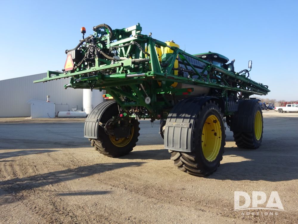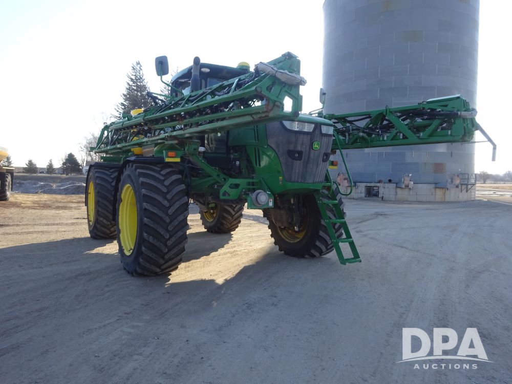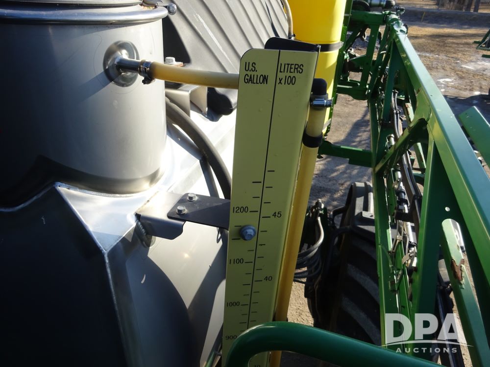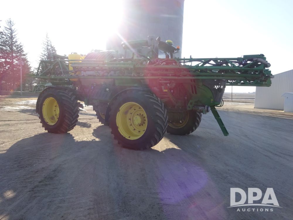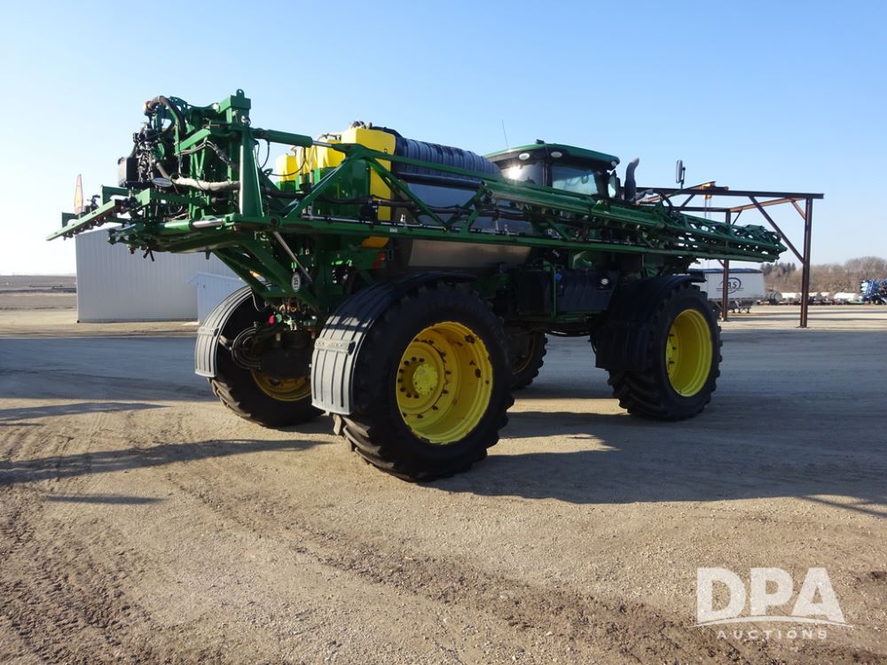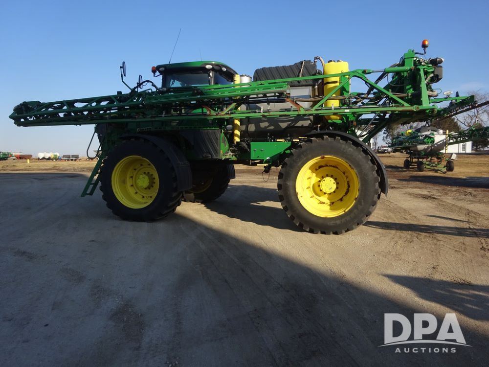 2019 John Deere R4045 Sprayer (PZ14412, Unit 1049), John Deere diesel engine (S/N RG6090U068074), hydrostatic transmission, air conditioning, heat, Am/Fm radio, leather seat, buddy seat, beacon light, 1200 gallon stainless steel liquid system, 120' boom, top poly rinse tank, 4 - 50 gallon poly injection tanks, 2 - Raven Sidekick Pro pumps, automatic solution control, Vogelsang front fill system, Mitas VF750/60R46 flotation tires and fenders, John Deere StarFire 6000 globe, shows 5,436 hours.