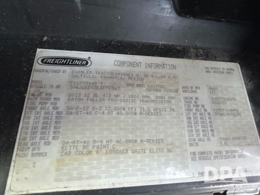 2014 Freightliner Cascadia Truck (PZ14425, Unit 125316), Detroit DD13 12.8L diesel engine, Eaton Fuller 10 speed transmission, air conditioning, heat, Am/Fm radio, cruise control, engine brake, power windows, tandem axle, full screw, air ride suspension, 284" wheel base, shows 940,709 miles.