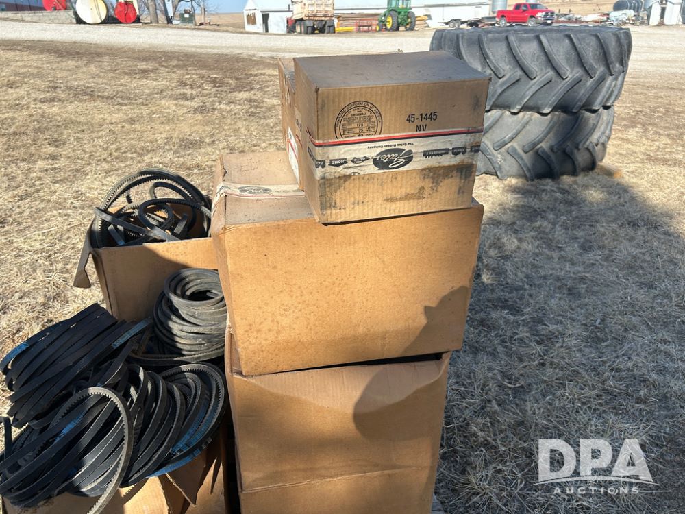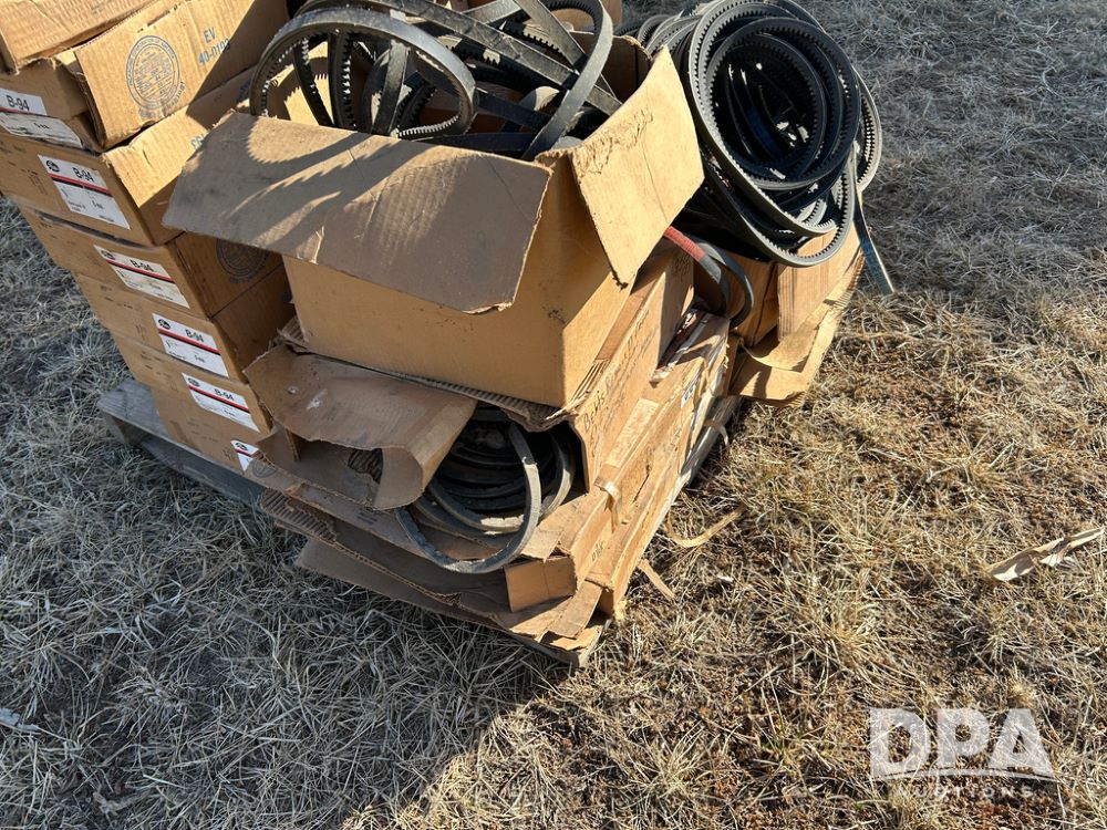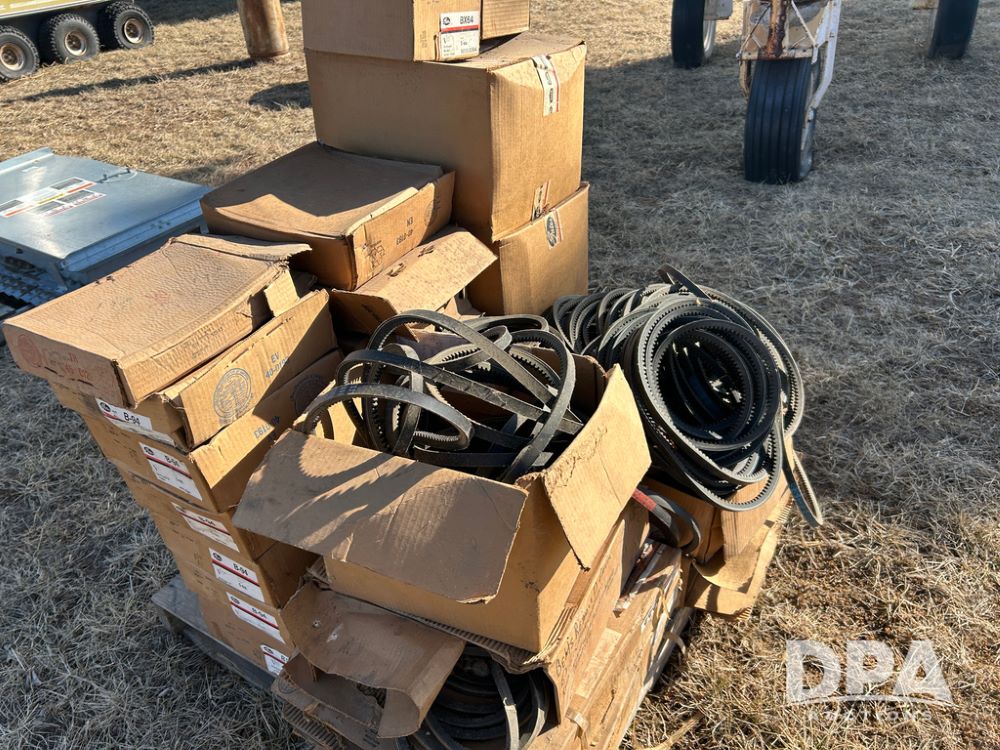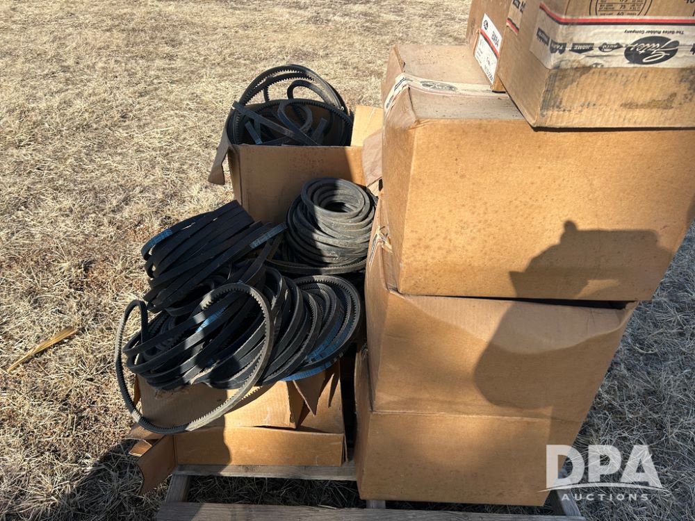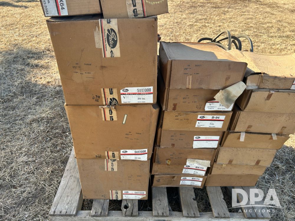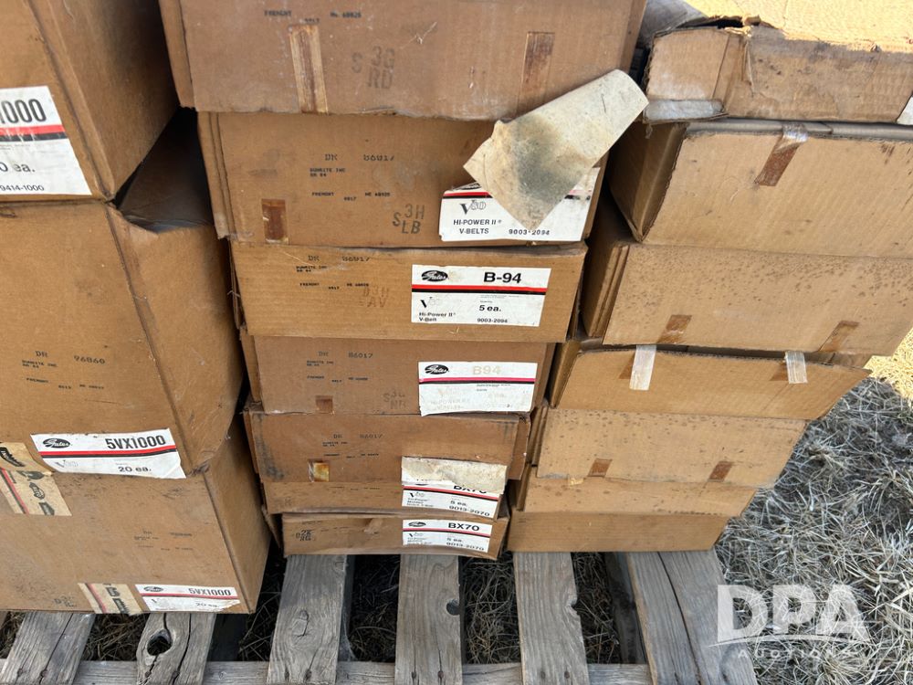 Pallet of New Grain Belts (CP1629), pallet of boxes with new grain belts including Super HC, High Power II V belts, Tri-Power molded notch v-belts.
