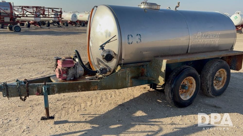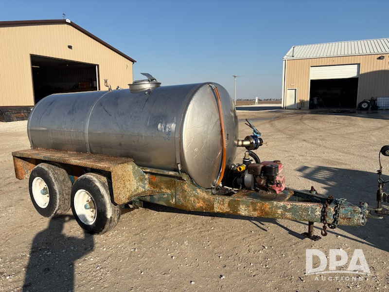 Stainless Steel Liquid Nurse Trailer (MN1223, Unit C-3), 1,000 gallon stainless steel liquid nurse tank, gas engine, bad pump, tandem axle gear, 11L-15 flotation tires.