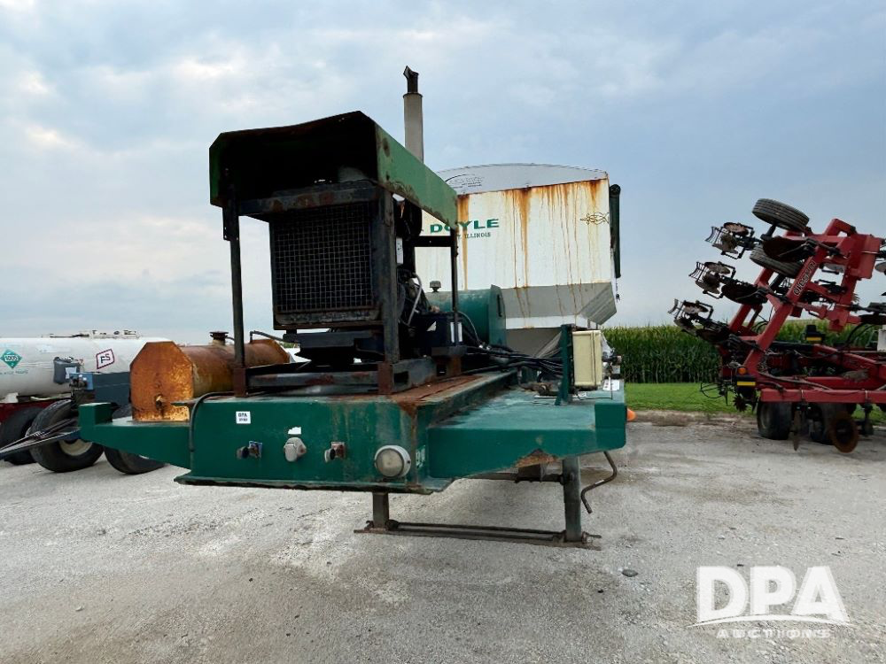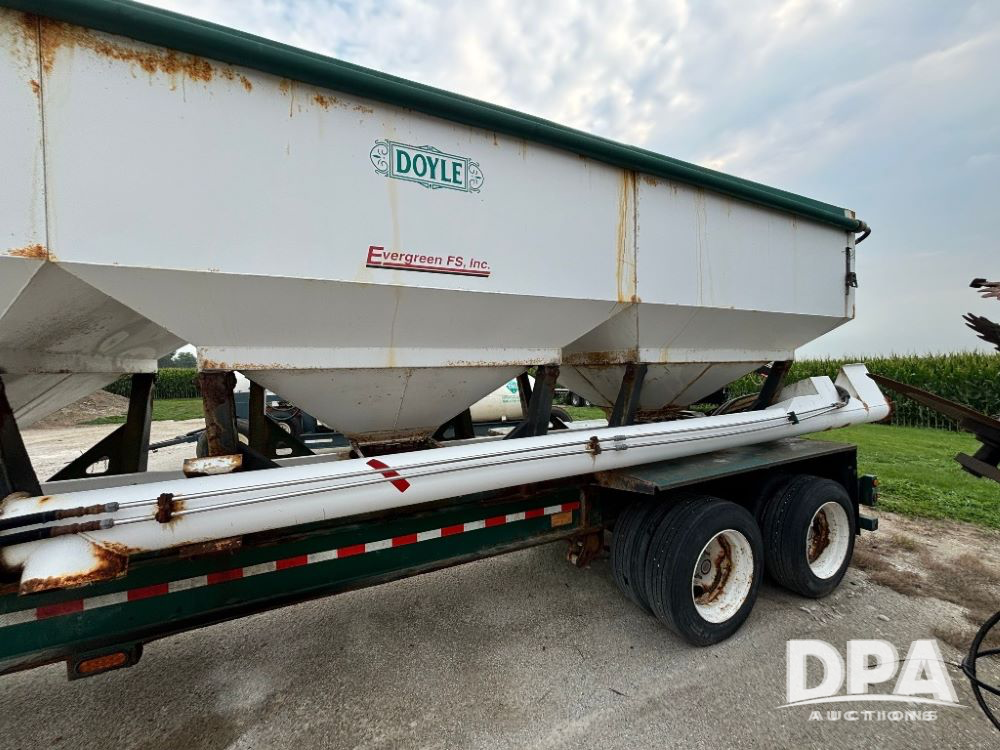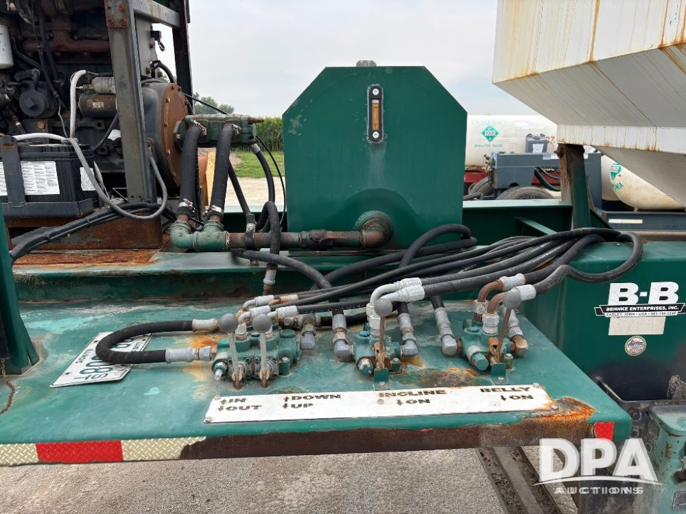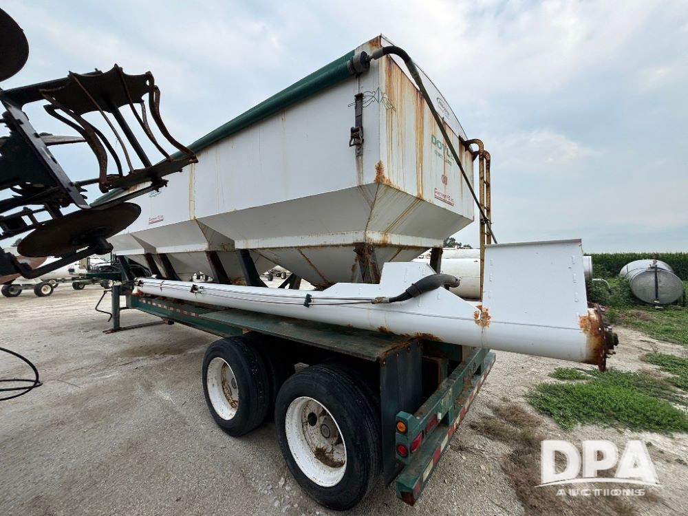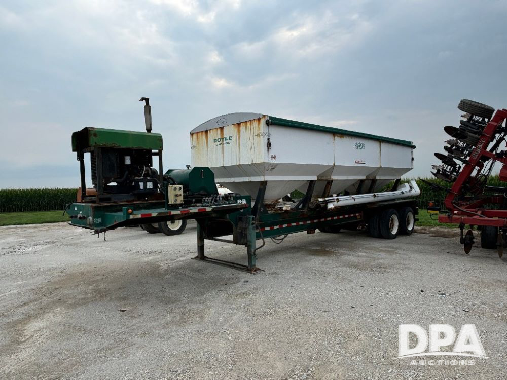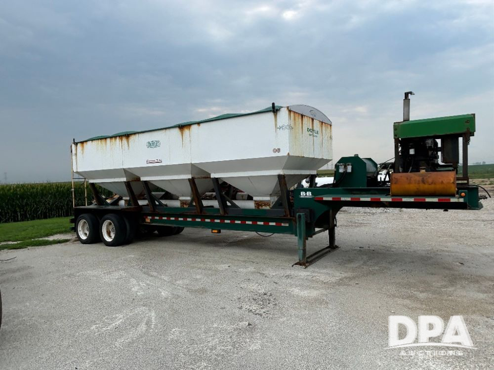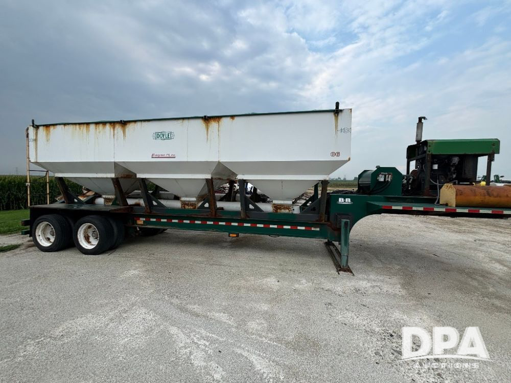 N2009 B & B Dry Tender Trailer (LLD1674), Doyle dry tender box, 24 ton, 3 hopper, side discharge auger, John Deere self contained diesel engine S/N:PE4024T183532, manual tarp, tandem axle, 255/70R22.5 tires.
