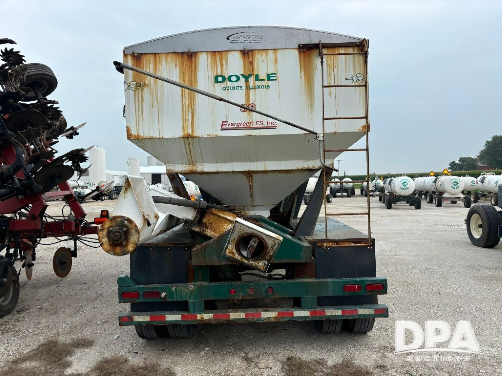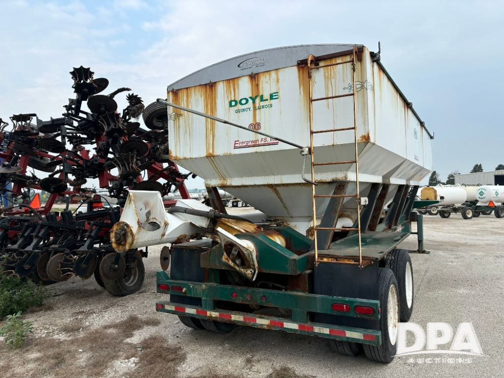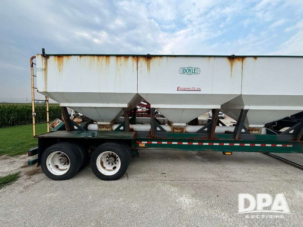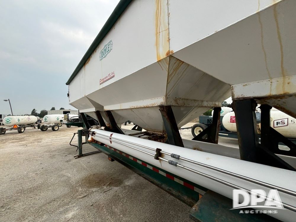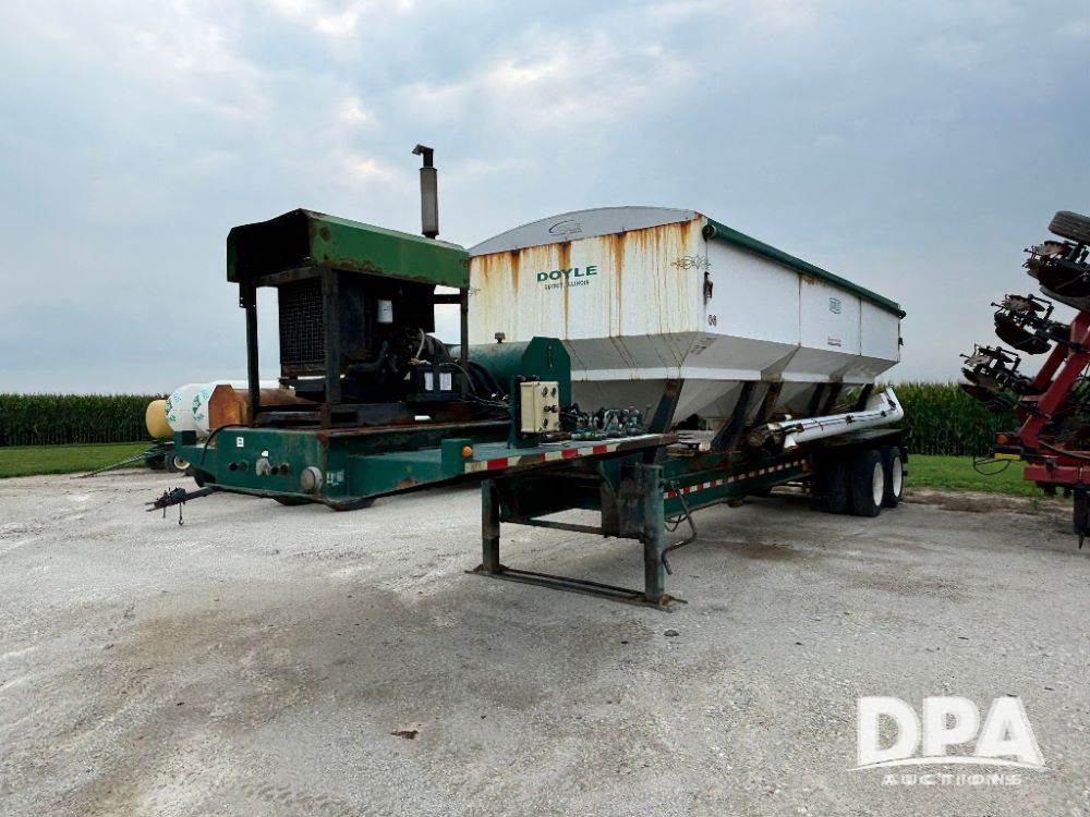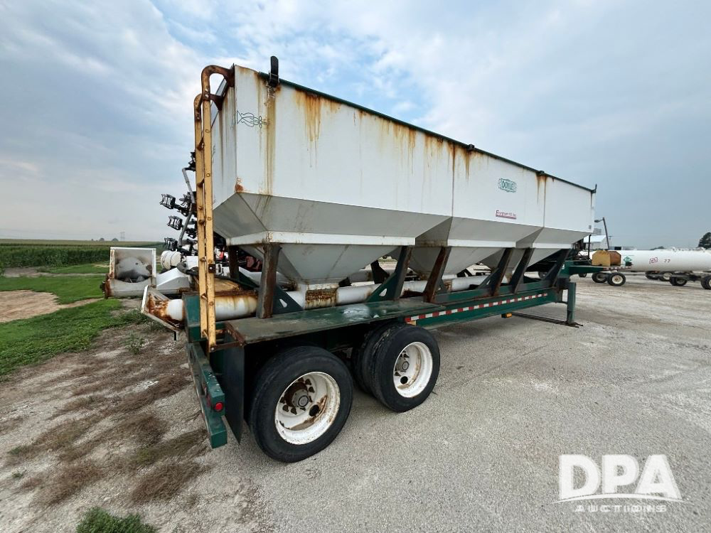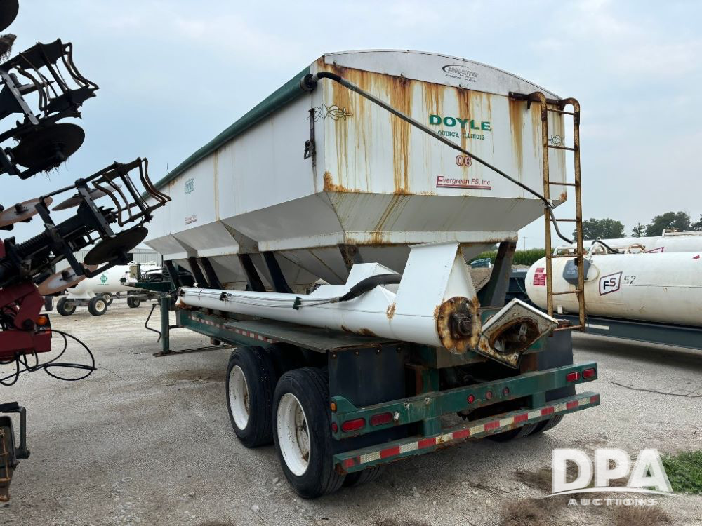 N2009 B & B Dry Tender Trailer (LLD1674), Doyle dry tender box, 24 ton, 3 hopper, side discharge auger, John Deere self contained diesel engine S/N:PE4024T183532, manual tarp, tandem axle, 255/70R22.5 tires.