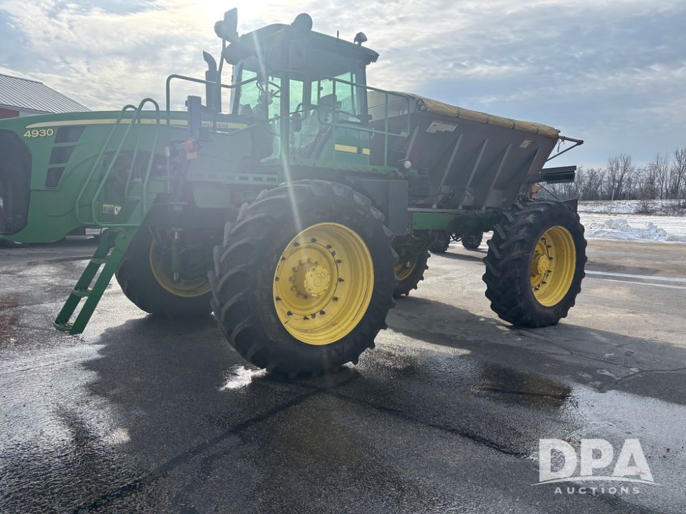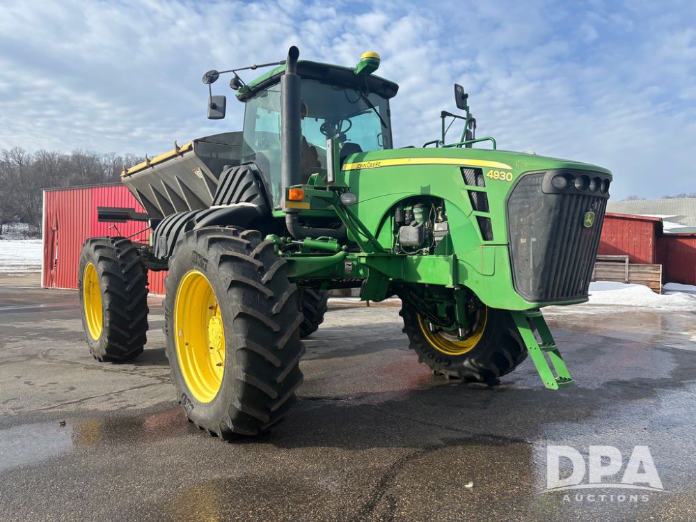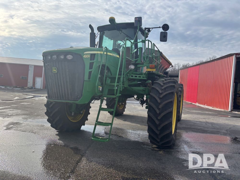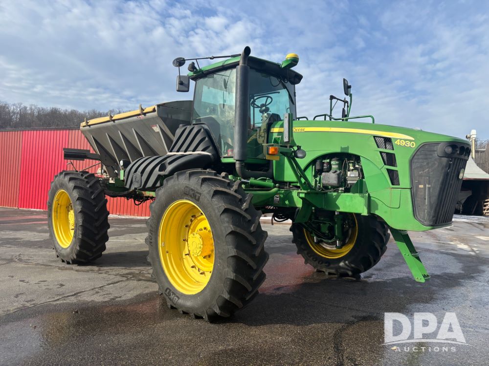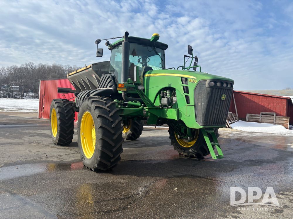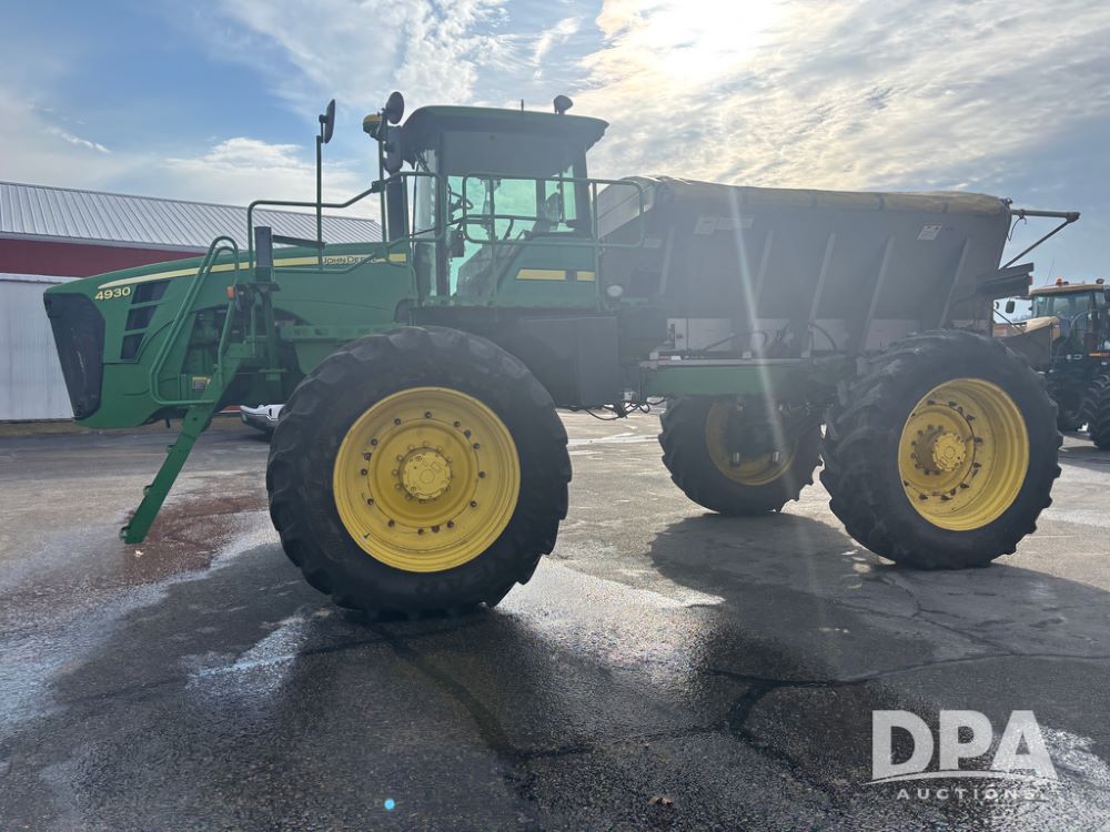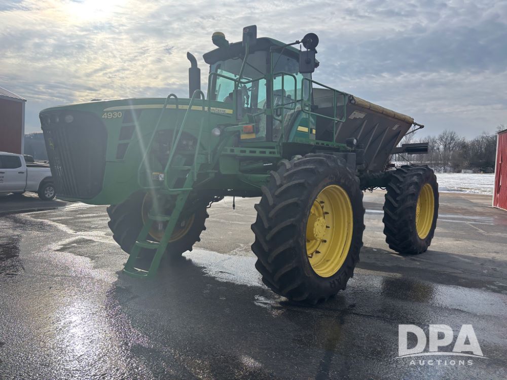 2009 John Deere 4930 Dry Machine (D13196), diesel engine, hydrostatic drive, New Leader L3020 G4 stainless steel hydraulic dry spinner box, belt/chain, roll over tarp, StarFire 3000 receiver, John Deere 2630 display, Am/FM CD radio, cab heat/air conditioning, both sets of tires, 620/70R46 float tires and 380/105R50 row crop tires, shows 3,856 hours.