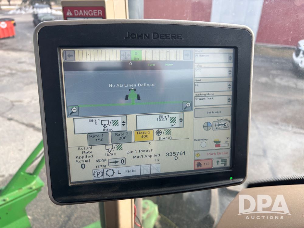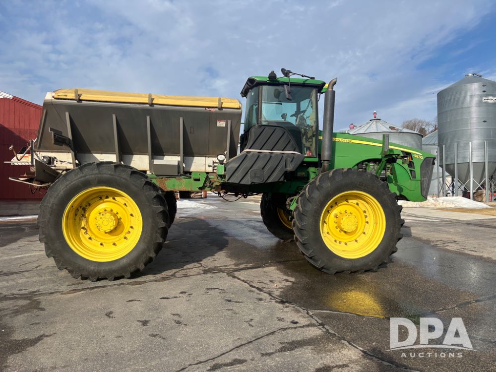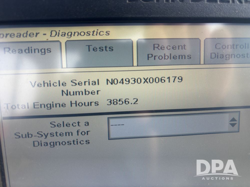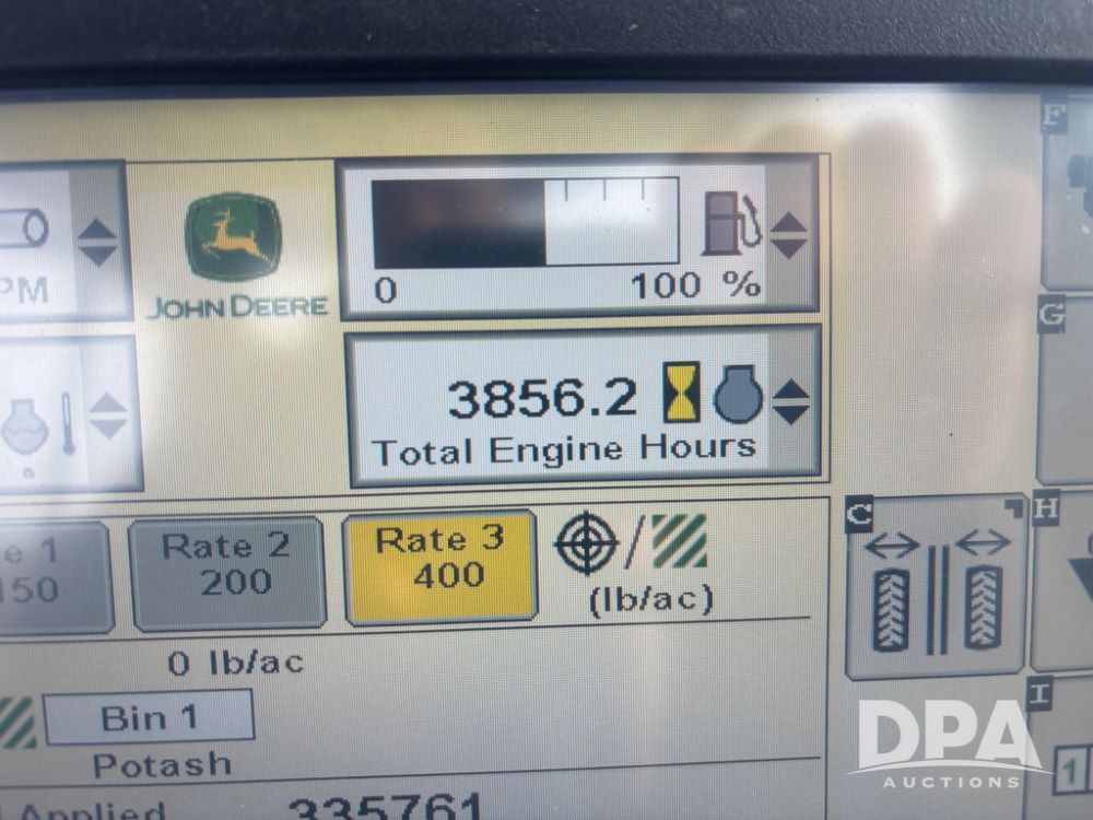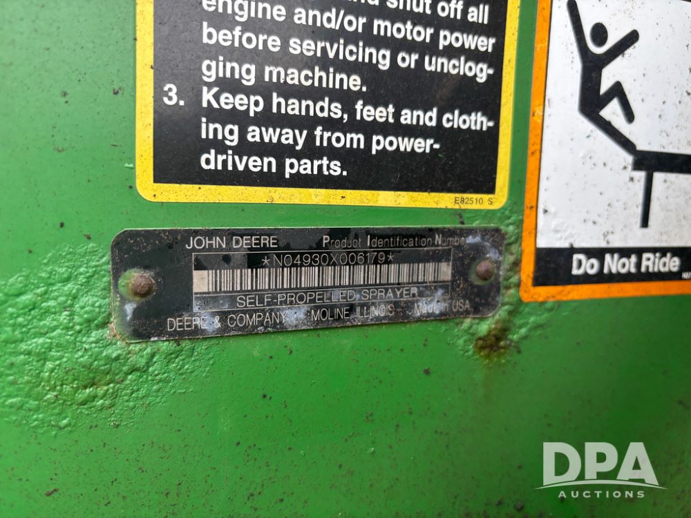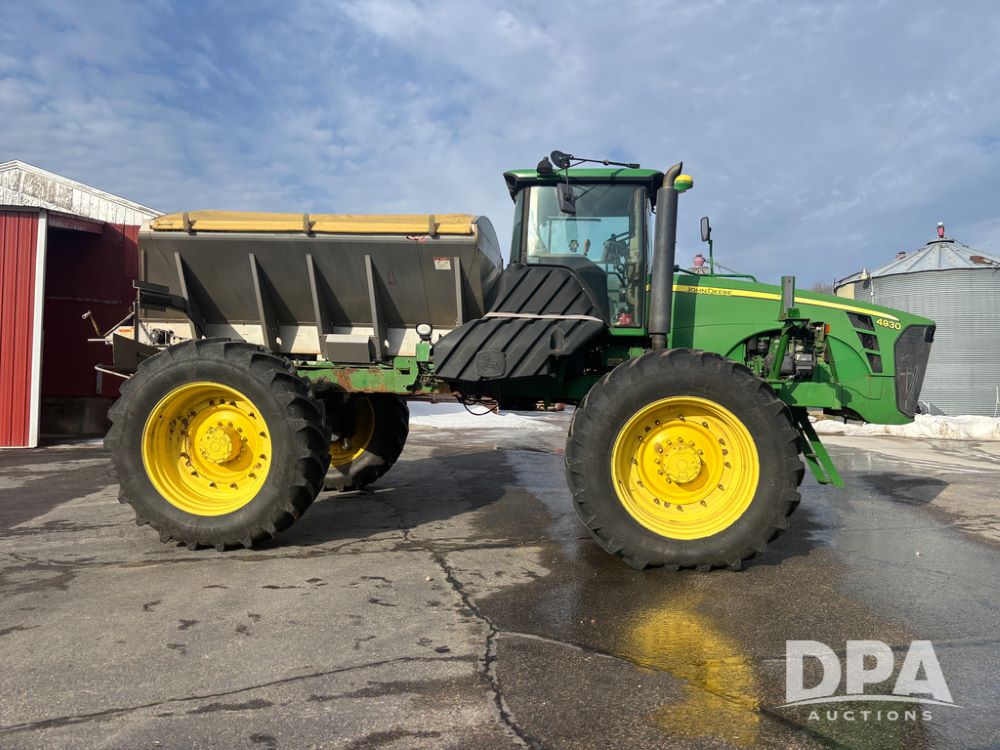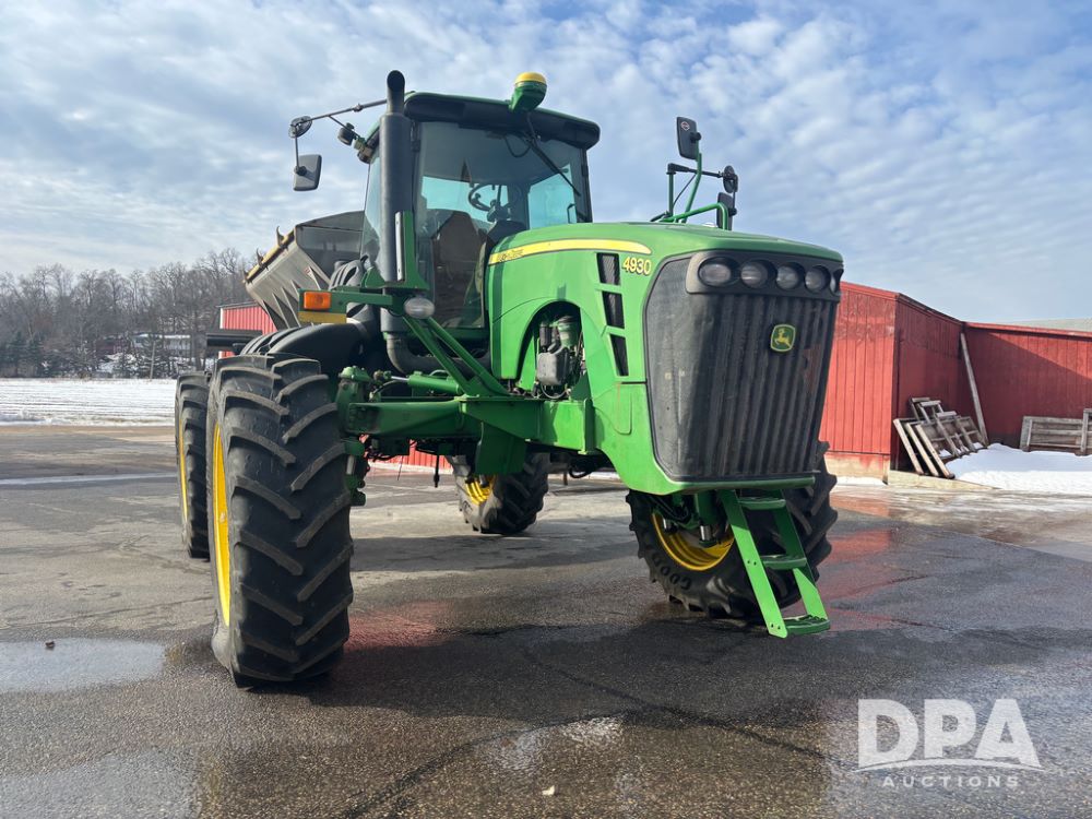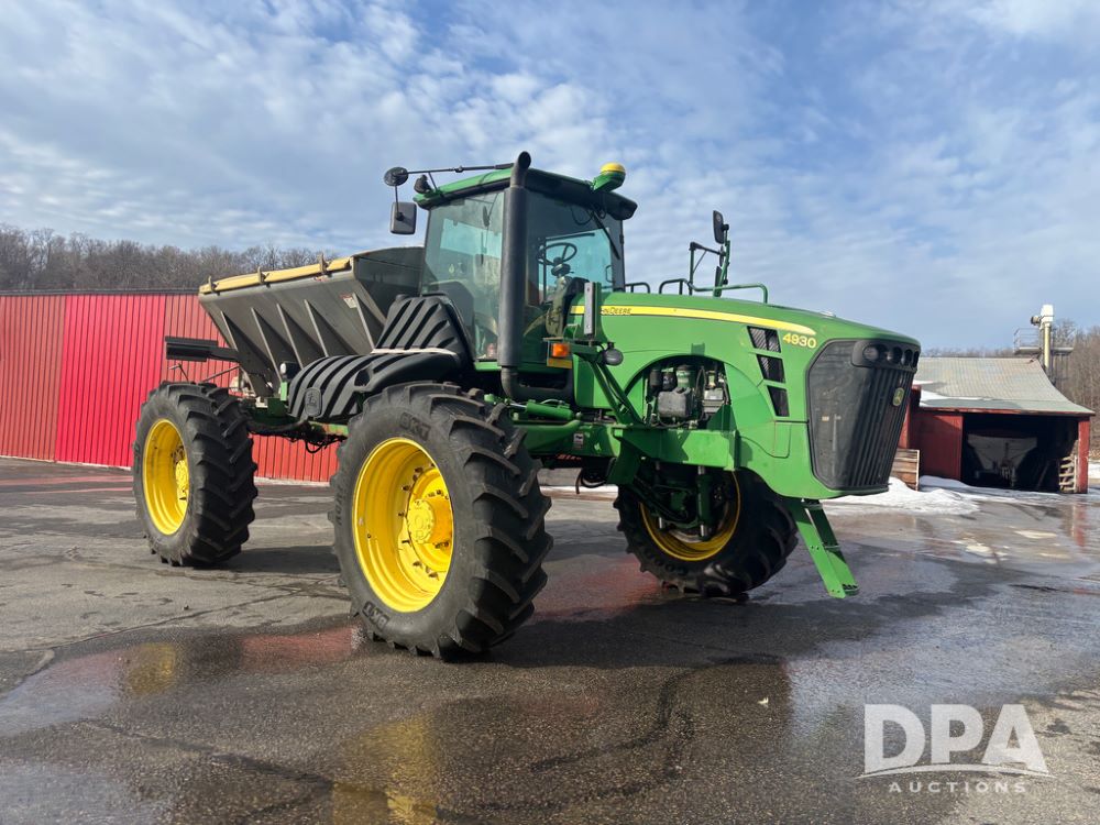 2009 John Deere 4930 Dry Machine (D13196), diesel engine, hydrostatic drive, New Leader L3020 G4 stainless steel hydraulic dry spinner box, belt/chain, roll over tarp, StarFire 3000 receiver, John Deere 2630 display, Am/FM CD radio, cab heat/air conditioning, both sets of tires, 620/70R46 float tires and 380/105R50 row crop tires, shows 3,856 hours.