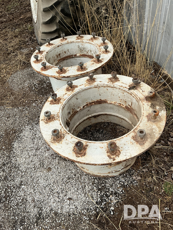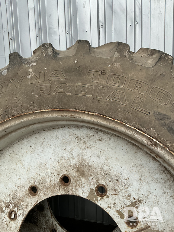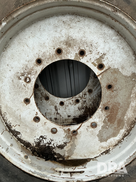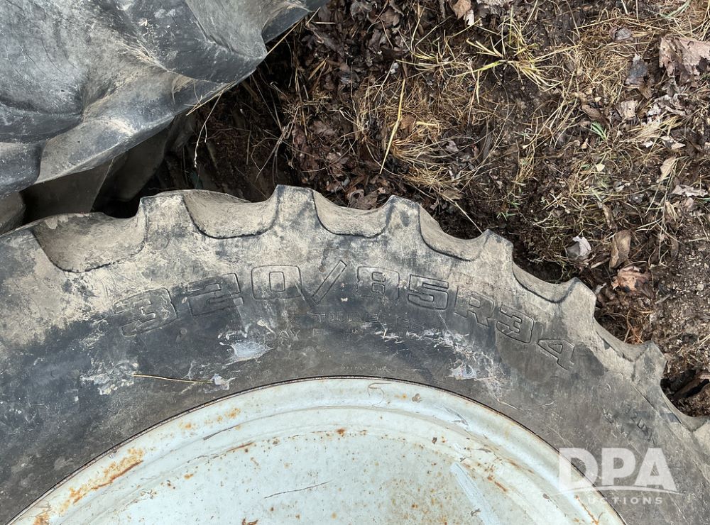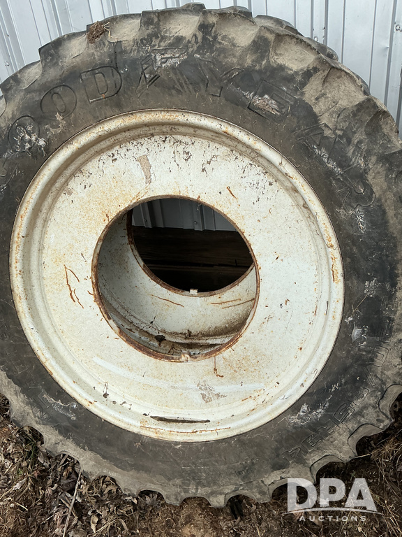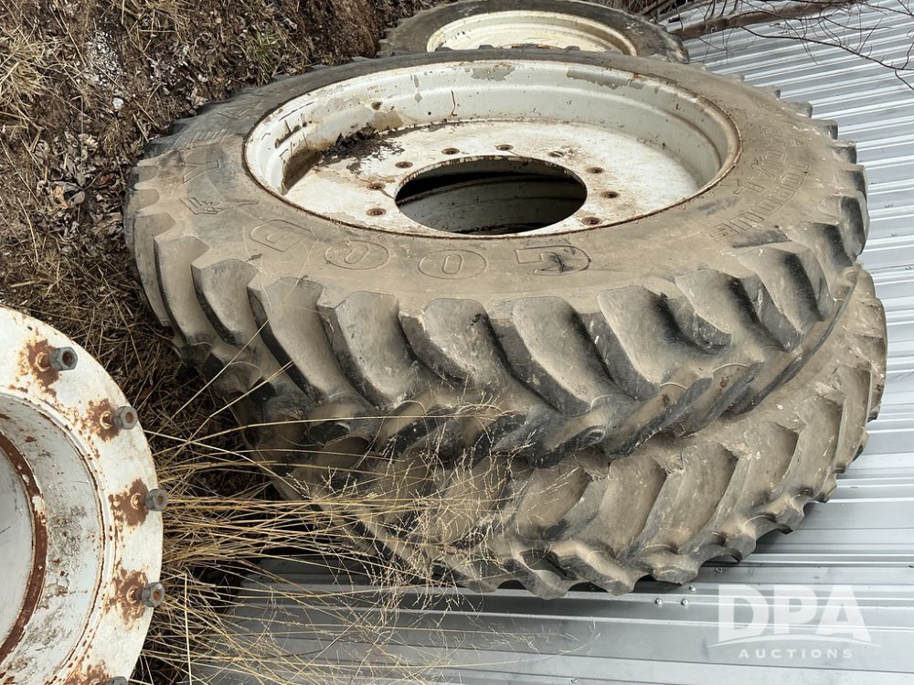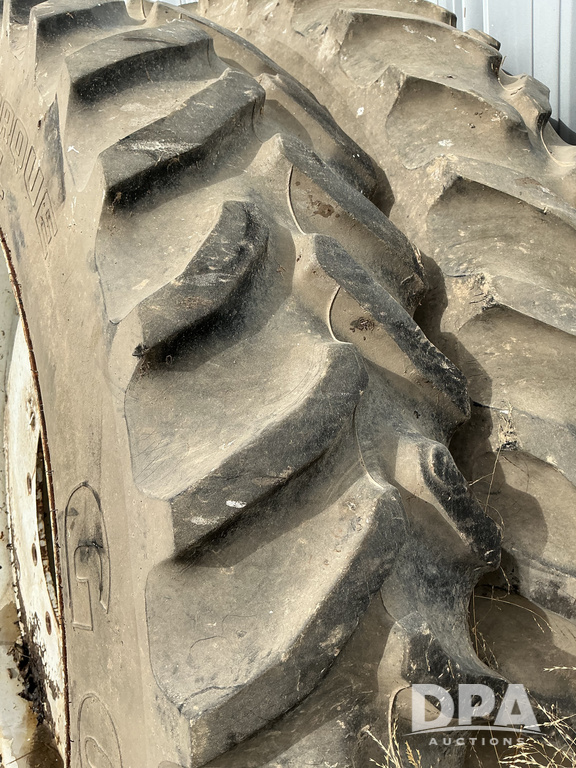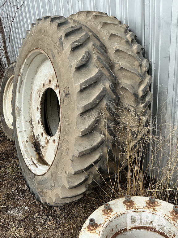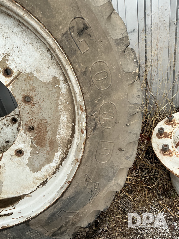(4) Goodyear Row Crop Truck Tires and Rims (MN1231), row crop tires for sprayer or fertilizer trucks, 2 Goodyear 380/85R46 tires and rims, 2 Goodyear 320/85R34 tires and rims with adapters for spoke wheels.