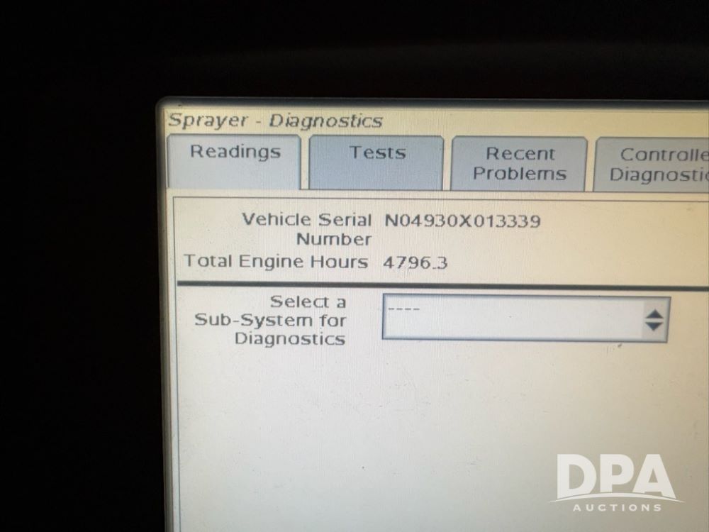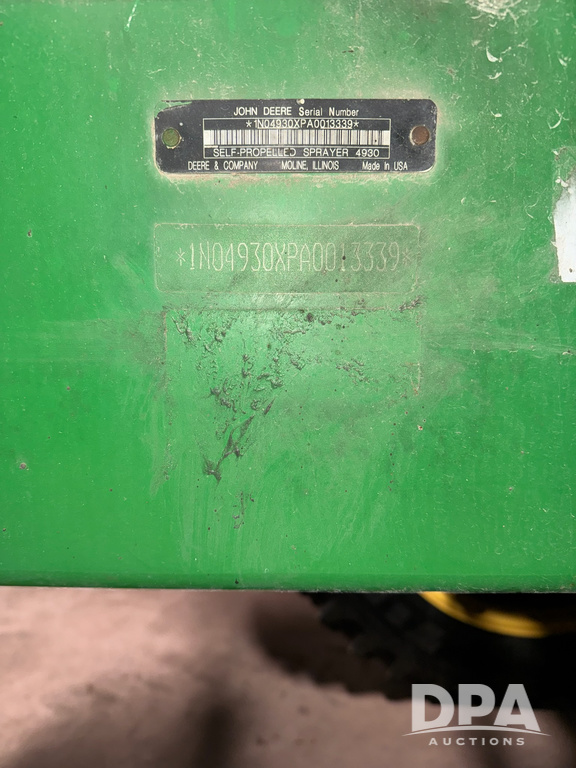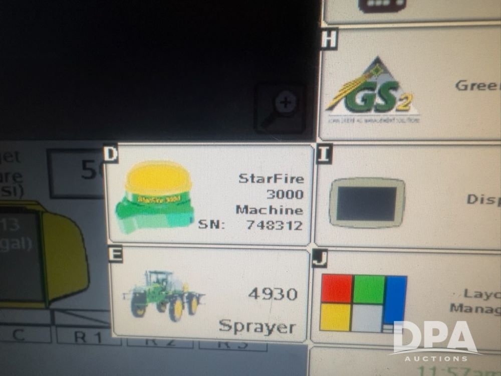2012 John Deere 4930 Sprayer (LLD1668), diesel engine, 120 foot boom, 1,200 gallon stainless steel tank, GPS auto steer, auto boom height, globe, shows 4,796 hours.