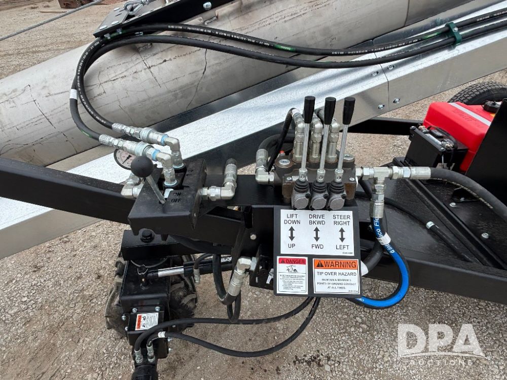 2026 USC FL75M40S00UC Stainless Steel Self-Mover Conveyor (NP6528), NEW, Kohler 20 HP Gas Engine, Gas Powered Hydraulic Pack, 40' Long, 12" 12 Gauge stainless steel Tube, 15" Chevron Belt, Carbon Steel Construction (except for SS tube), 1.5" Dodge bearings, Standard A-Frame Undercarriage, Self-mover with directional control, Collapsible inlet hopper, ST205/75D15 Tires, jack stand.
