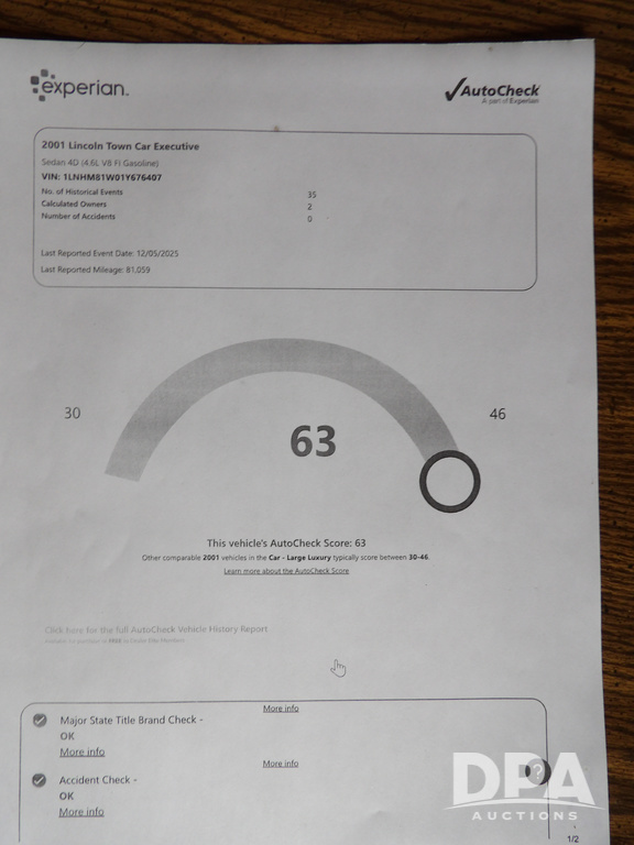 2001 Lincoln Town Car Executive Series (ED5428), 4.6 V8 gas engine, automatic transmission, air conditioning, heat, leather Interior, power windows and locks, 8-way power seat, power heated mirrors, tilt/cruise control, height adjustable pedals, traction control, 3.08 gear ratio, aluminum wheels, Kelly 225 60/16 tires, shows 81,094 original miles.