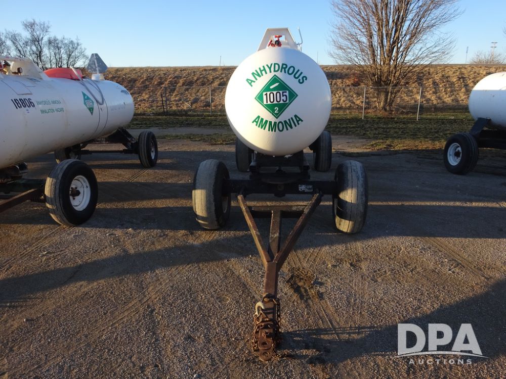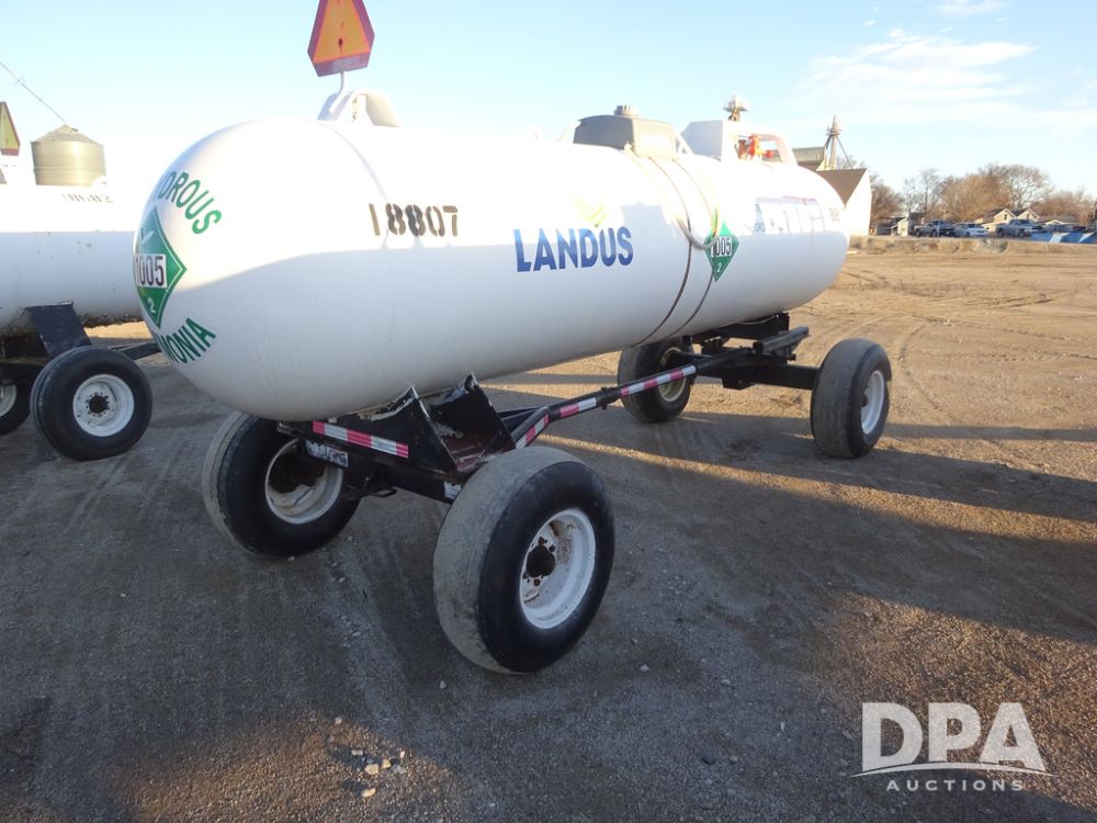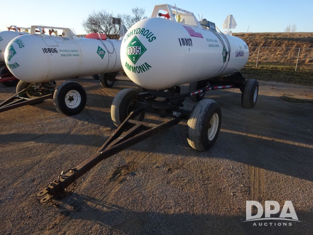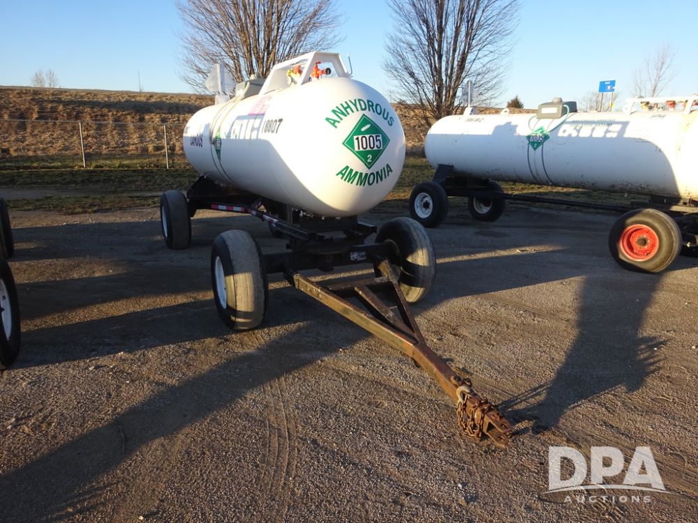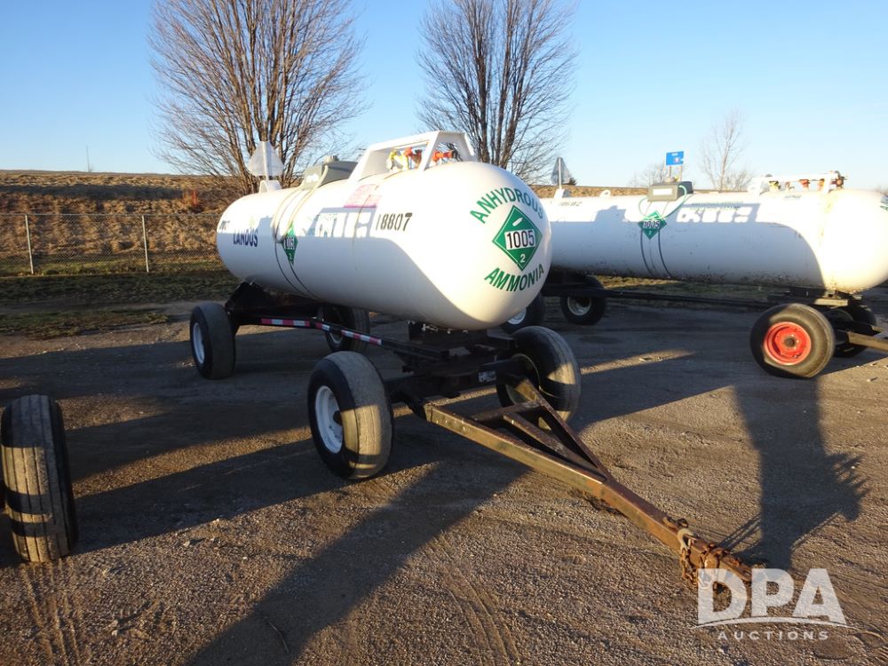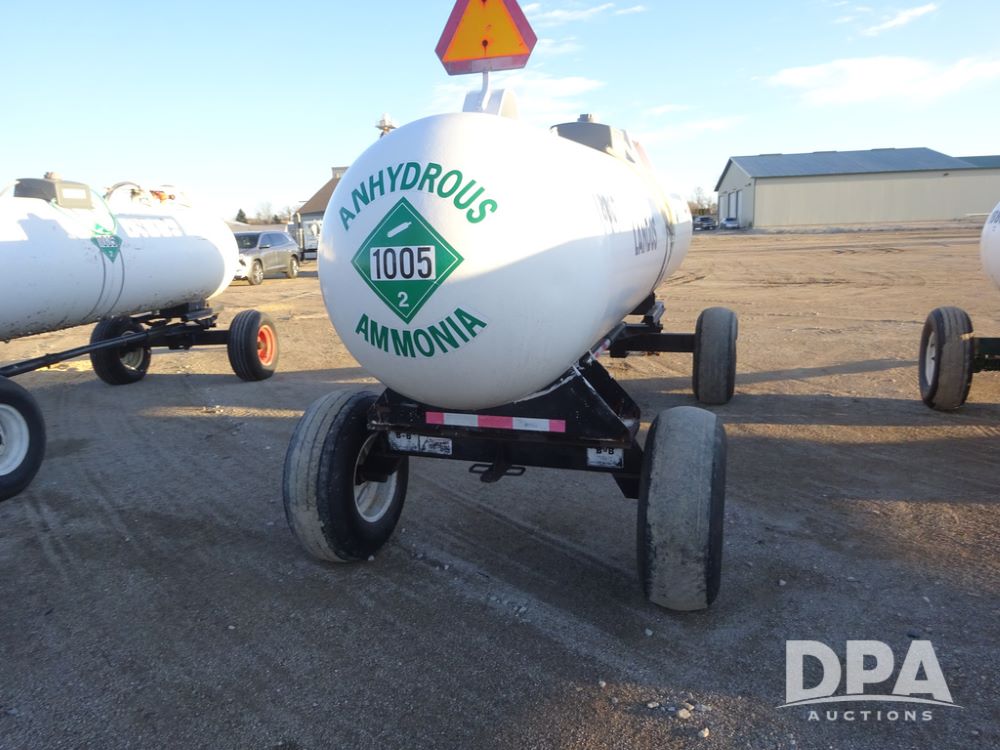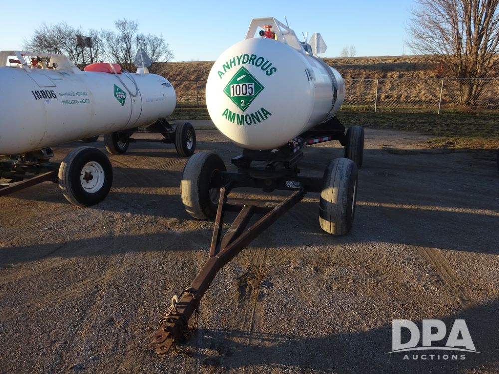 NH3 Nurse Tank (PZ14430, Unit 18807), 1000 gallon NH3 nurse tank, top front fill, poly water tank, data plate, B-B 5th wheel running gear, 12.5L-15 flotation tires.