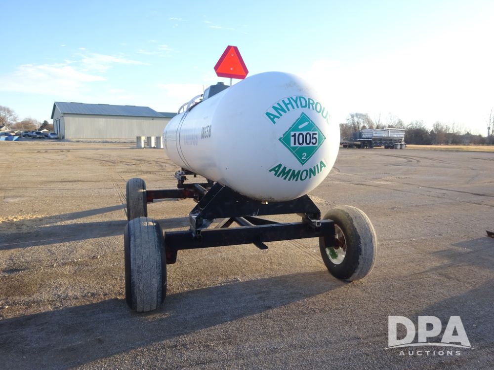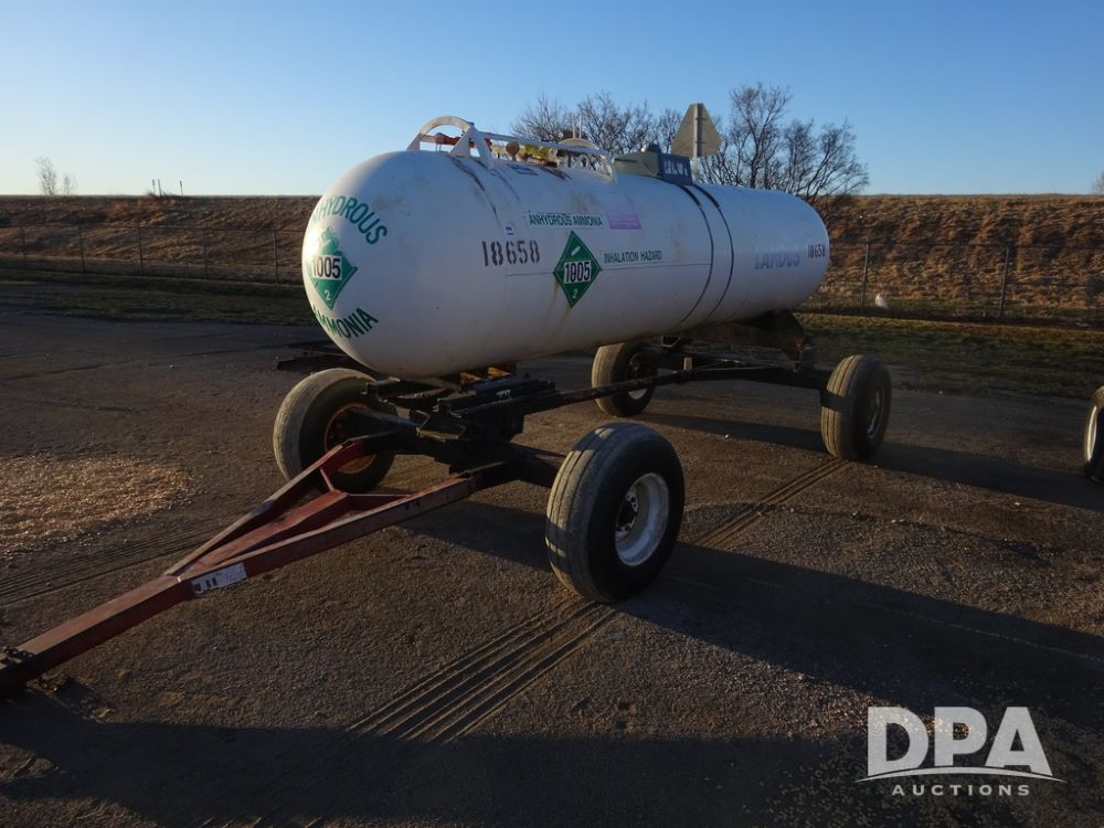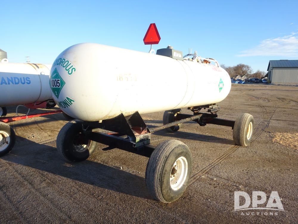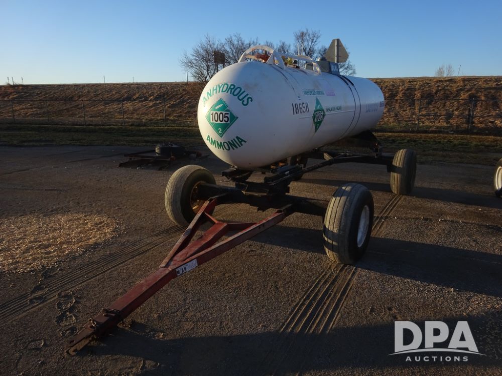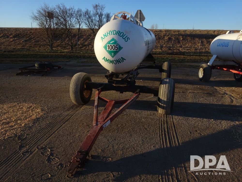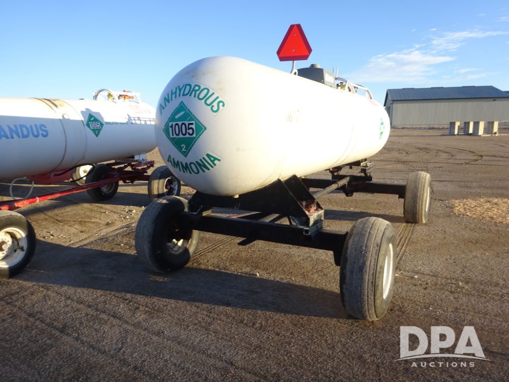 NH3 Nurse Tank (PZ14433, Unit 18658), 1000 gallon NH3 nurse tank, top front fill, poly water tank, data plate, 5th wheel running gear, 12.5L-15 flotation tires.