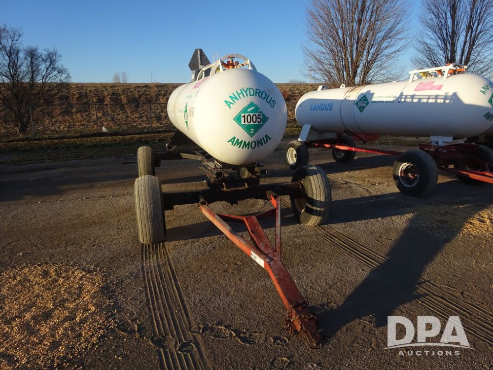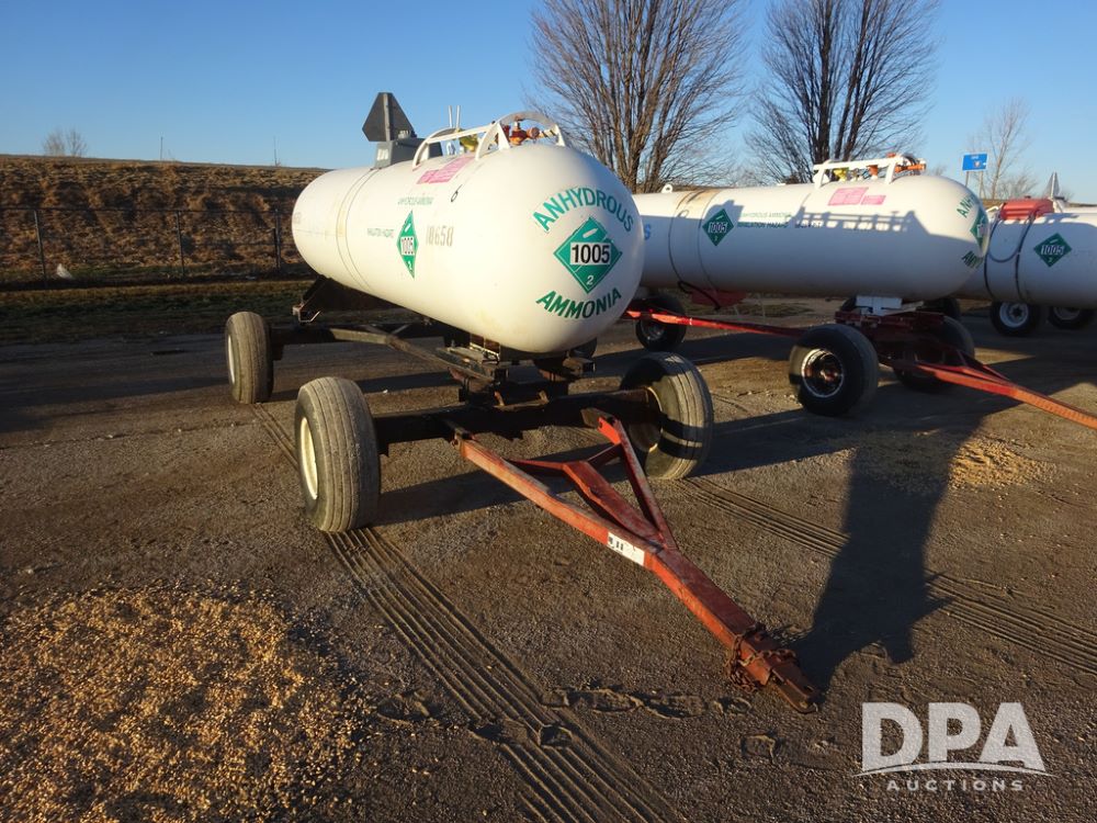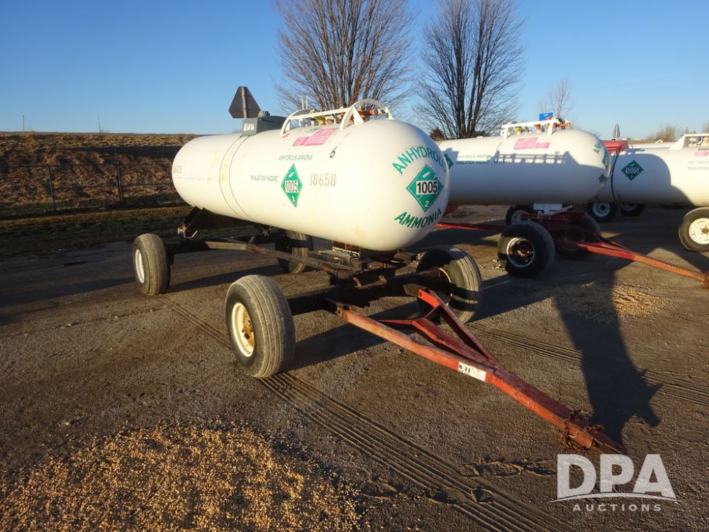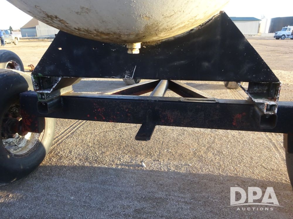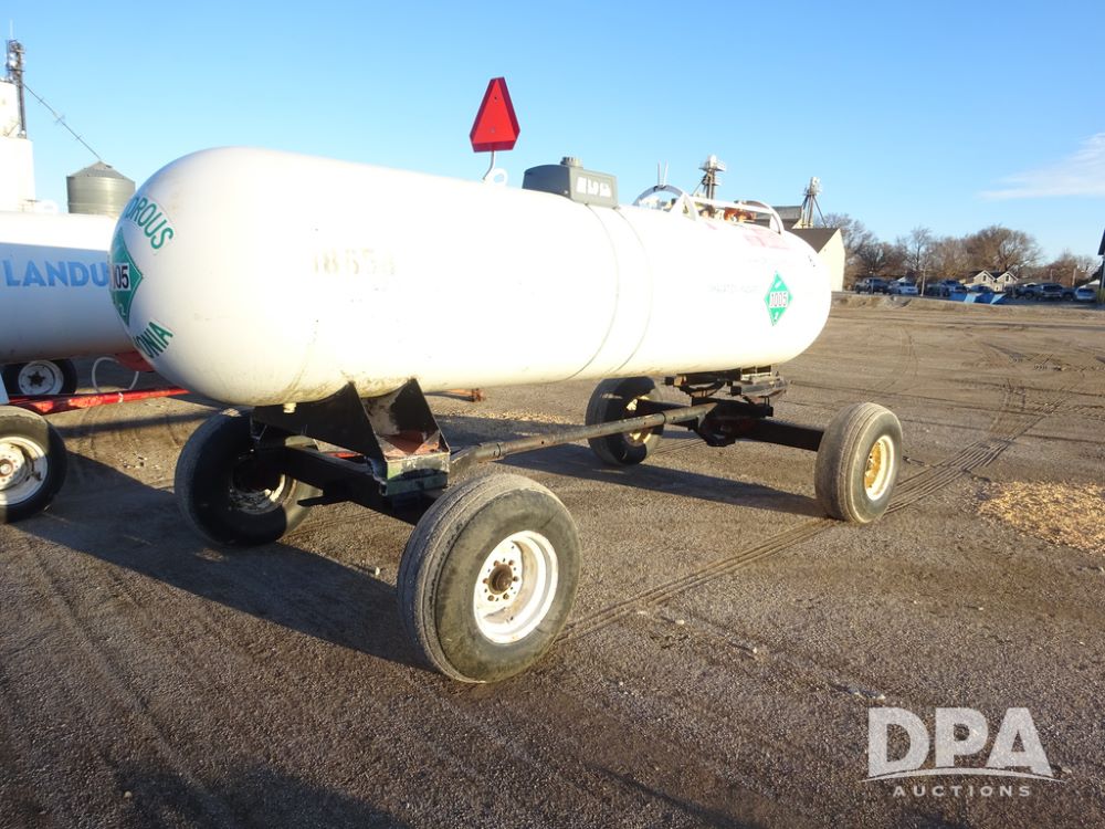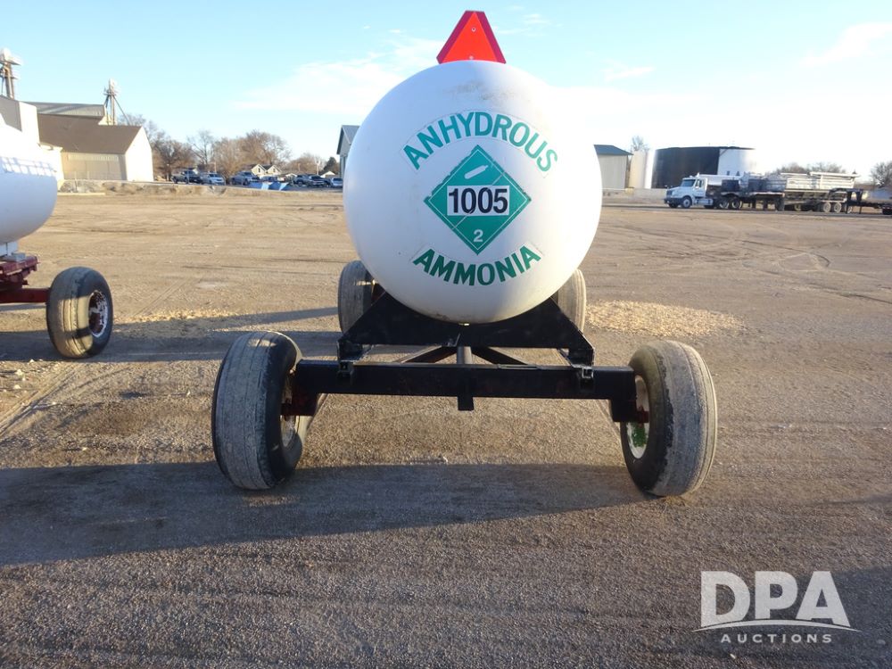 NH3 Nurse Tank (PZ14433, Unit 18658), 1000 gallon NH3 nurse tank, top front fill, poly water tank, data plate, 5th wheel running gear, 12.5L-15 flotation tires.