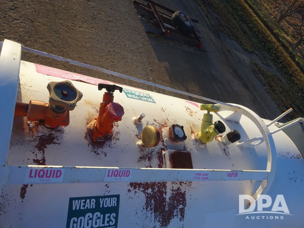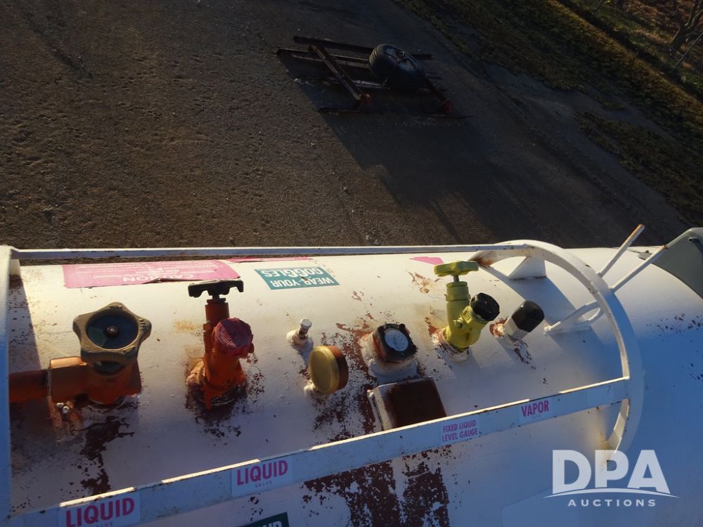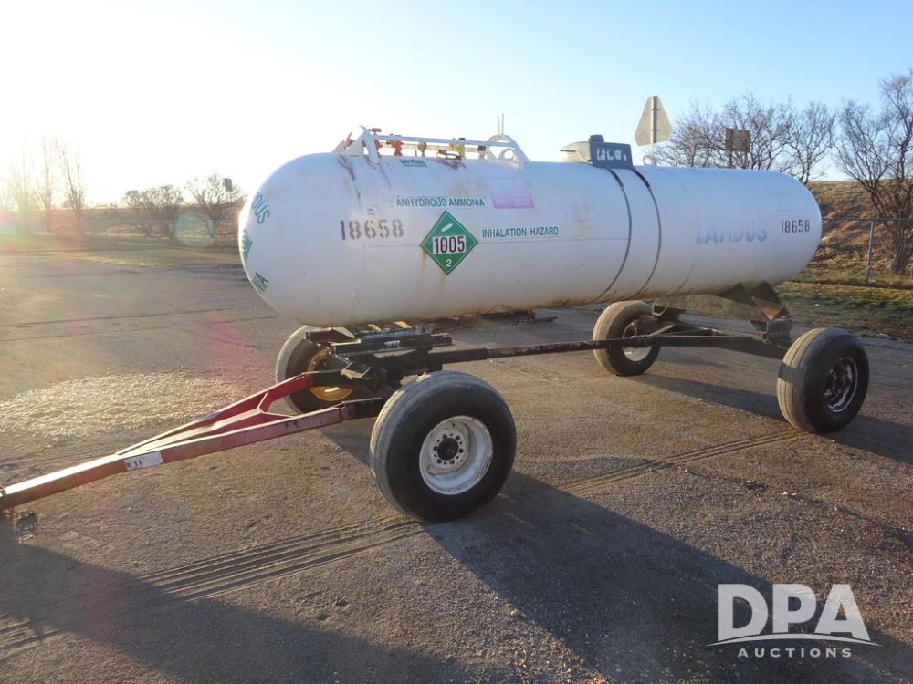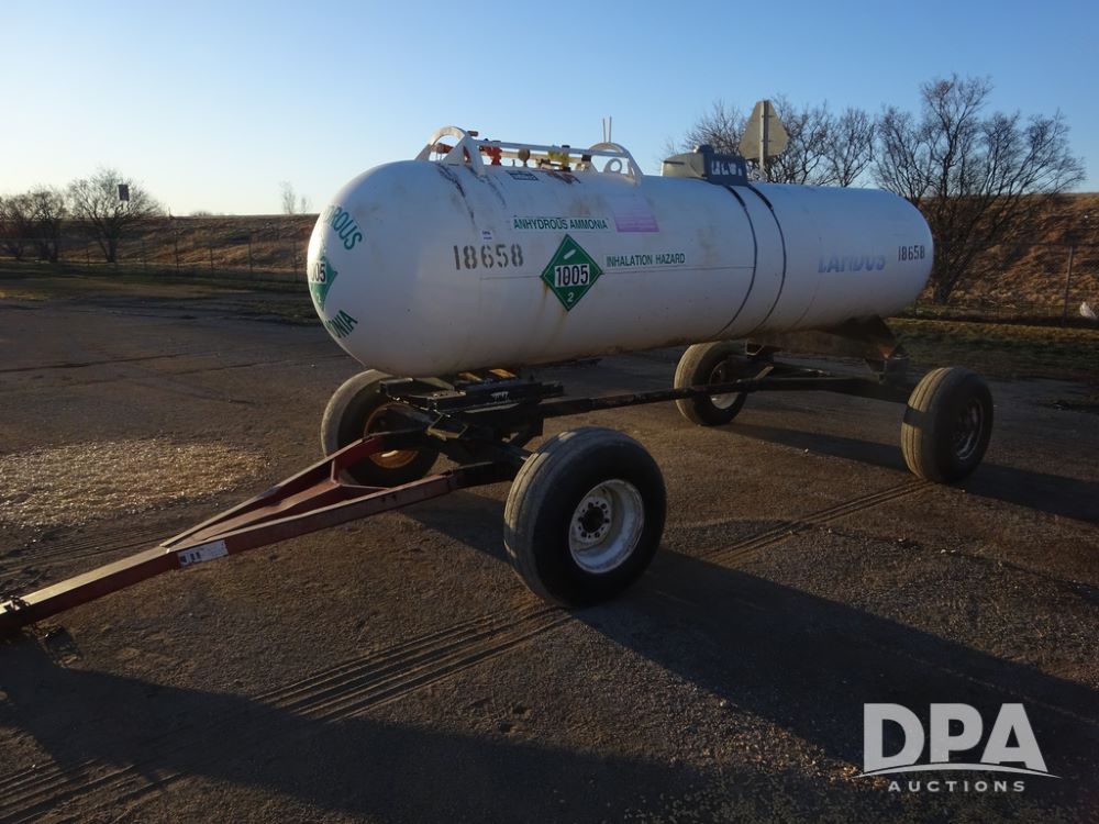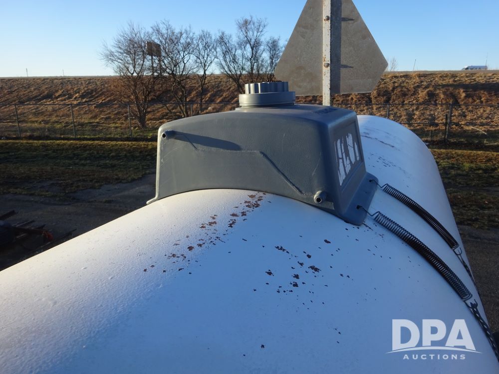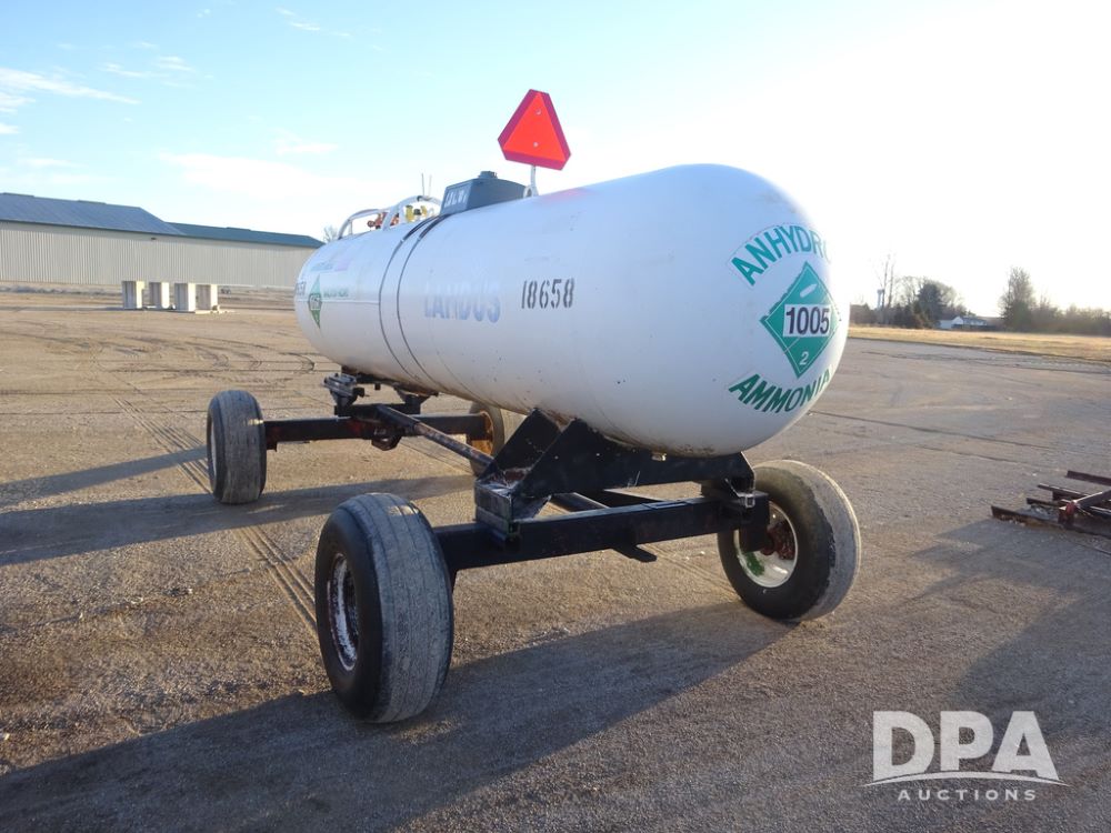 NH3 Nurse Tank (PZ14433, Unit 18658), 1000 gallon NH3 nurse tank, top front fill, poly water tank, data plate, 5th wheel running gear, 12.5L-15 flotation tires.
