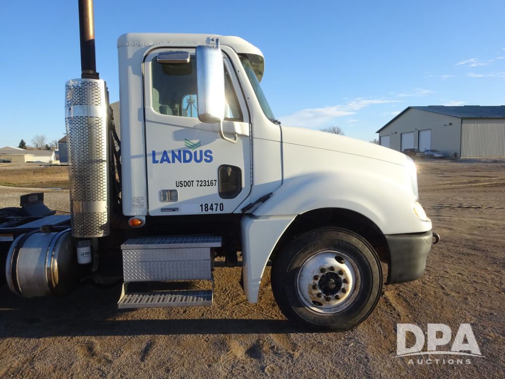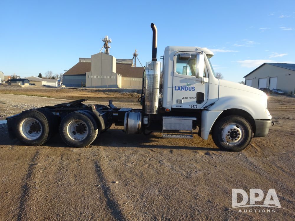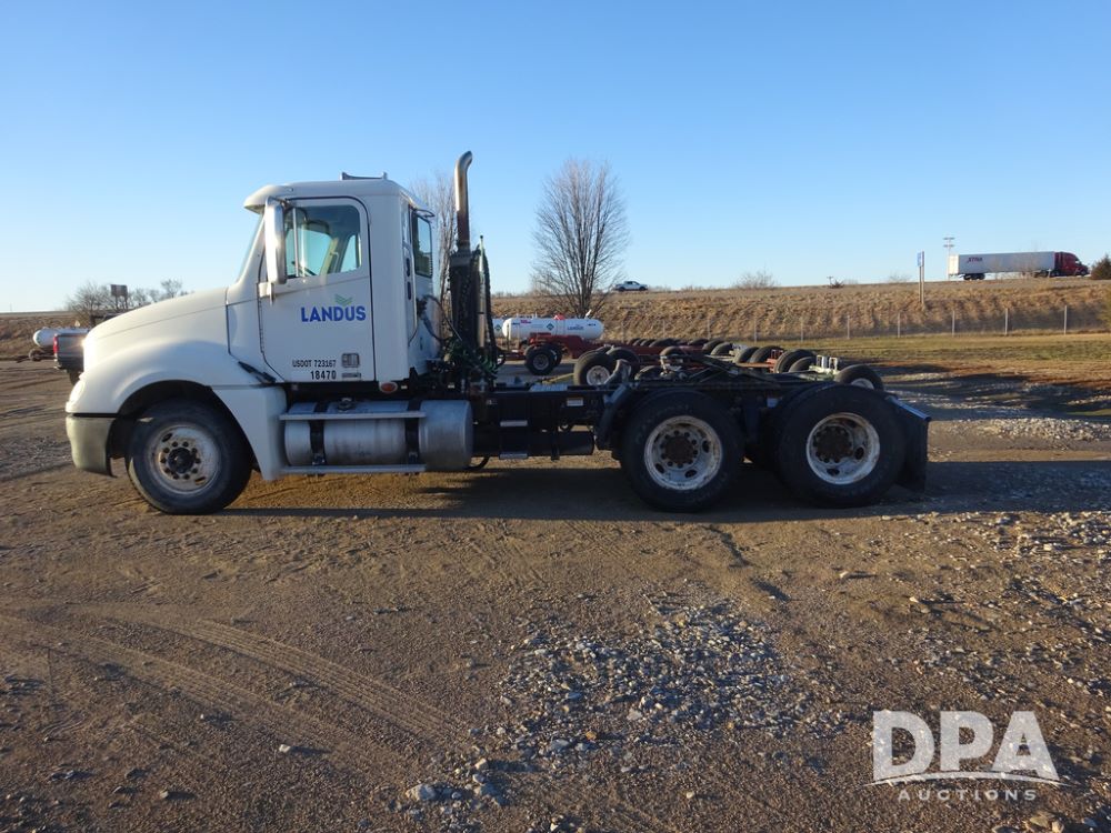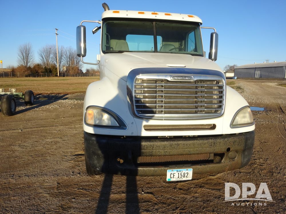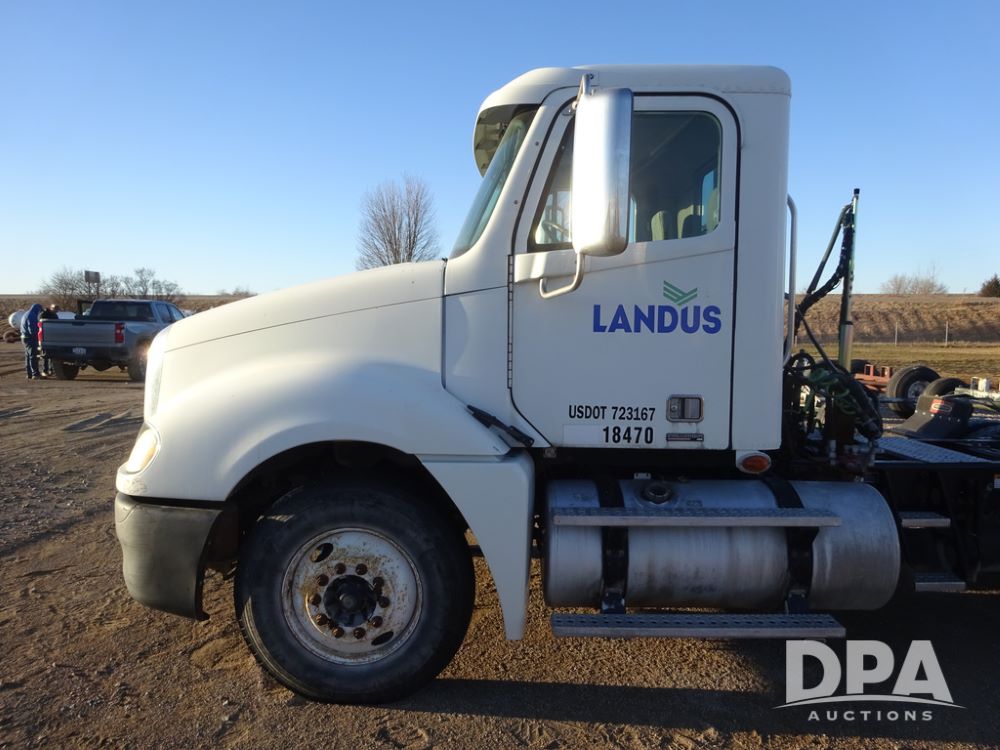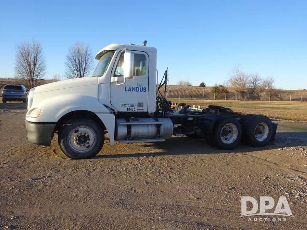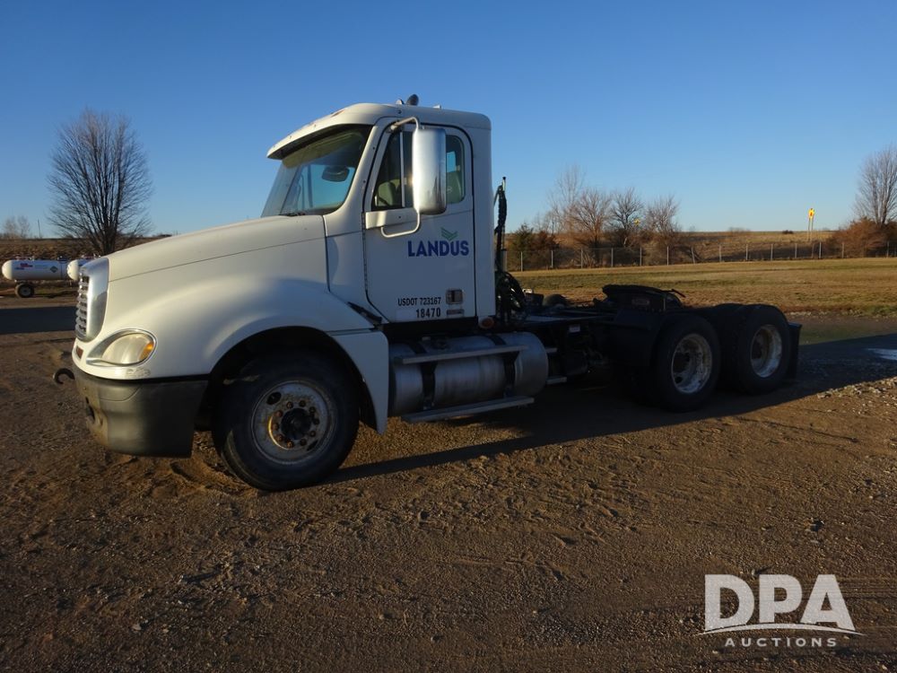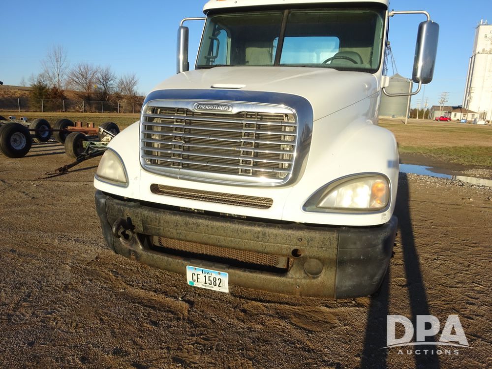 2009 Freightliner Columbia Day Cab Truck (PZ14434, Unit 18470), Detroit Series 60 diesel engine, Eaton Fuller 10 speed transmission, air conditioning, heat, Am/Fm CD radio, cruise control, engine brake, tandem axle, full screw, air ride suspension, Jost 5th wheel, wet kit,11R22.5 tires, shows 340,053 miles.