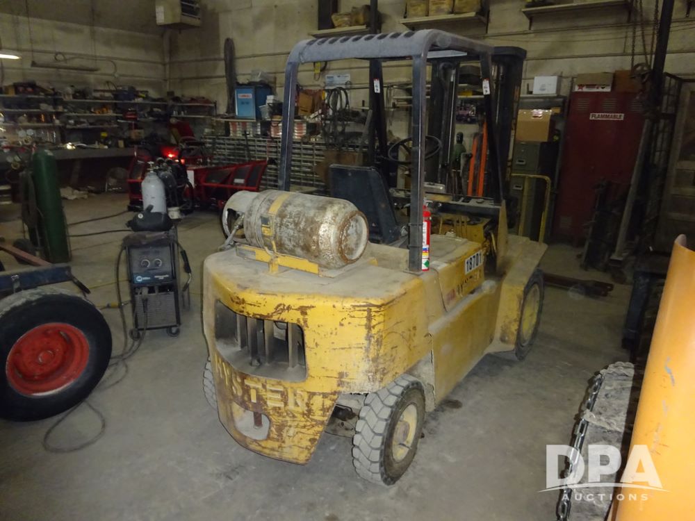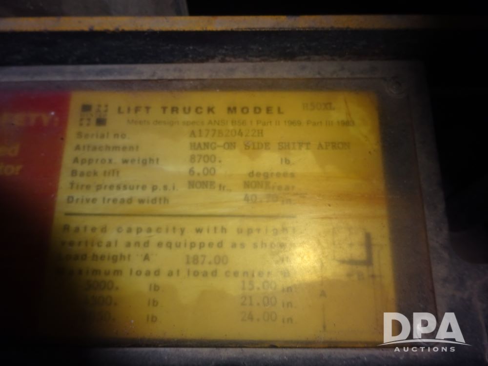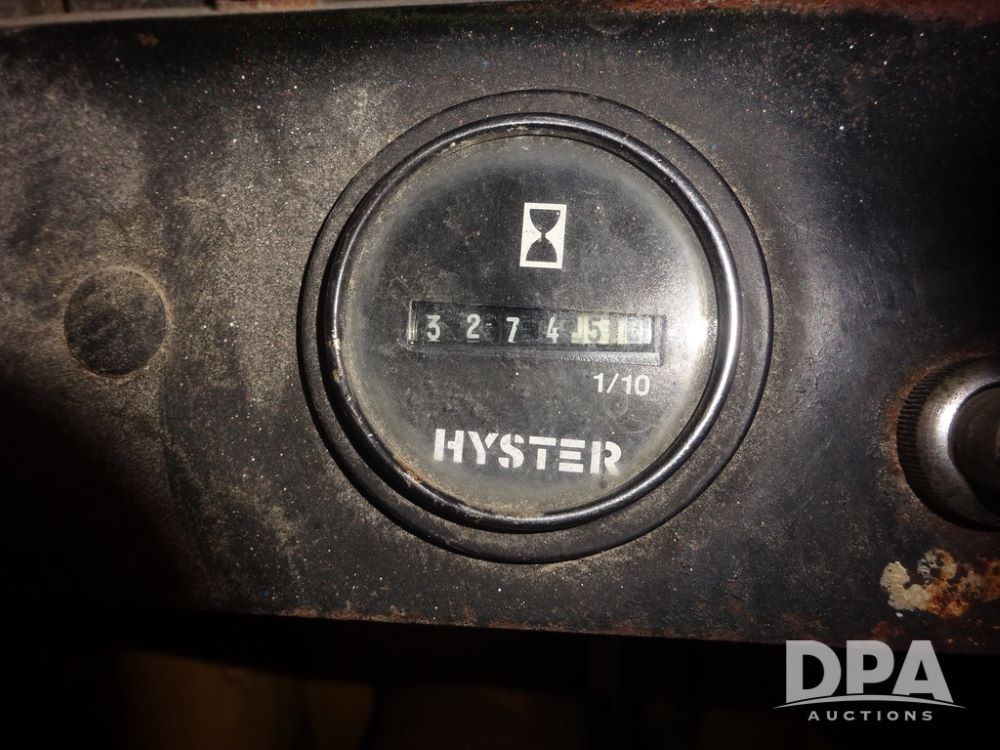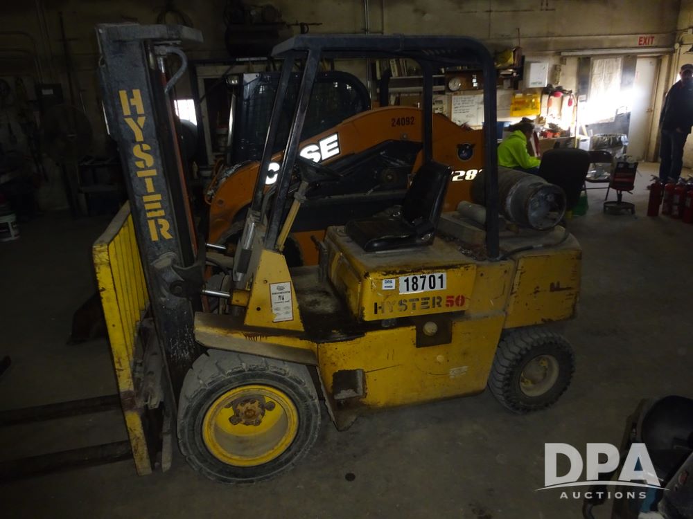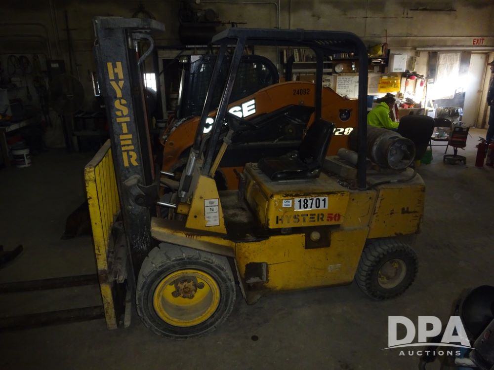 Hyster H50XL Forklift (PZ14435, Unit 18701), LP gas engine, shuttle shift transmission, canopy, forks, hang-on side shift apron, 28x12-15 front tires, 600x9 rear tires, shows 3,274 hours.