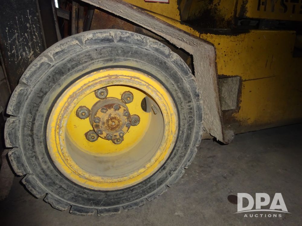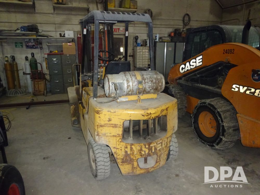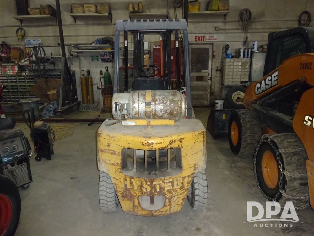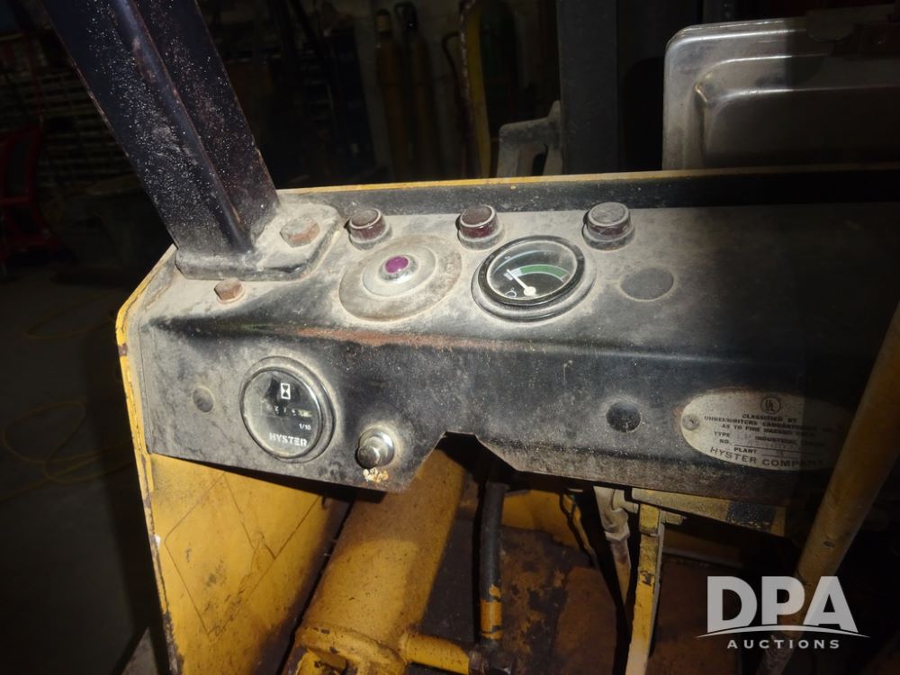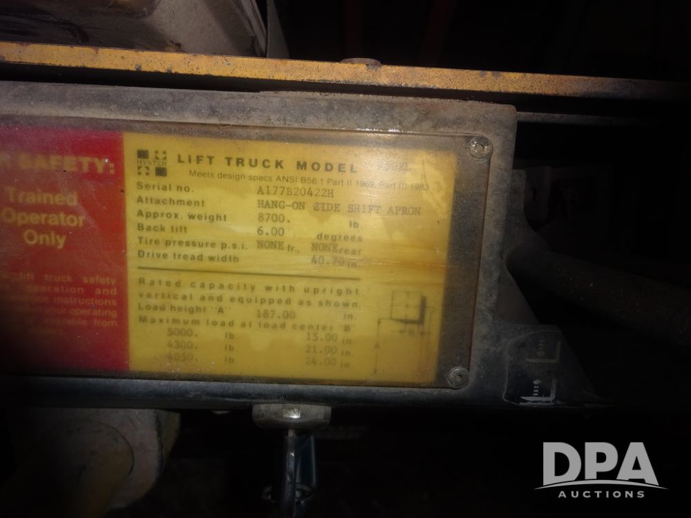Hyster H50XL Forklift (PZ14435, Unit 18701), LP gas engine, shuttle shift transmission, canopy, forks, hang-on side shift apron, 28x12-15 front tires, 600x9 rear tires, shows 3,274 hours.