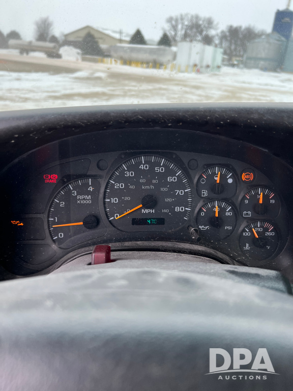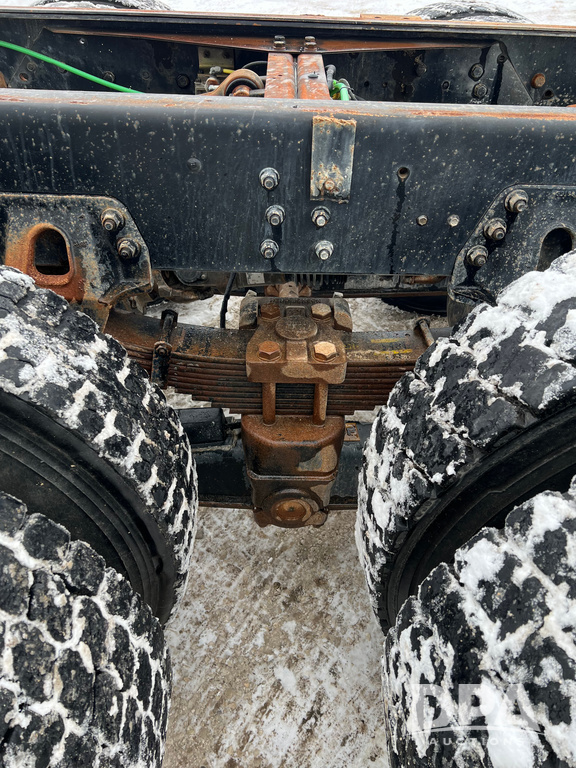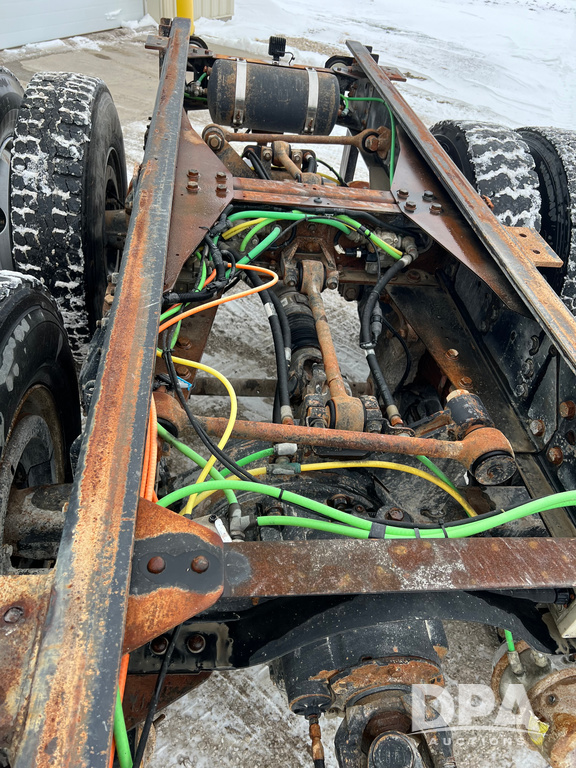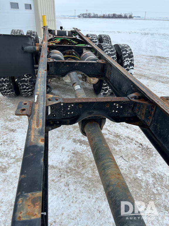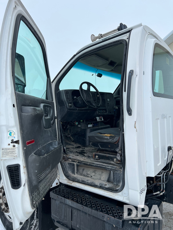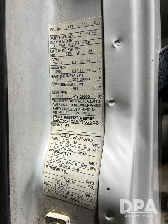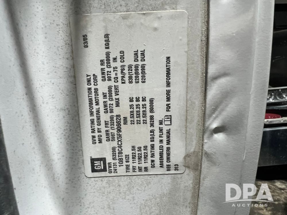 2005 Chevrolet C8500 Cab/Chassis (NP6516), Cat diesel engine, 8LL transmission, heat, Am/Fm radio, tandem axle, spring suspension, 21' 4" of total open frame behind cab, 15' 10" front back of cab to center of axle, double frame, 11R22.5 tires, GVWR 53,200 pounds, shows 161,470 miles.