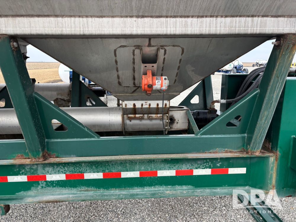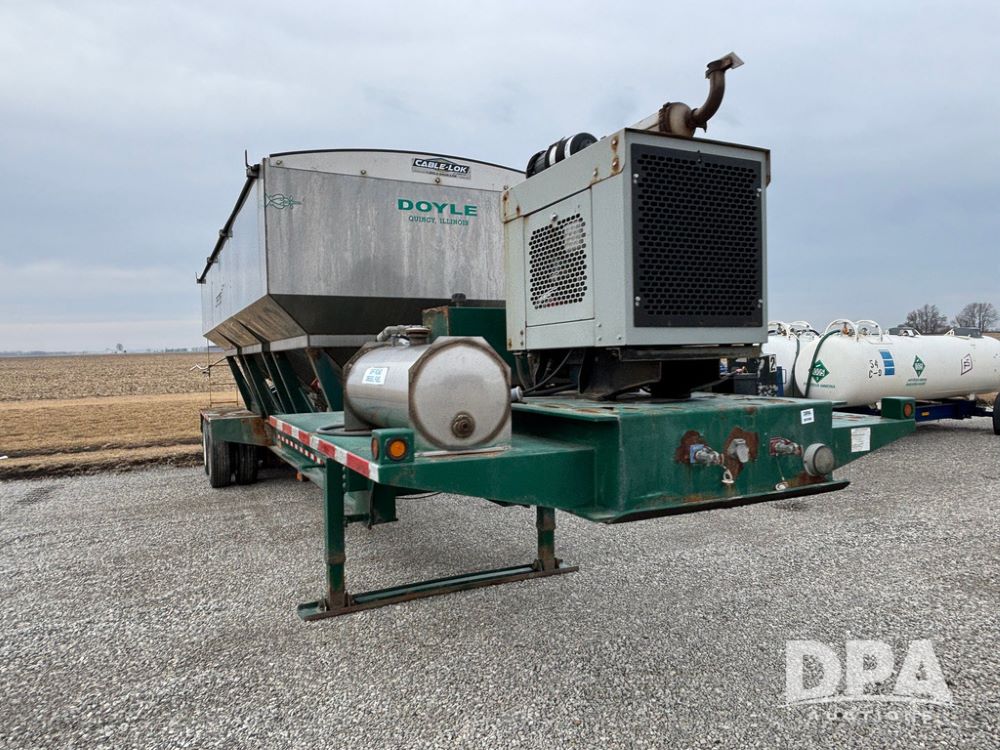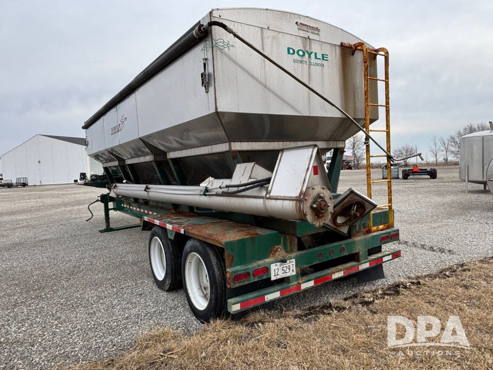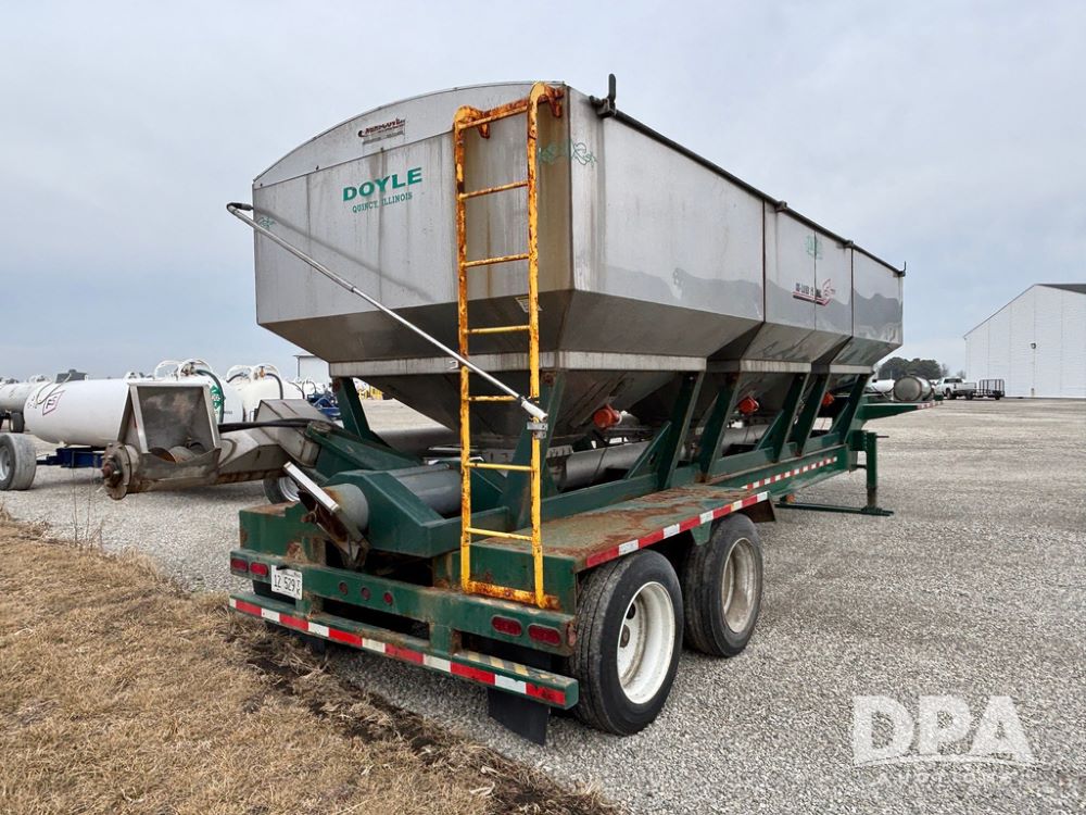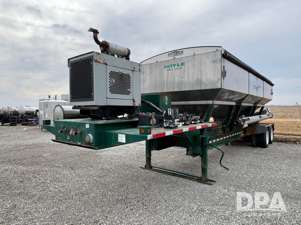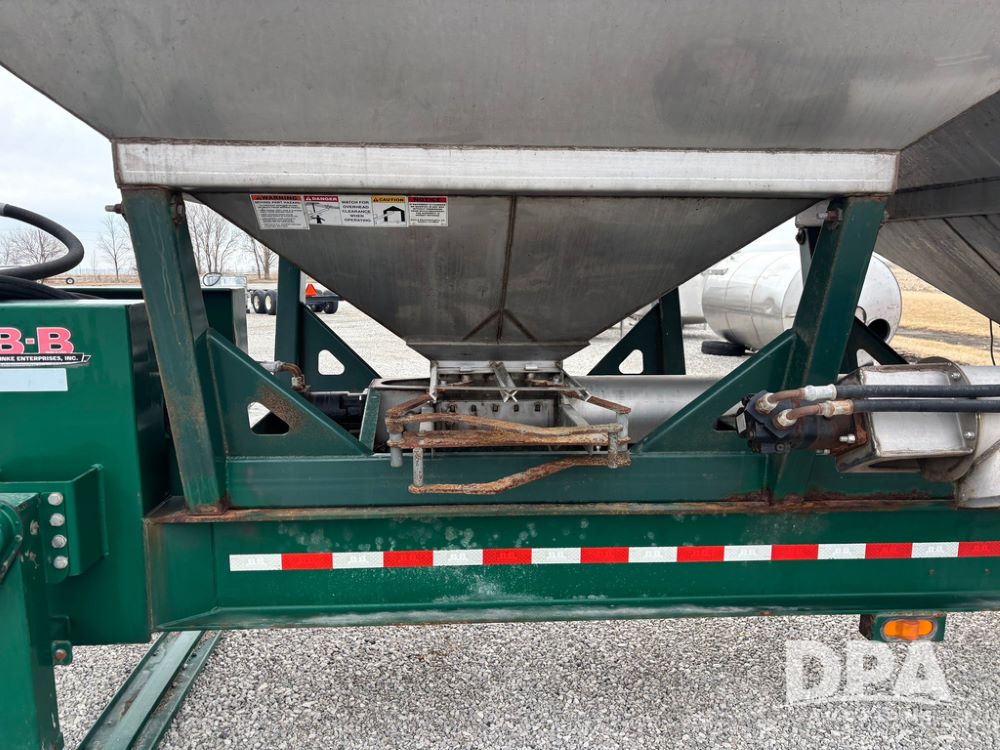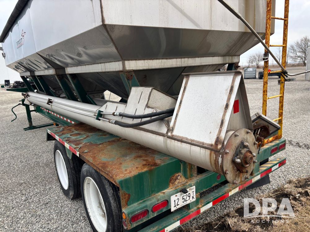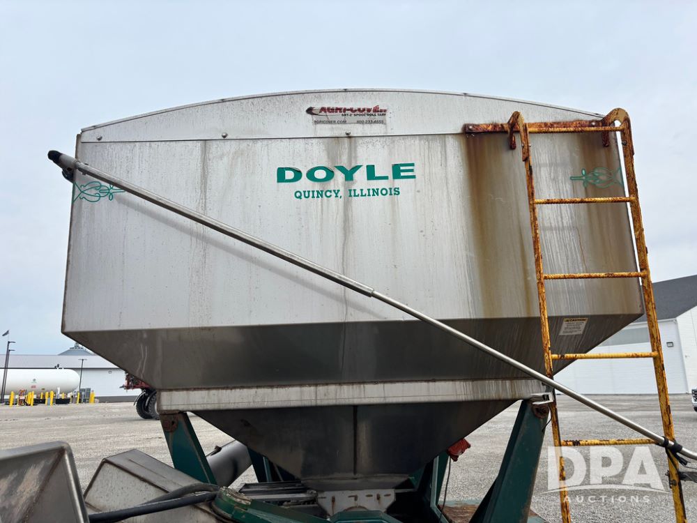 2015 B-B Dry Tender Trailer (GP12765), 2015 Doyle 24 ton stainless steel dry tender box, side discharge auger, self contained diesel engine, shows 718 hours, hopper vibrators, roll over tarp, 2015 B-B trailer, tandem axle, spring suspension, 255/70R22.5 tires.