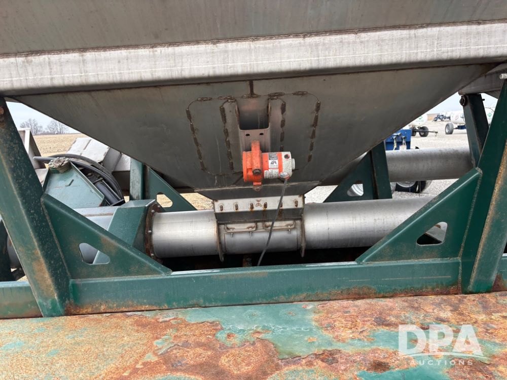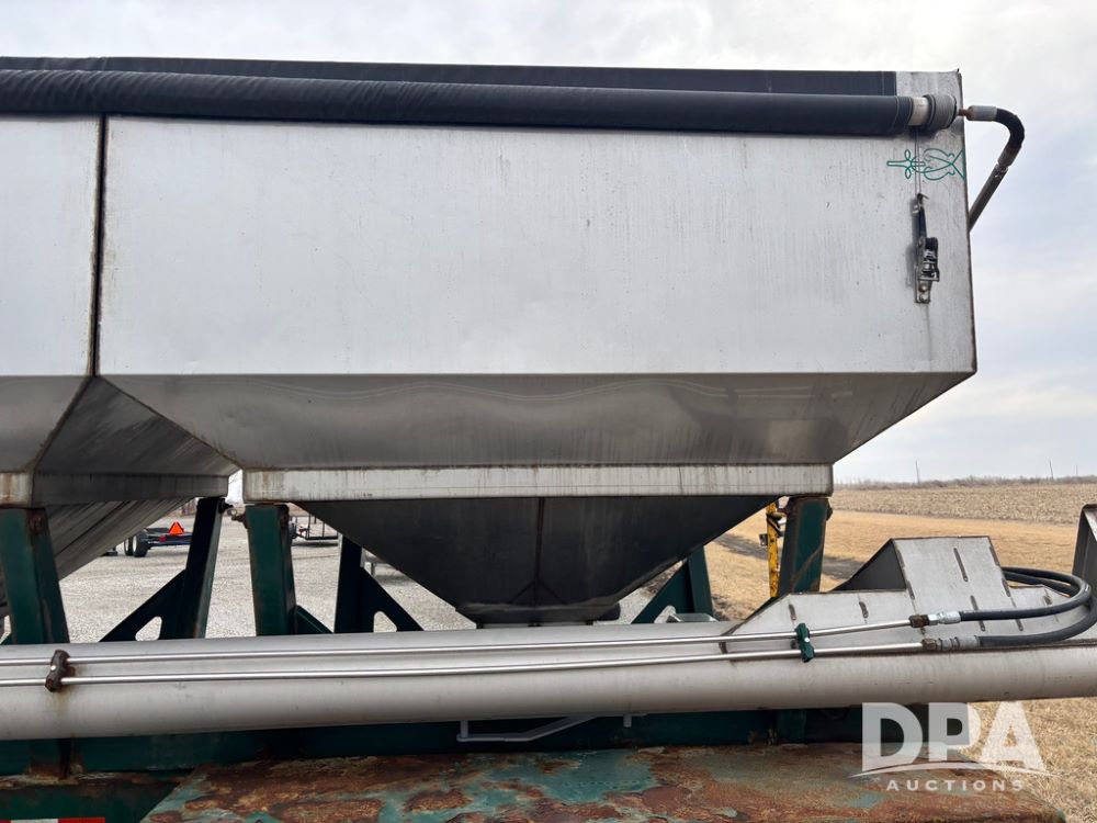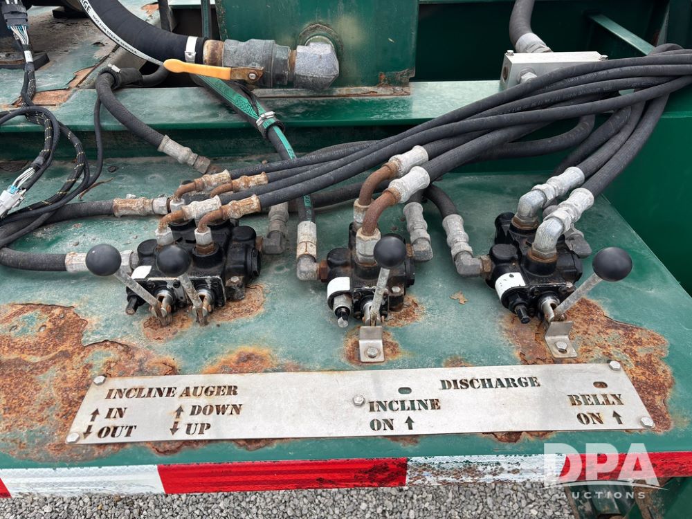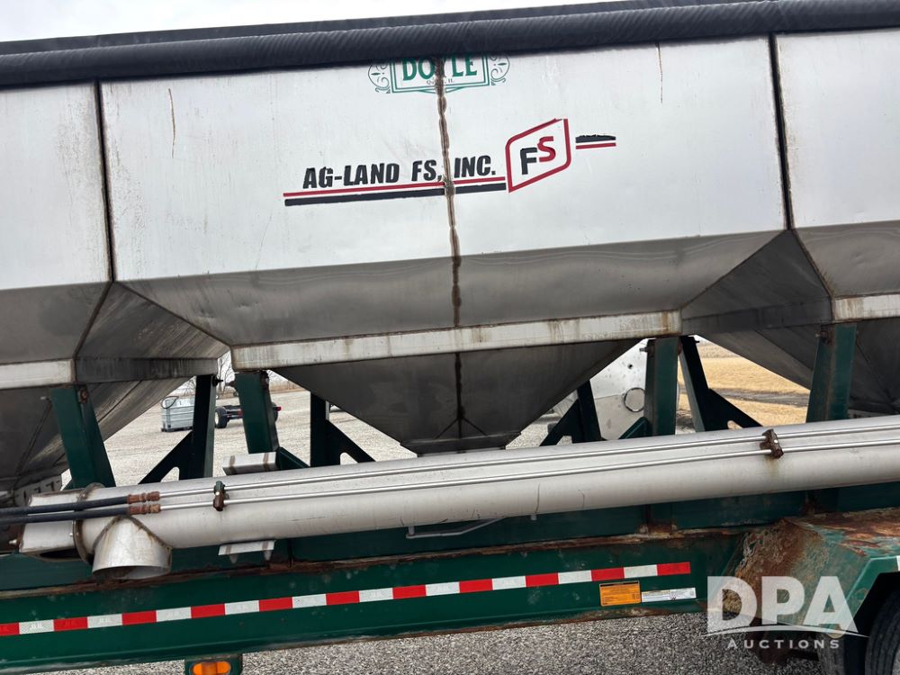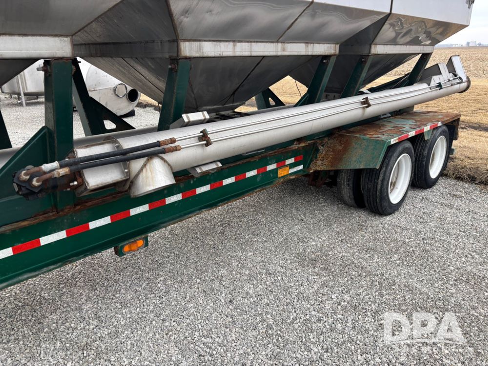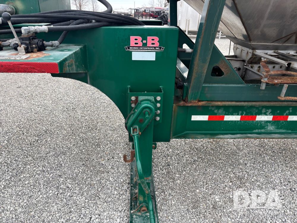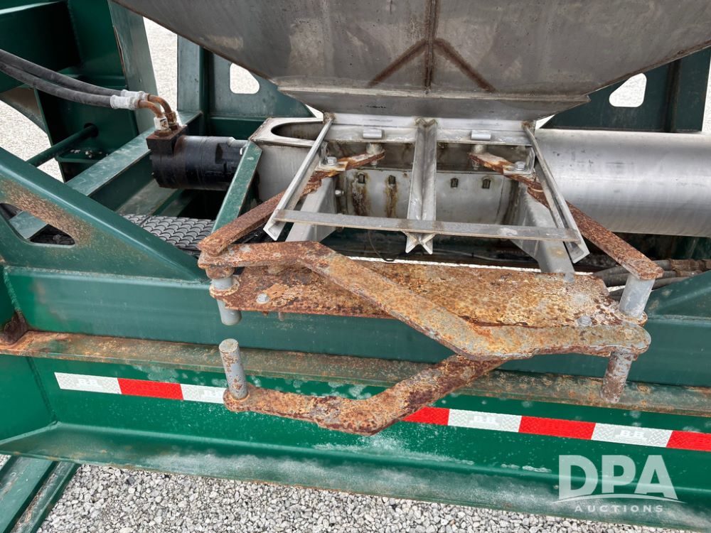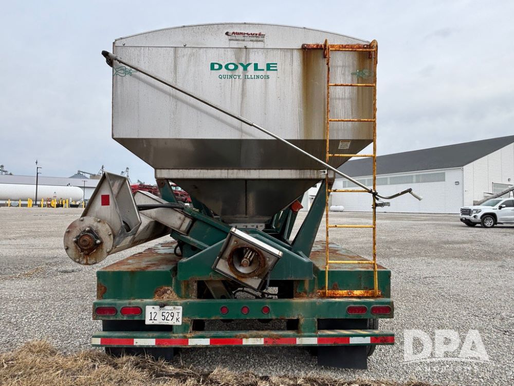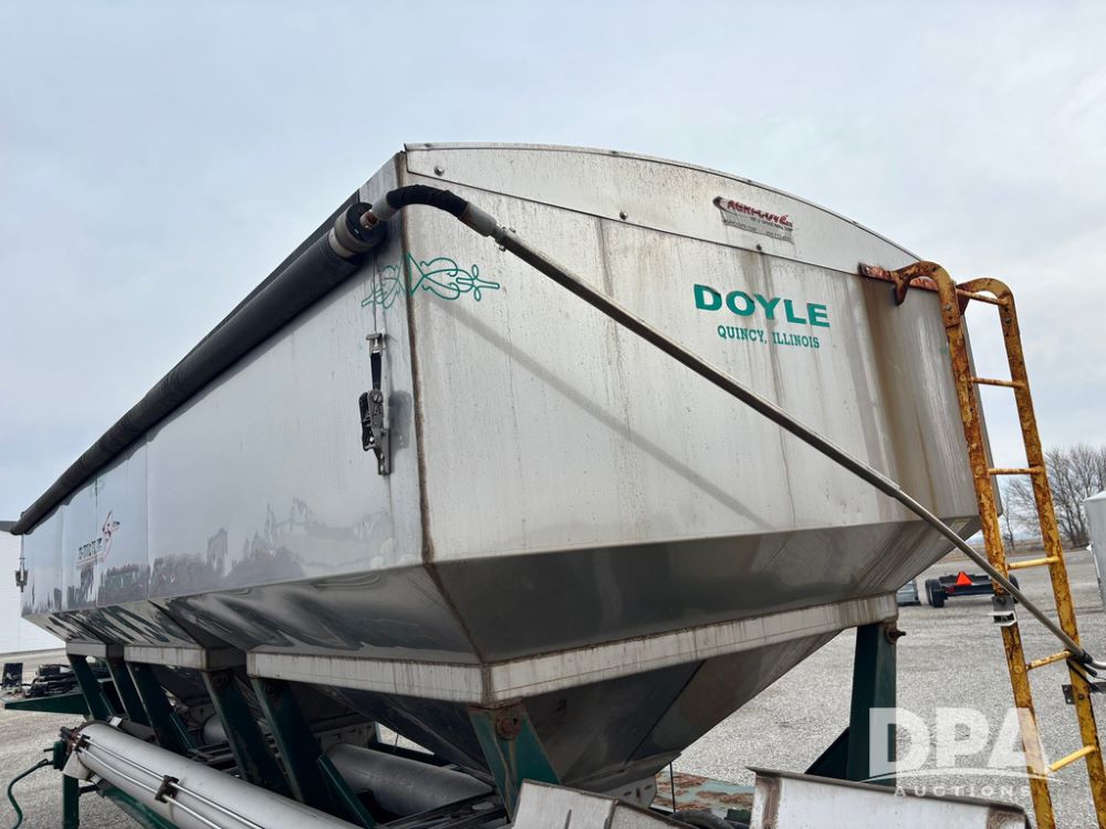 2015 B-B Dry Tender Trailer (GP12765), 2015 Doyle 24 ton stainless steel dry tender box, side discharge auger, self contained diesel engine, shows 718 hours, hopper vibrators, roll over tarp, 2015 B-B trailer, tandem axle, spring suspension, 255/70R22.5 tires.