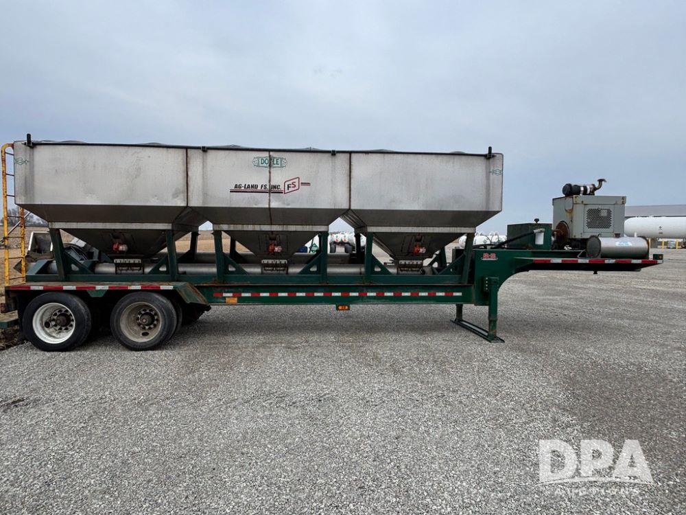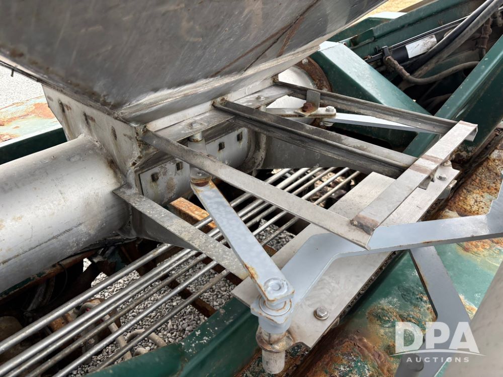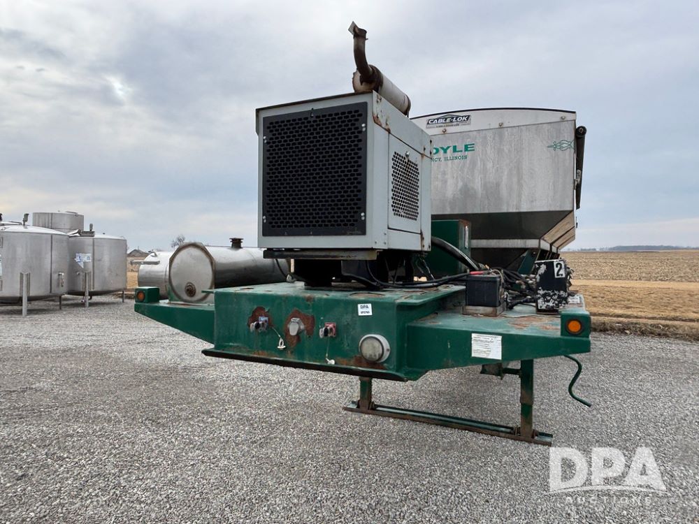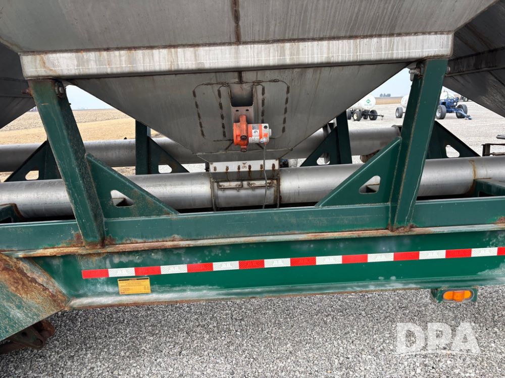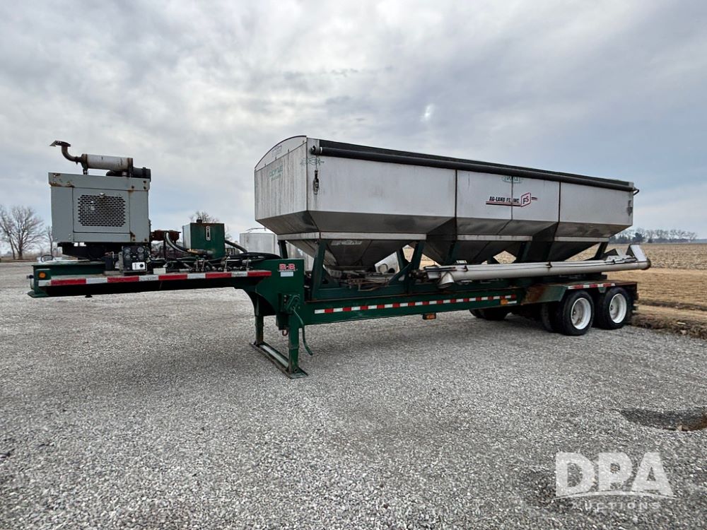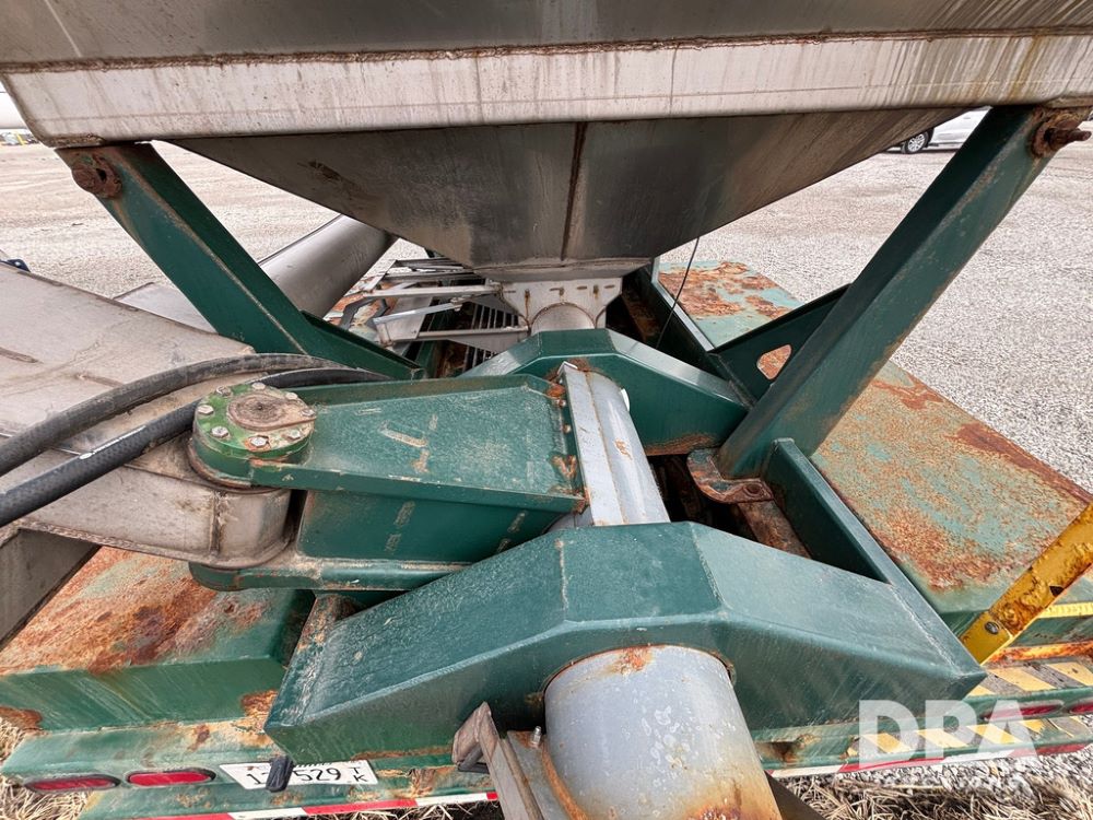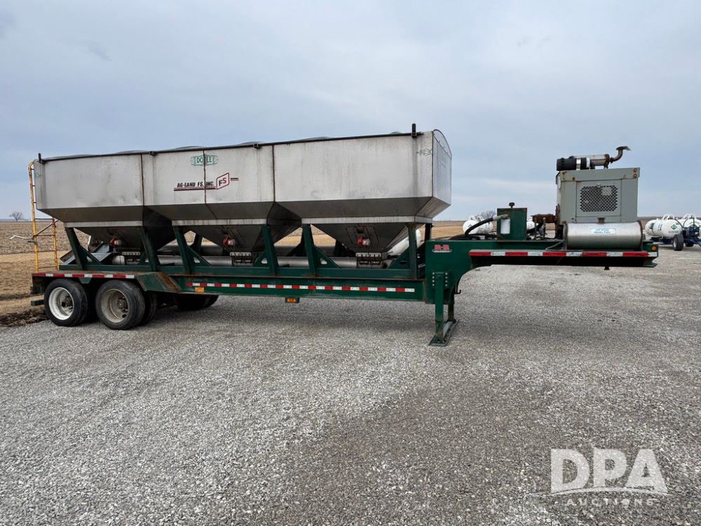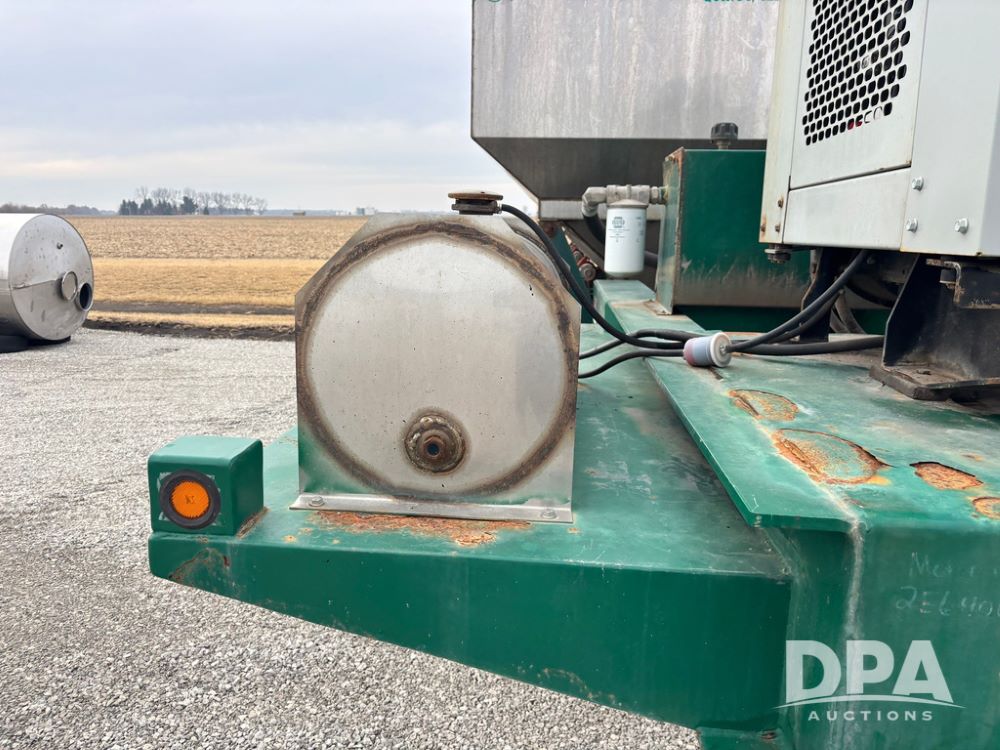 2015 B-B Dry Tender Trailer (GP12765), 2015 Doyle 24 ton stainless steel dry tender box, side discharge auger, self contained diesel engine, shows 718 hours, hopper vibrators, roll over tarp, 2015 B-B trailer, tandem axle, spring suspension, 255/70R22.5 tires.