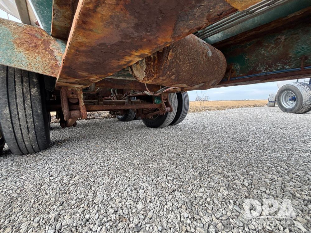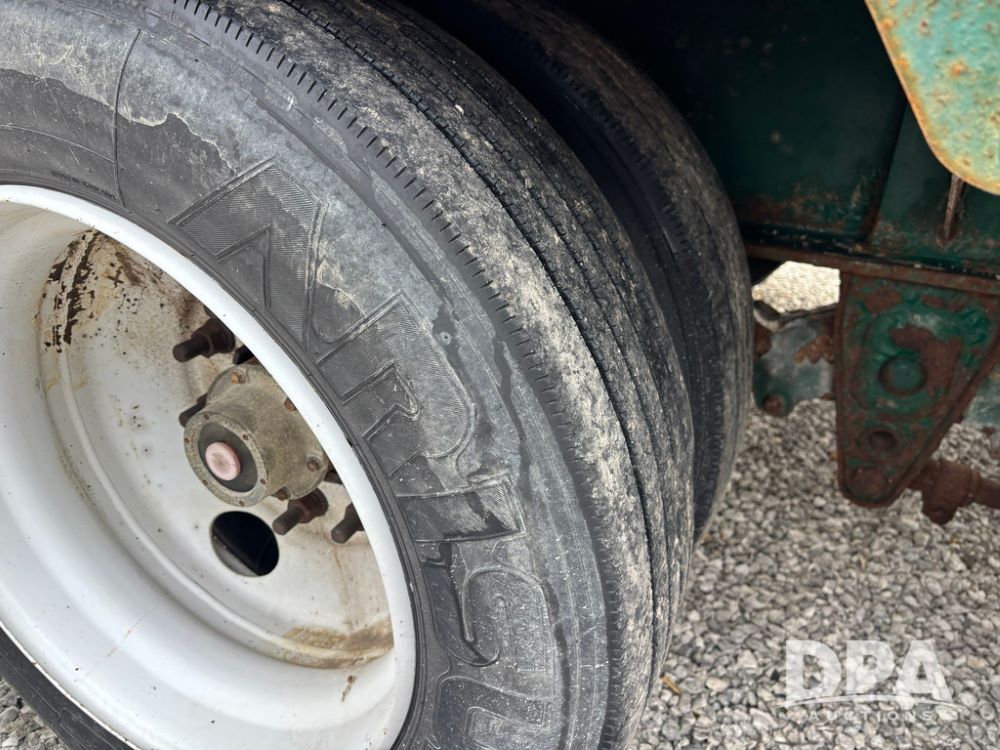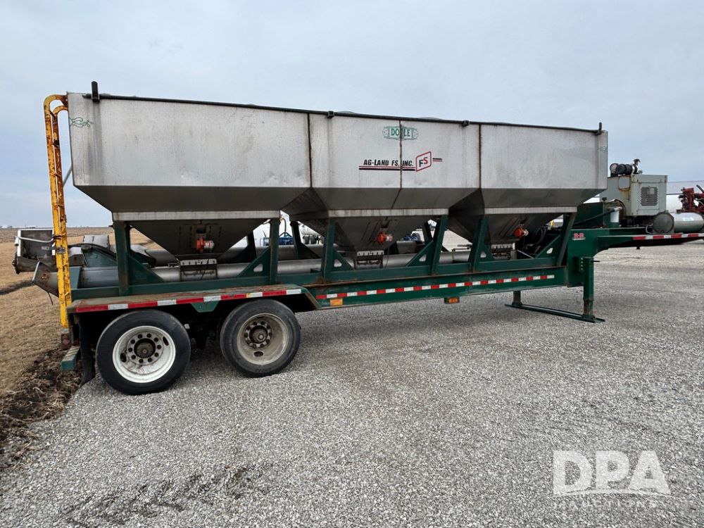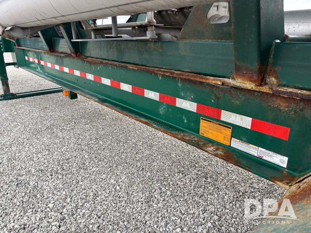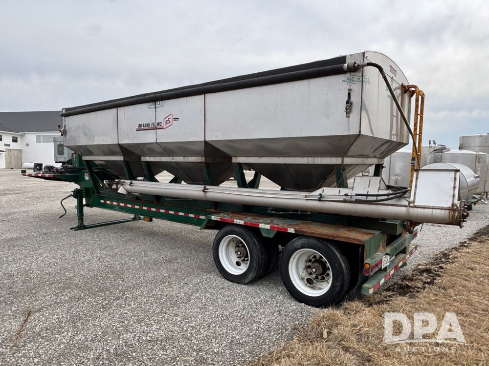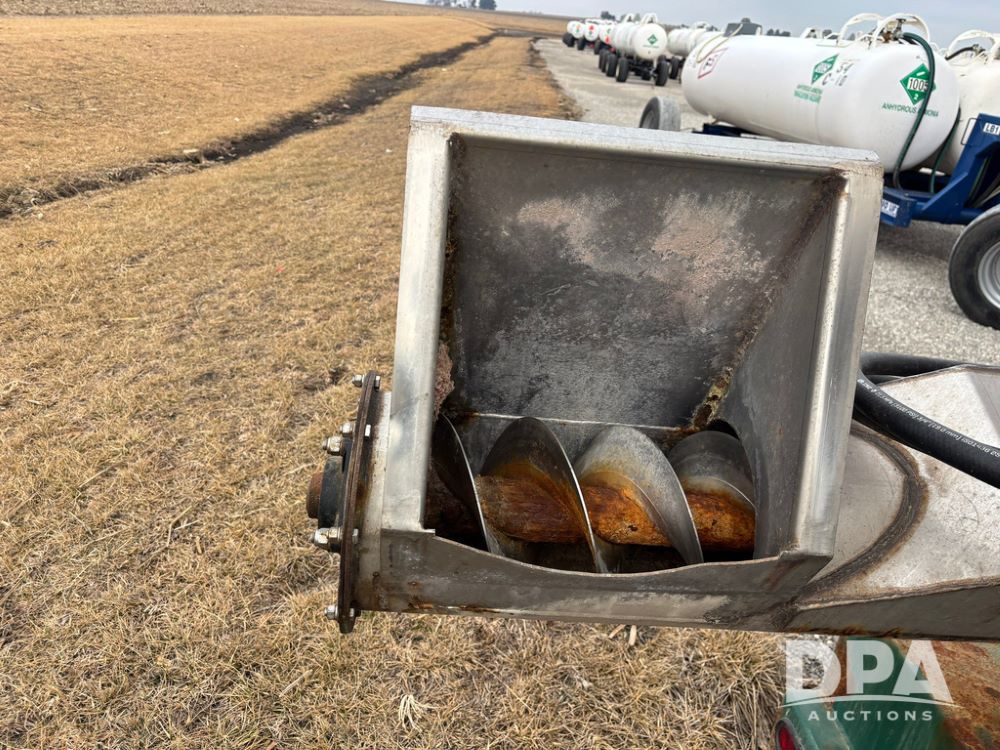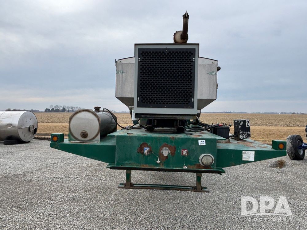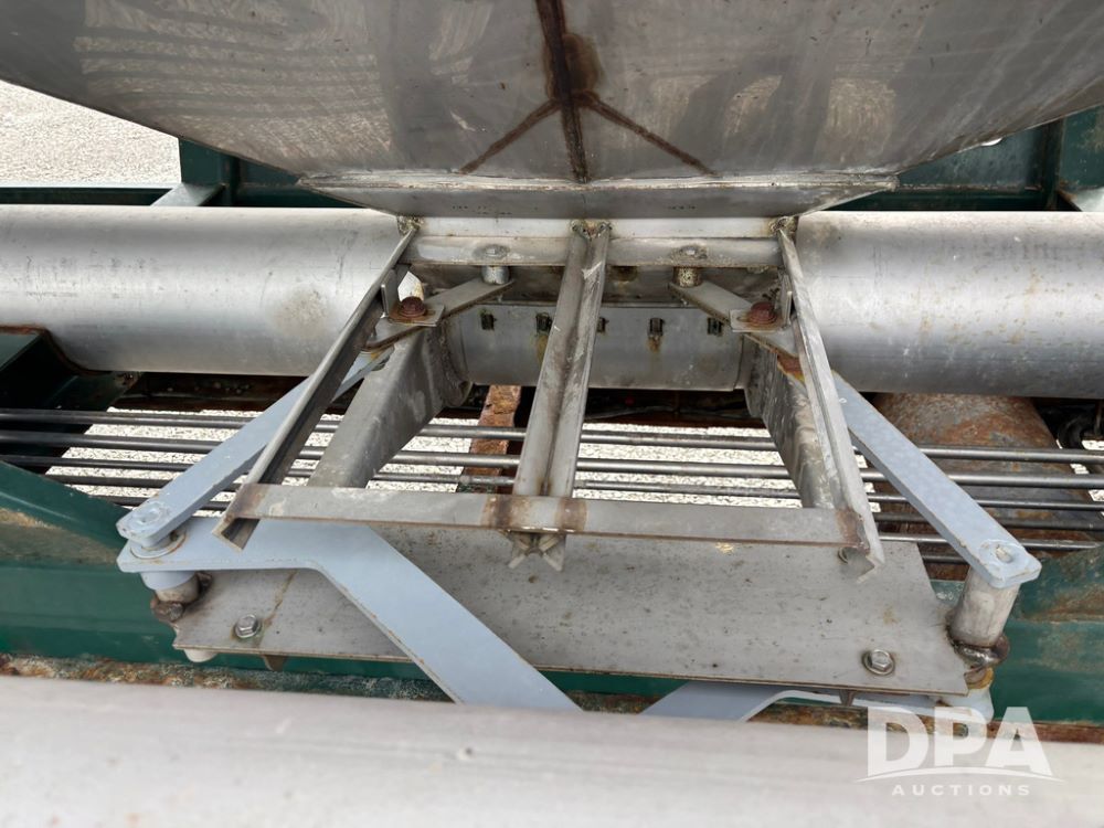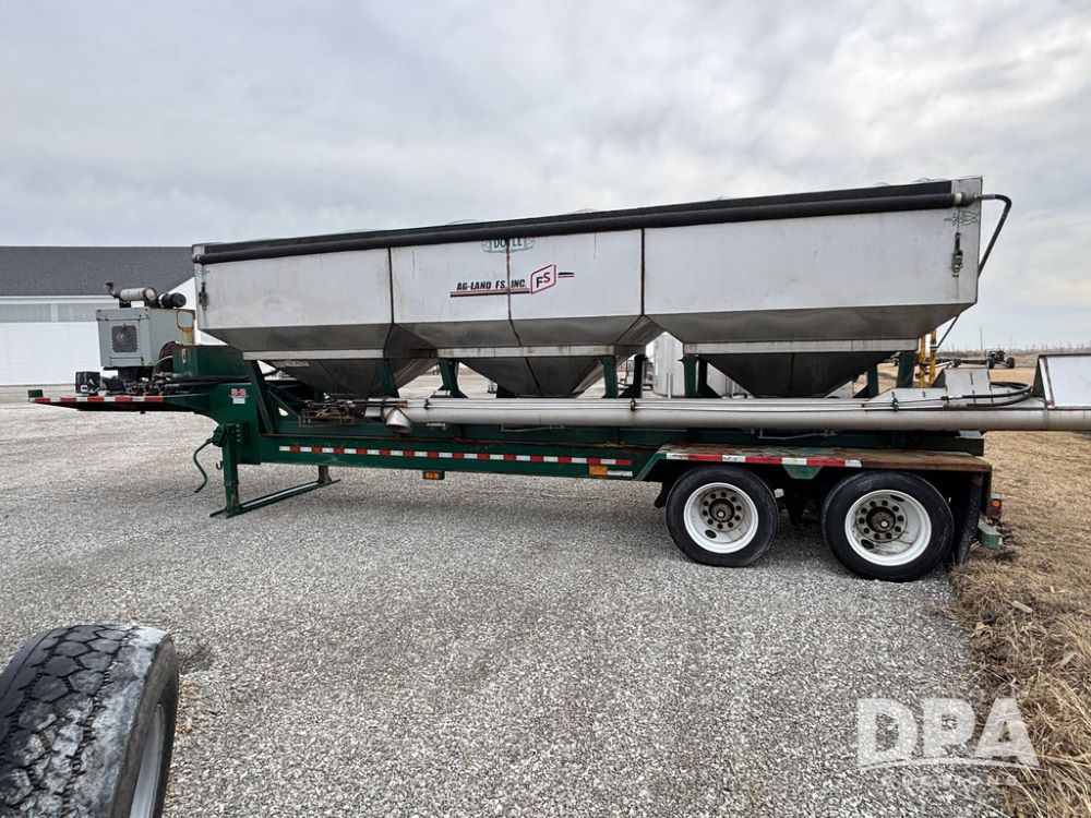 2015 B-B Dry Tender Trailer (GP12765), 2015 Doyle 24 ton stainless steel dry tender box, side discharge auger, self contained diesel engine, shows 718 hours, hopper vibrators, roll over tarp, 2015 B-B trailer, tandem axle, spring suspension, 255/70R22.5 tires.