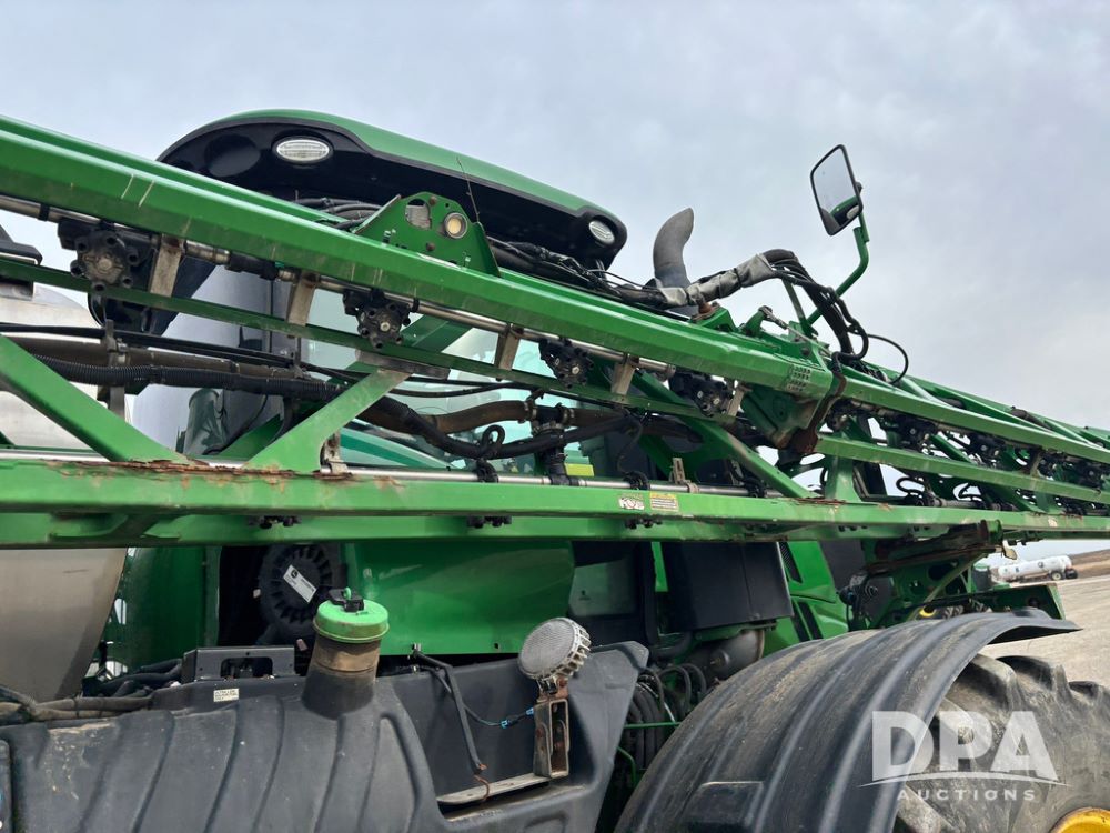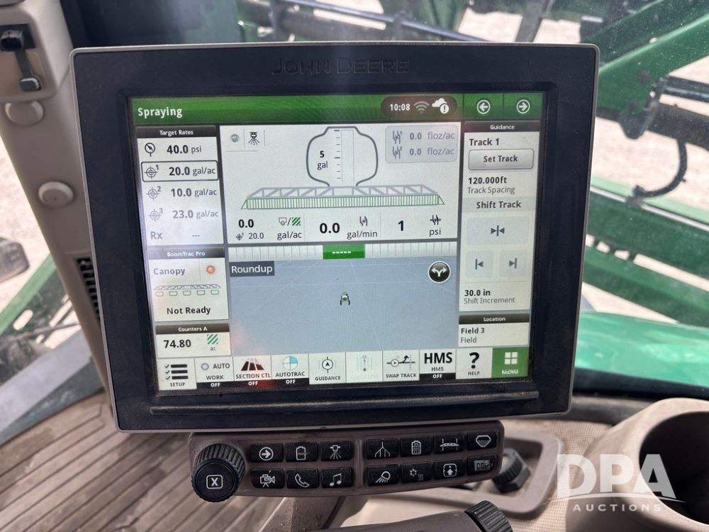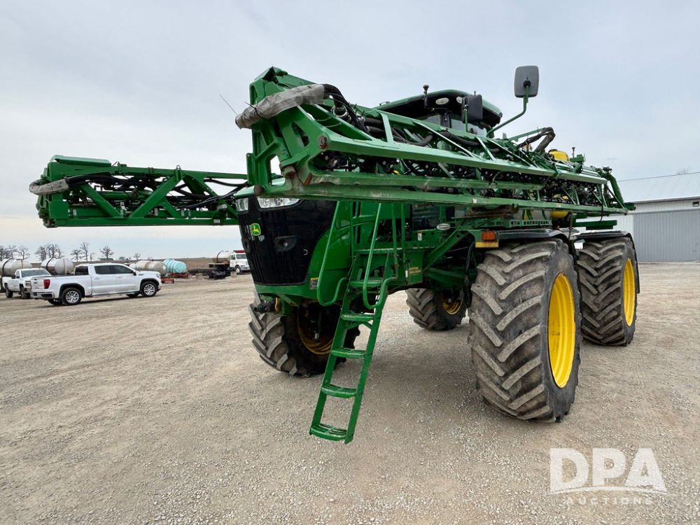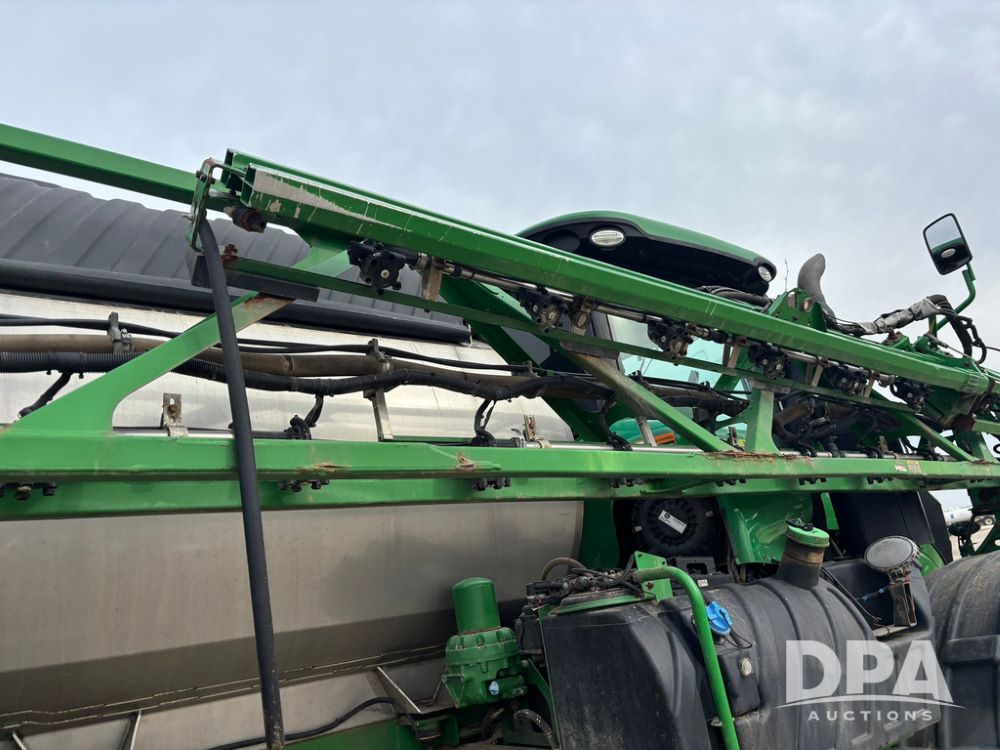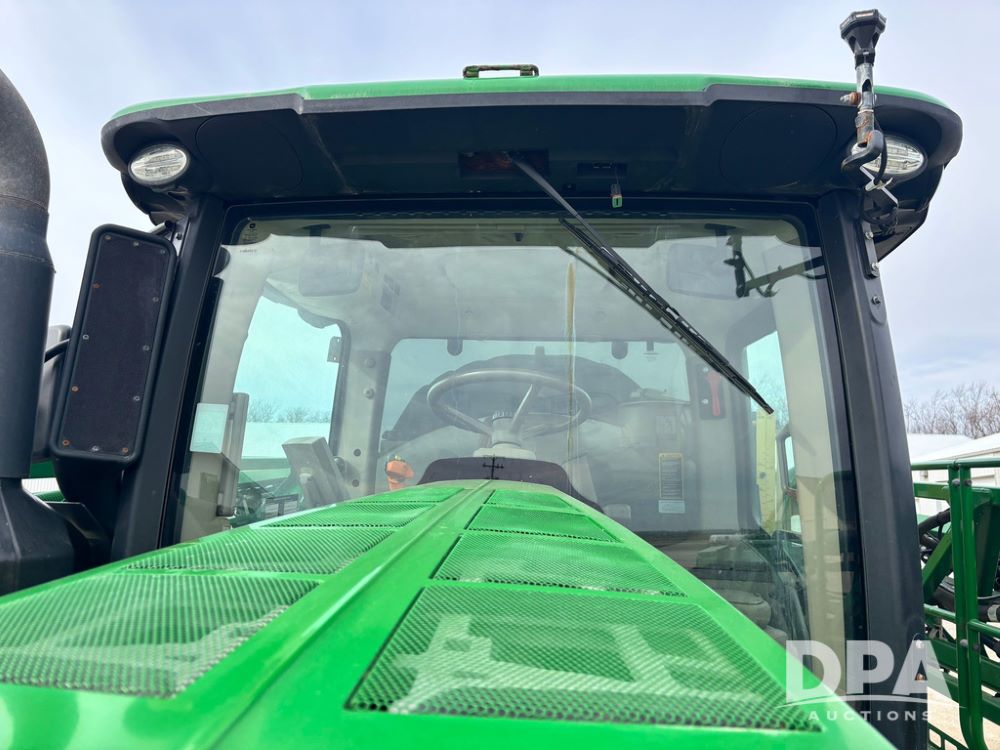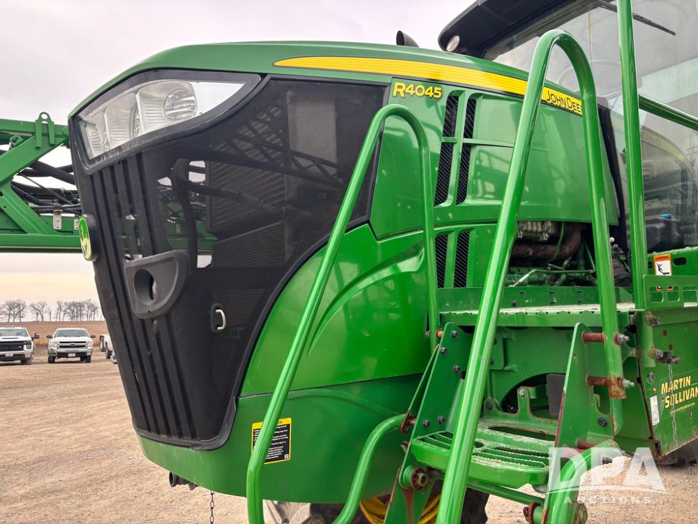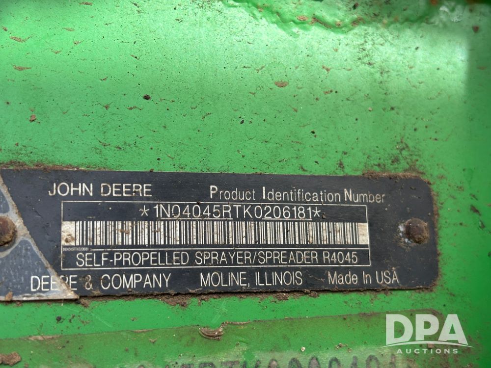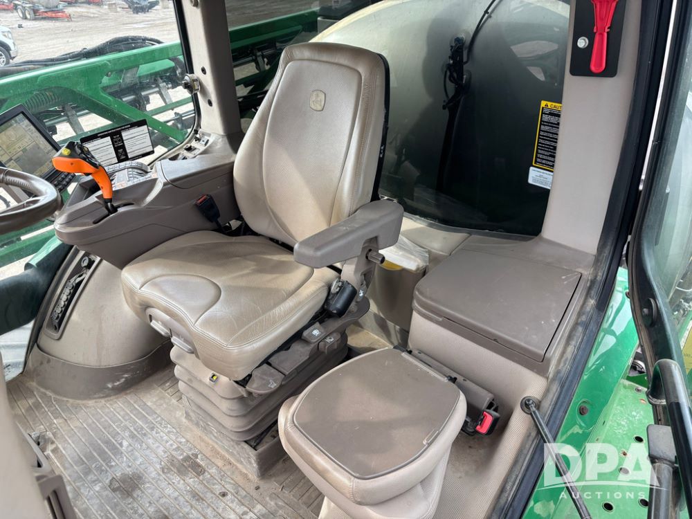 2020 John Deere R4045 Sprayer (GP12780), John Deere diesel engine (S/N RG6090U078479), hydrostatic transmission, air conditioning, heat, Am/Fm radio, leather seat buddy seat, 1200 gallon stainless steel liquid system, 120' boom, top poly rinse tank, 4 - 50 gallon poly direct injection tanks, 2 - Raven Sidekick Pro pumps, automatic solution control, front fill, Mitas SFT IF 710/65R46 flotation tires, fenders, John Deere monitor, shows 4,483 hours.