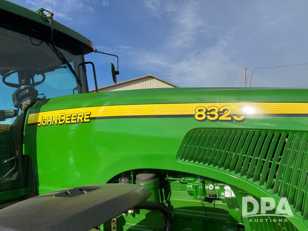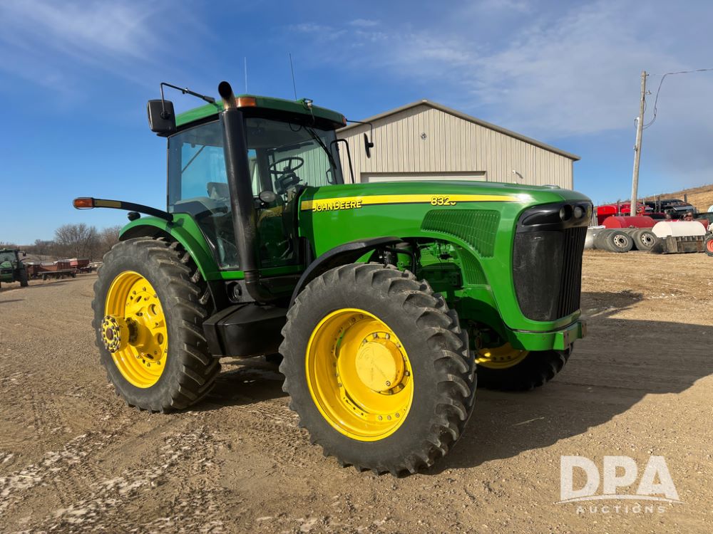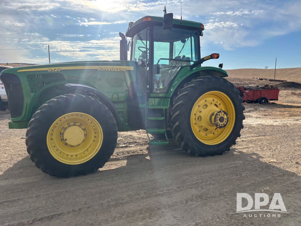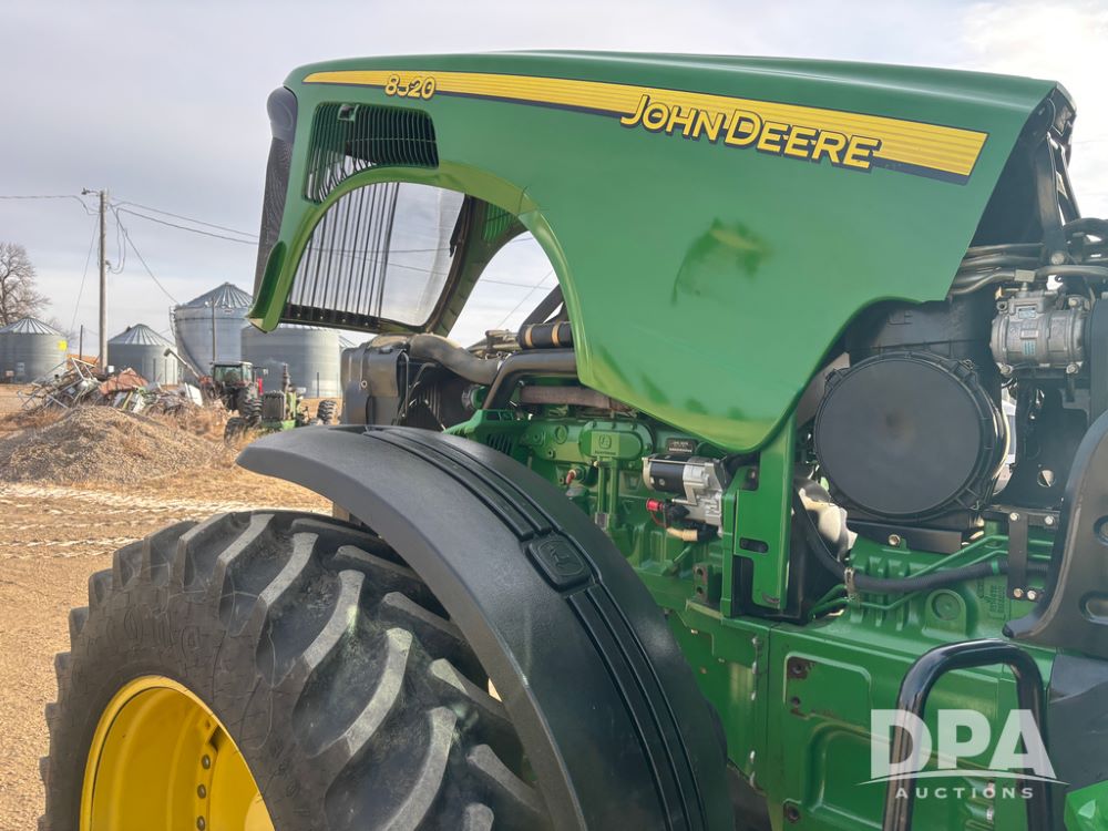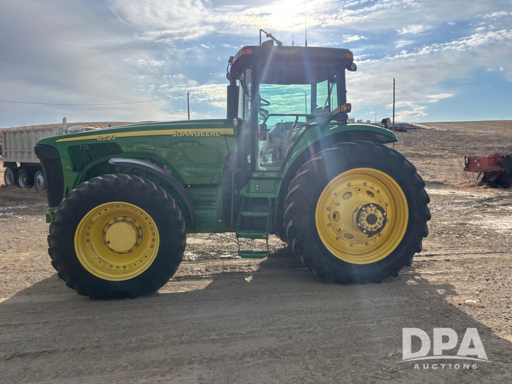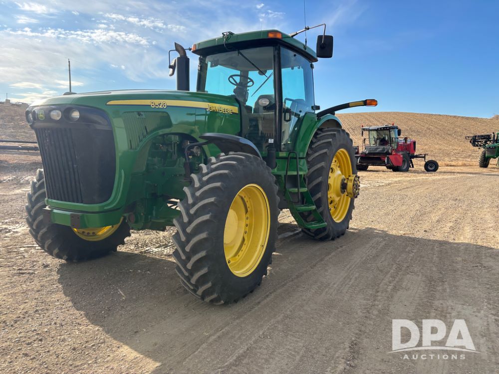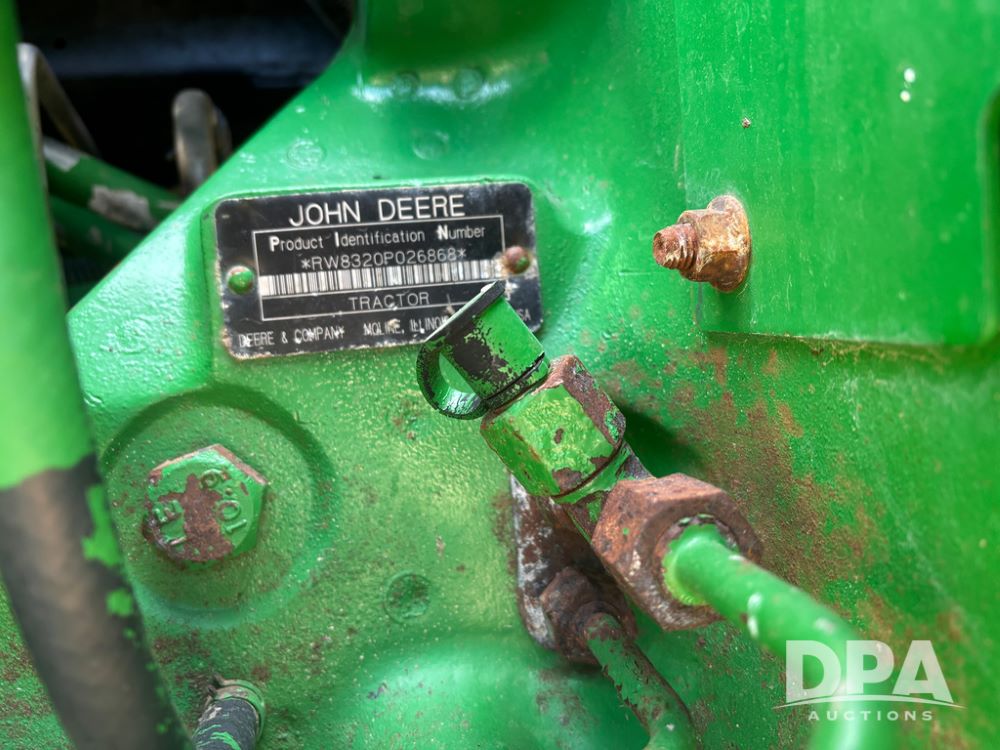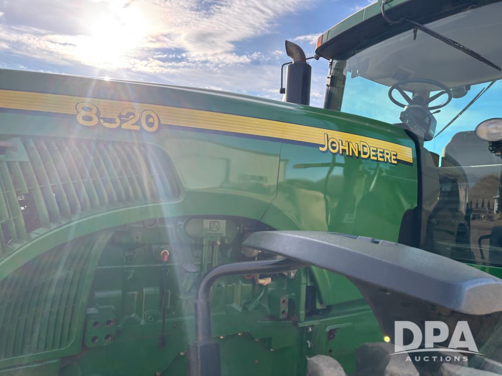 John Deere 8320 MFWD Tractor (DR13205), John Deere diesel engine, PowerShift transmission, MFWD, 4 remote hydraulic outlets, rear 3 point hitch, PTO, hammer strap hitch, rear axle weights, front weight bracket & suitcase weights, active seat & buddy seat, cab heat/air conditioning, 380/85R34 near new front tires, 480/80R46 rear tires w/axle mount duals, shows 7,357 hours.