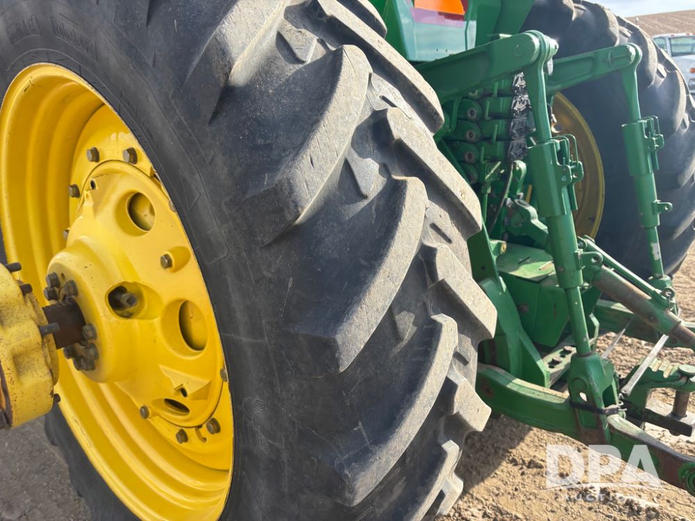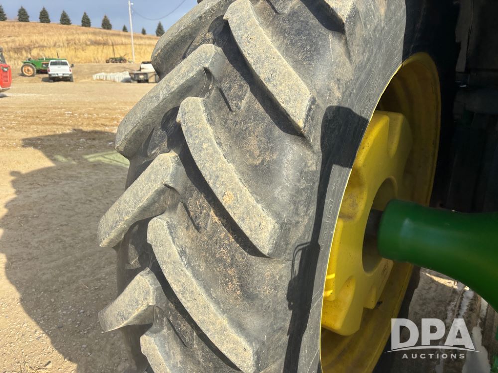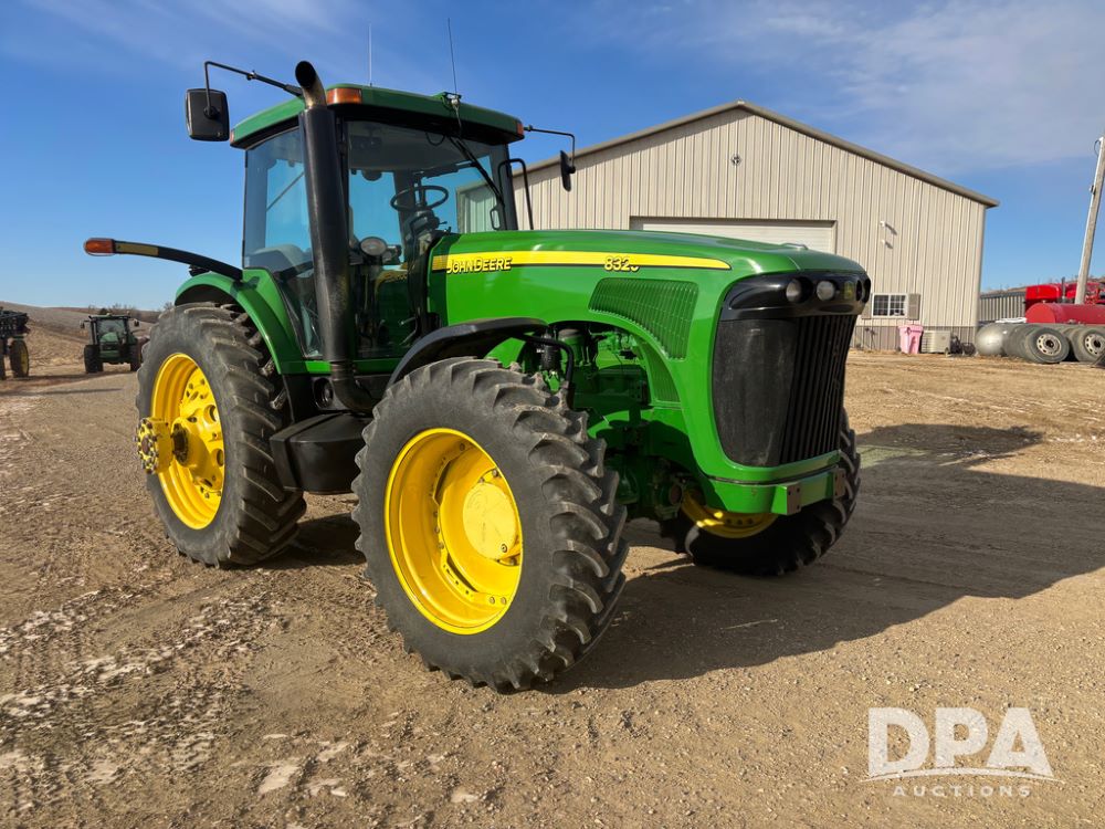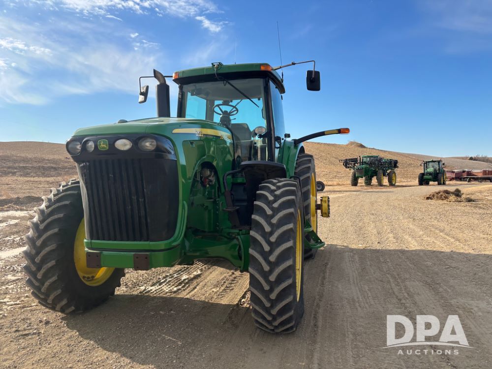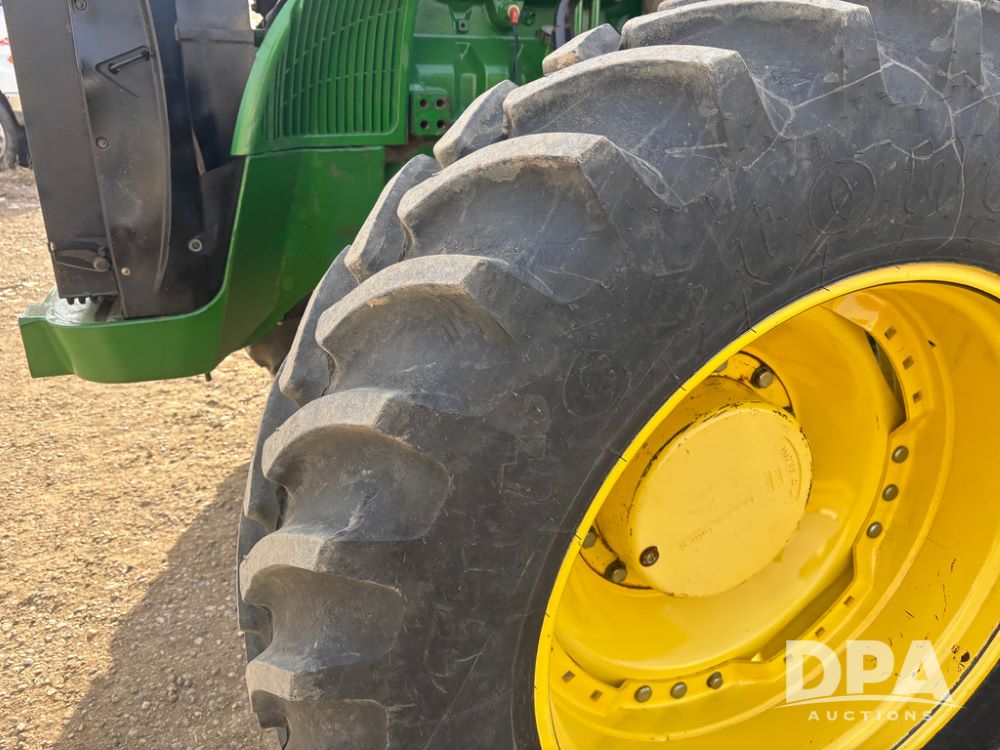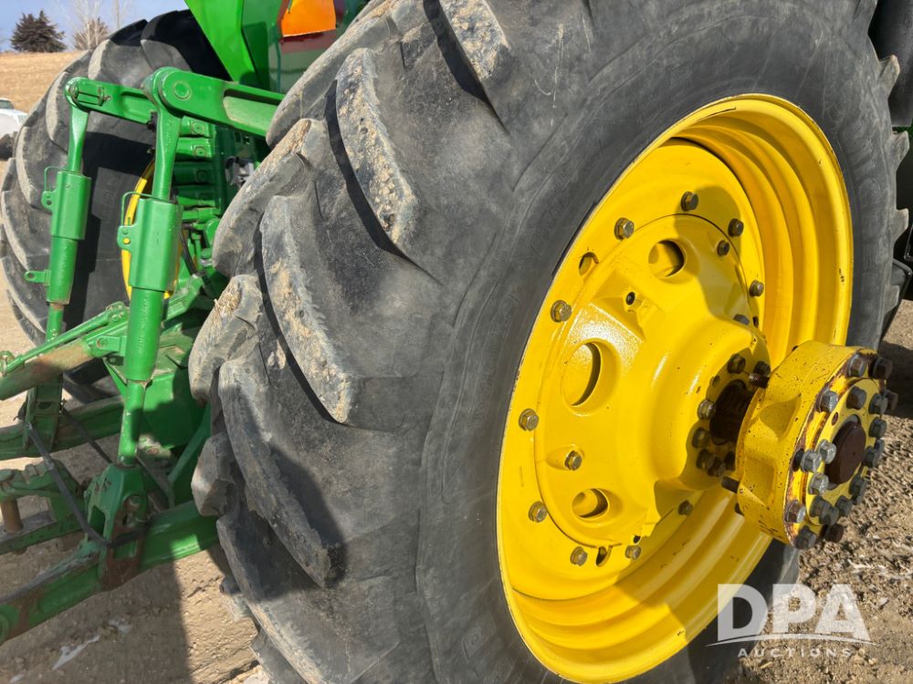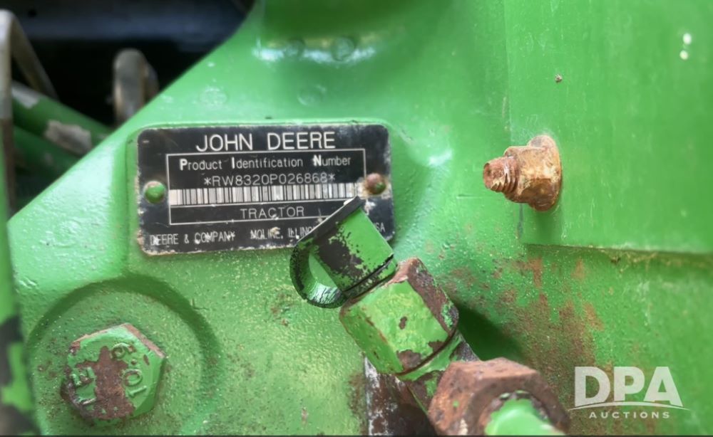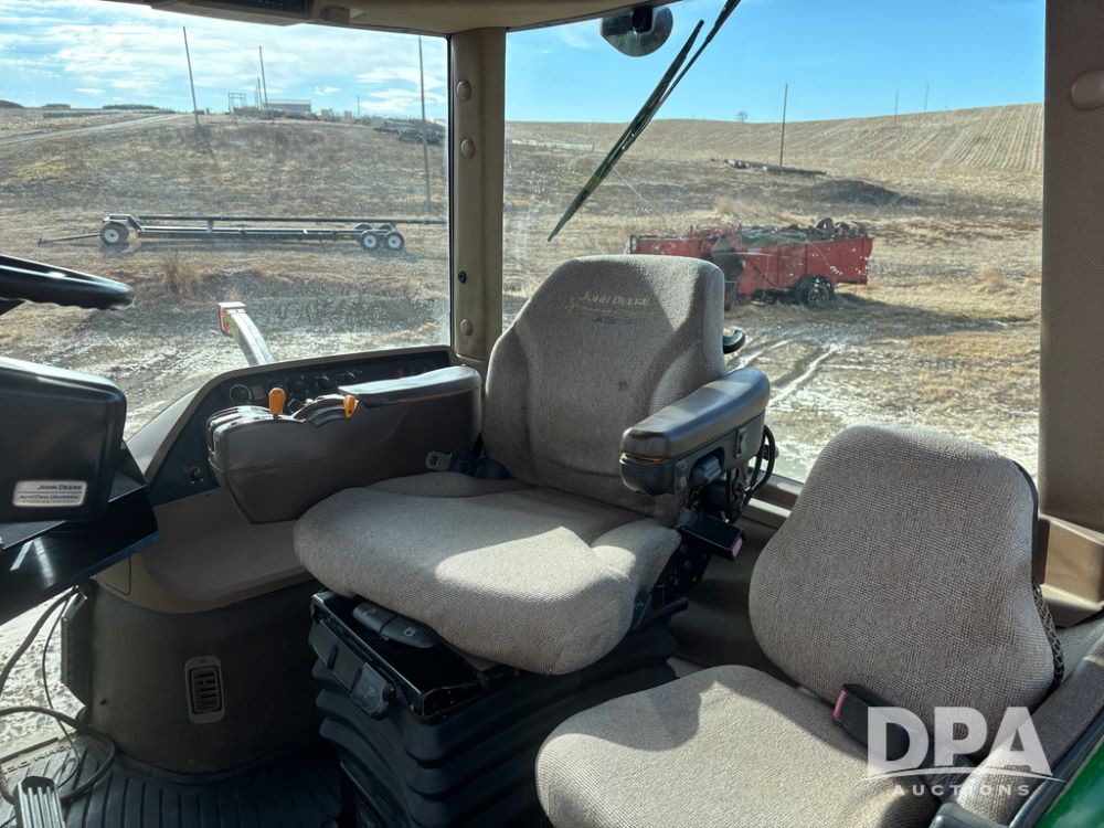 John Deere 8320 MFWD Tractor (DR13205), John Deere diesel engine, PowerShift transmission, MFWD, 4 remote hydraulic outlets, rear 3 point hitch, PTO, hammer strap hitch, rear axle weights, front weight bracket & suitcase weights, active seat & buddy seat, cab heat/air conditioning, 380/85R34 near new front tires, 480/80R46 rear tires w/axle mount duals, shows 7,357 hours.