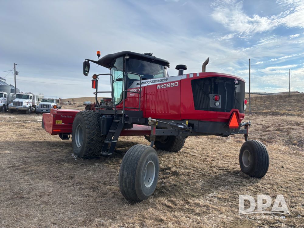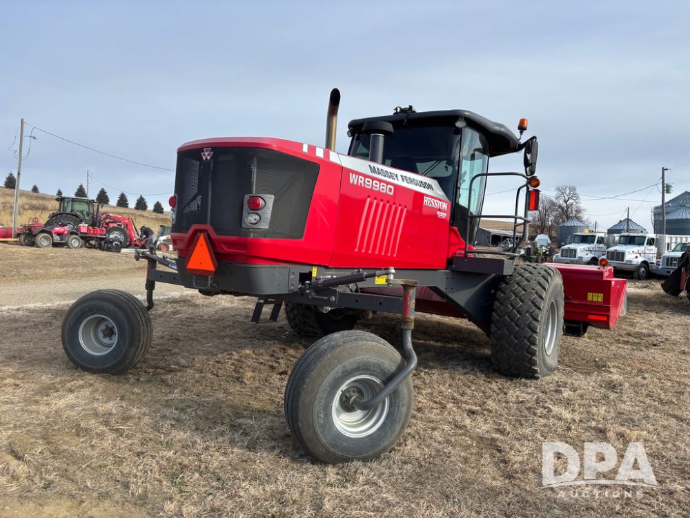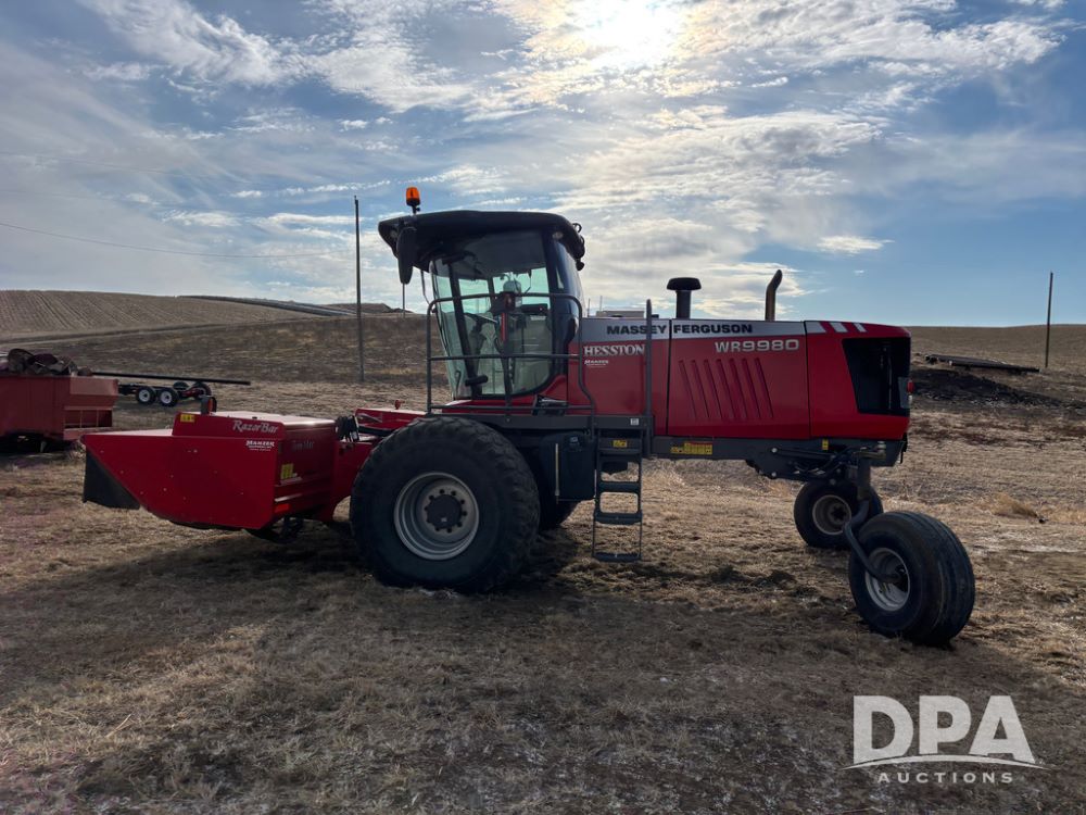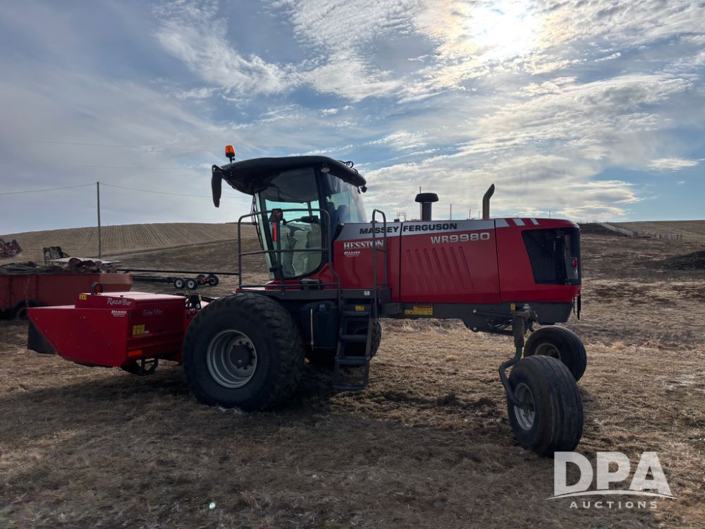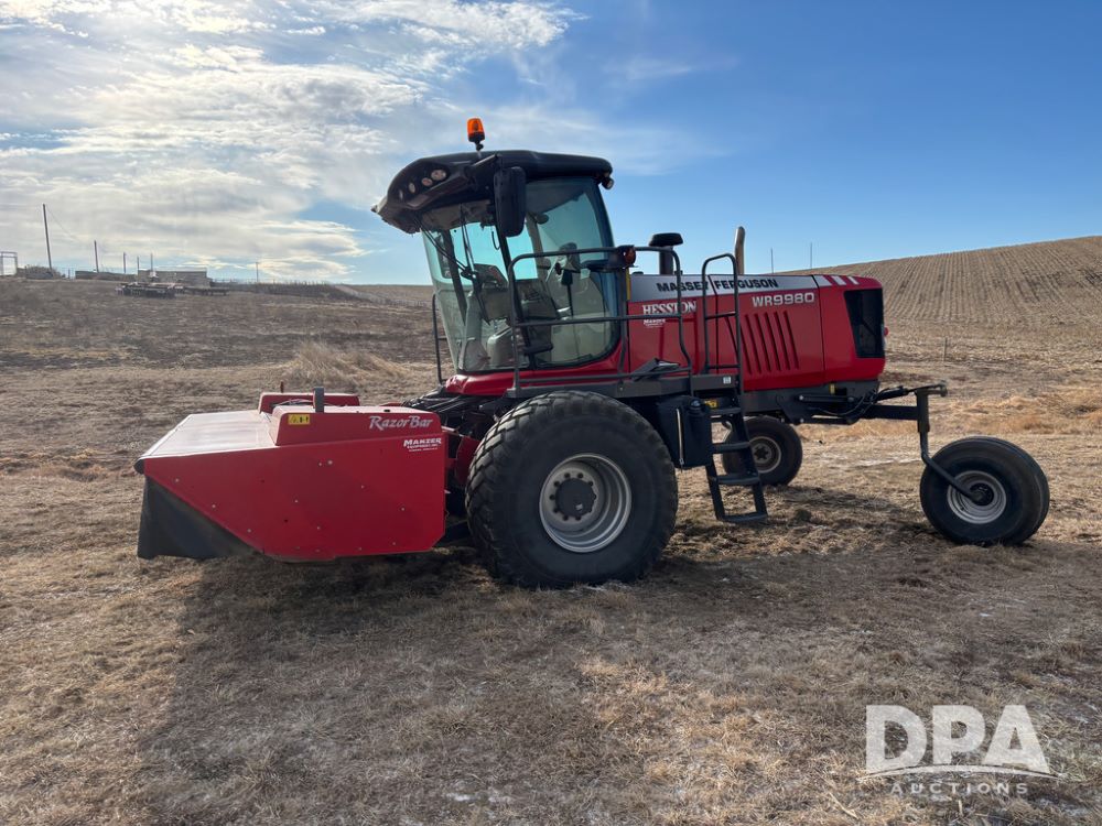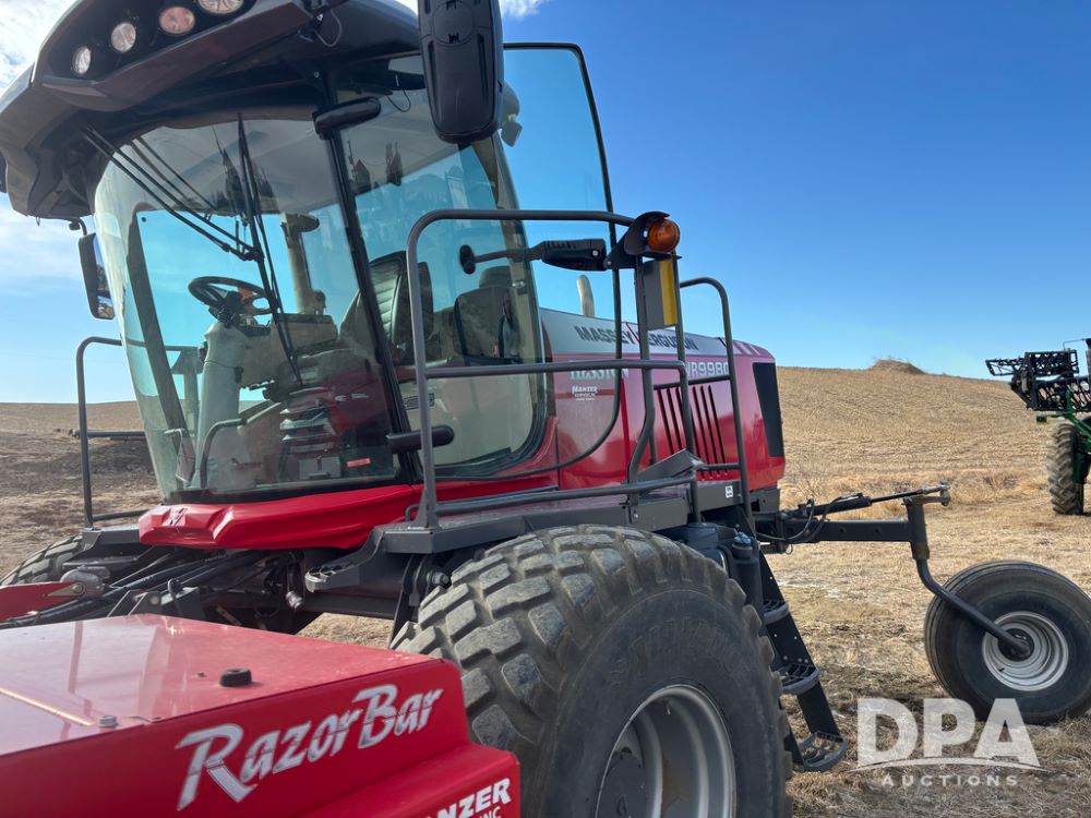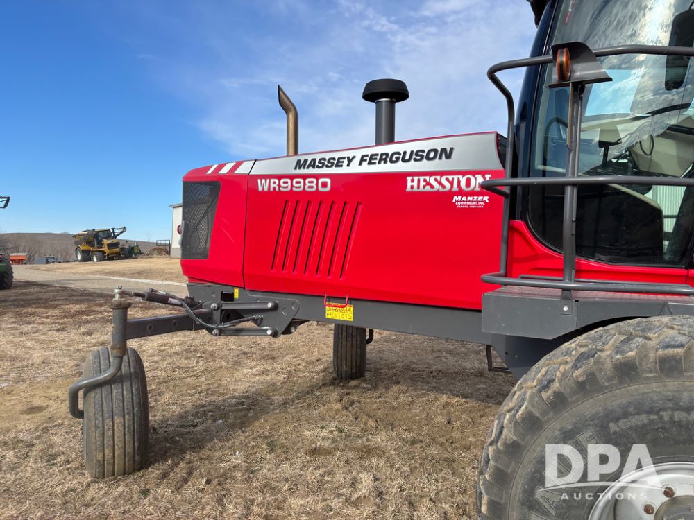 2021 Massey Ferguson WR9980 Windrower (DR13206), diesel engine, hydrostatic drive, 16' Razor Bar hydraulic disc draper head, all NEW turtles and skid plate, active operator seat, digital display, cab heat/air conditioning, AM/FM CD radio, 16.5L-16.15 rear tires, 620/75R26 front tires, 691 engine hours & 537 header hours.