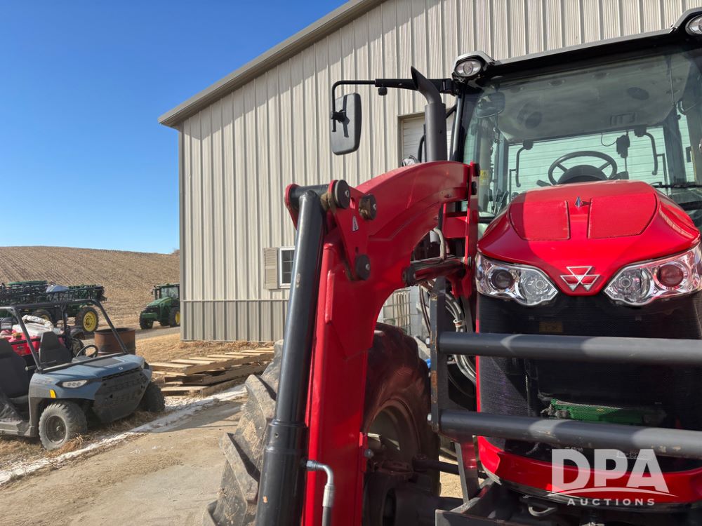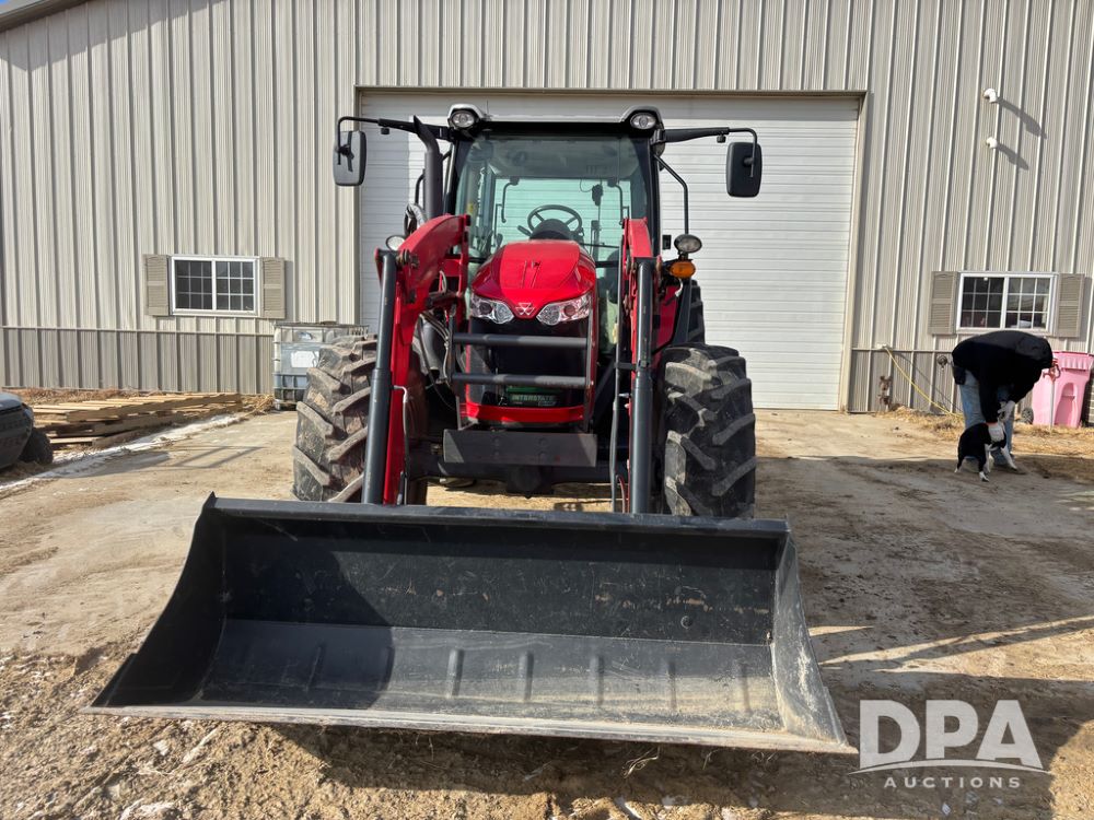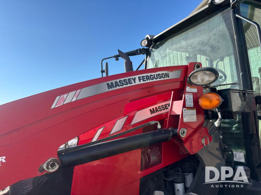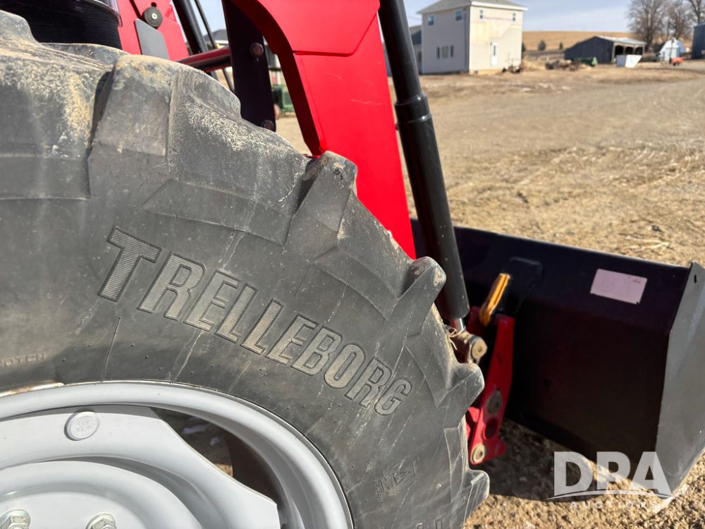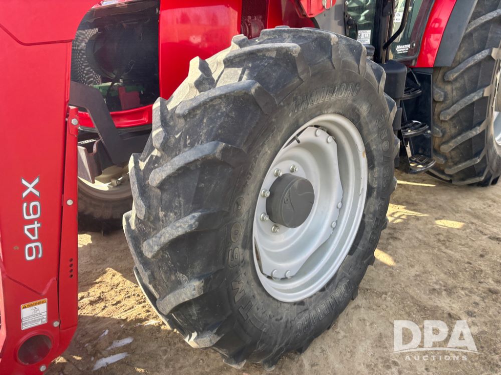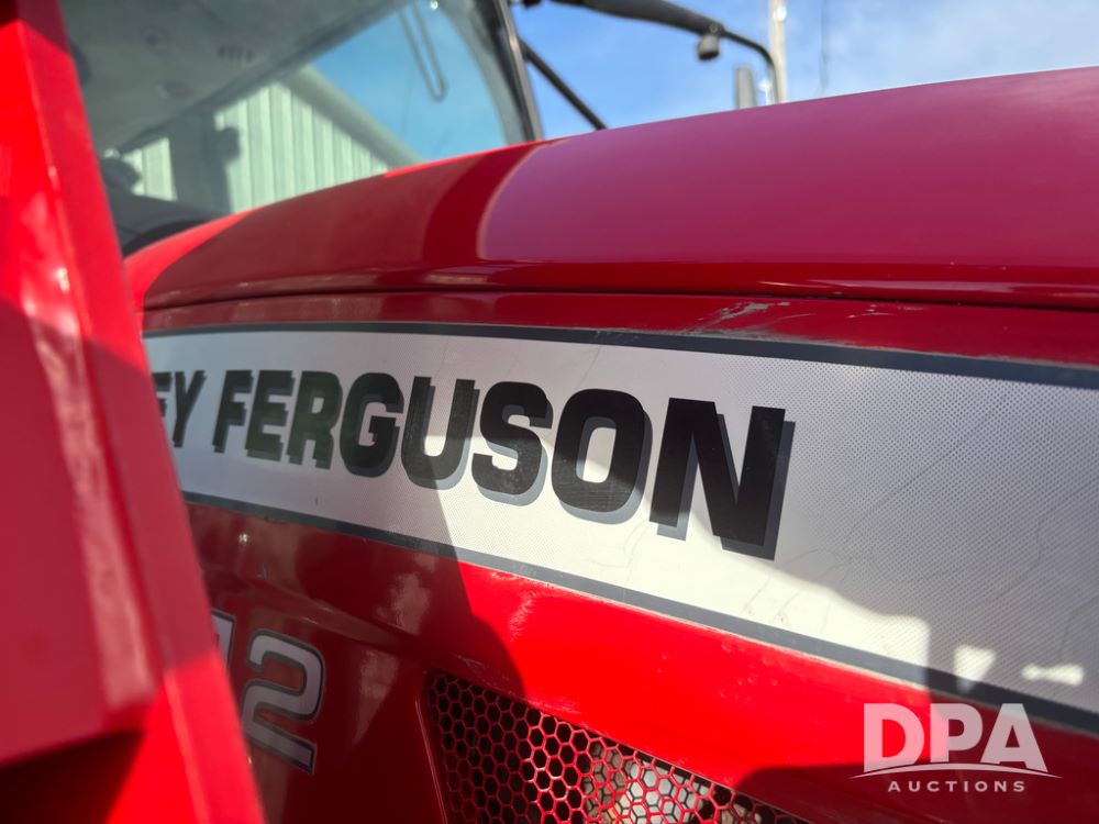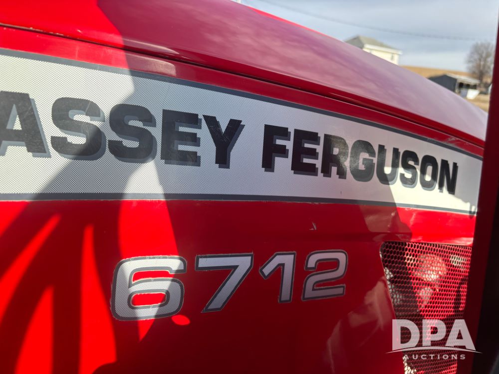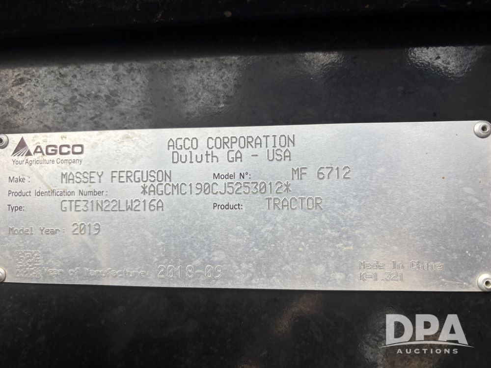 2019 Massey Ferguson 6712 MFWD Tractor (DR13207), 120hp diesel engine, 12X12 power shuttle transmission, Massey 9465X hydraulic quick mount front end loader, w/single point hookup, front bucket is hardly used, rear 3 point hitch, Joystick cab controls, rear PTO, triple remote hydraulic outlets, MFWD, cab heat/air conditioning, buddy seat, AM/FM CD radio, 460/85R38 rear tires, Trelleborg 14.9R28 front tires w/fenders, shows 2,175 hours.
