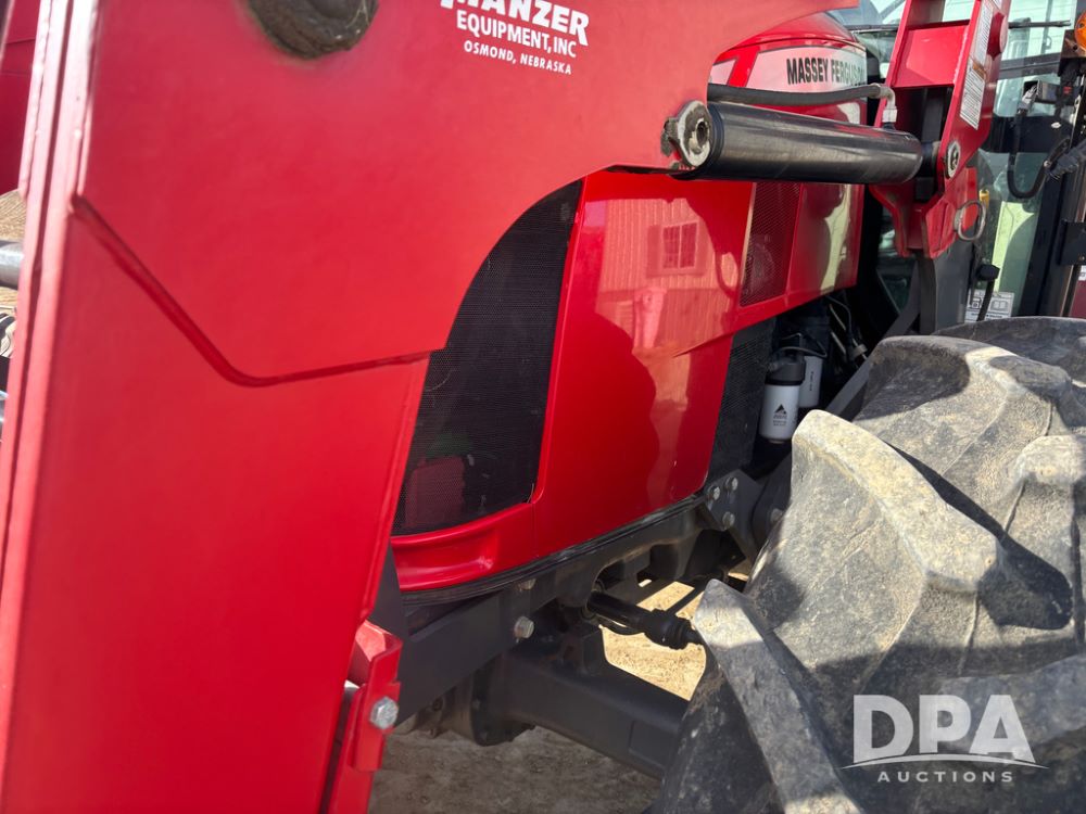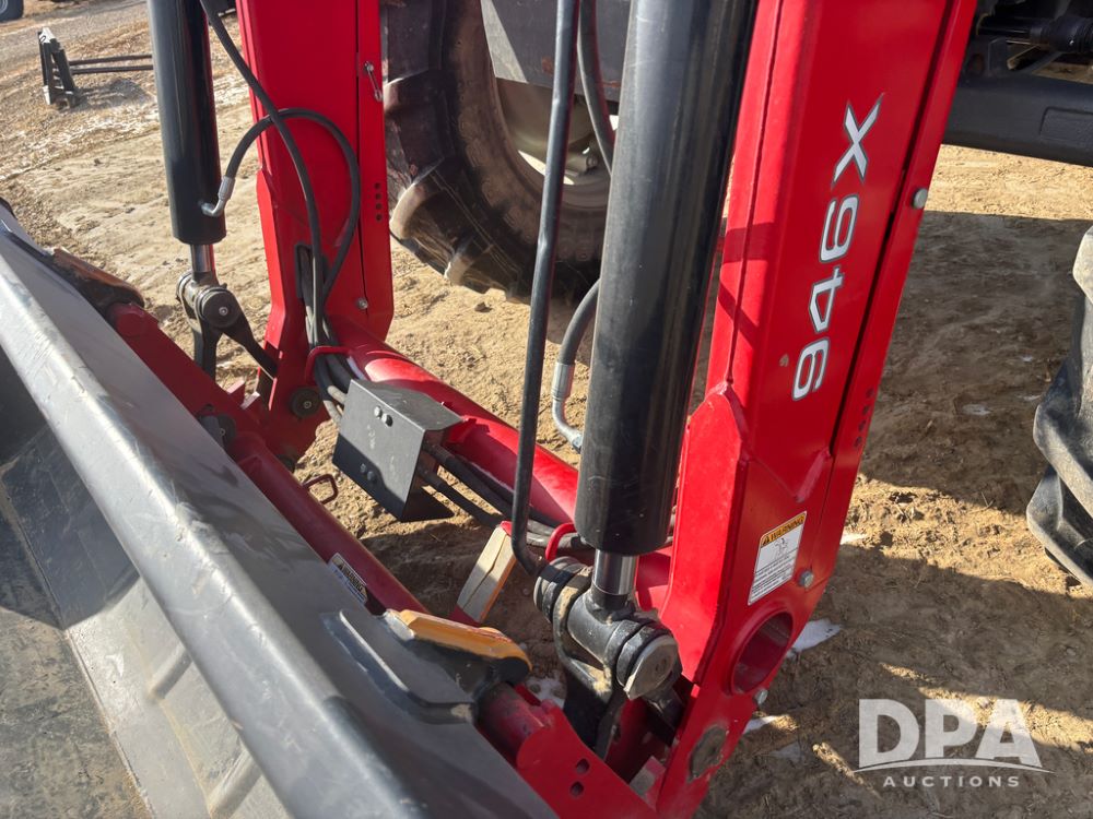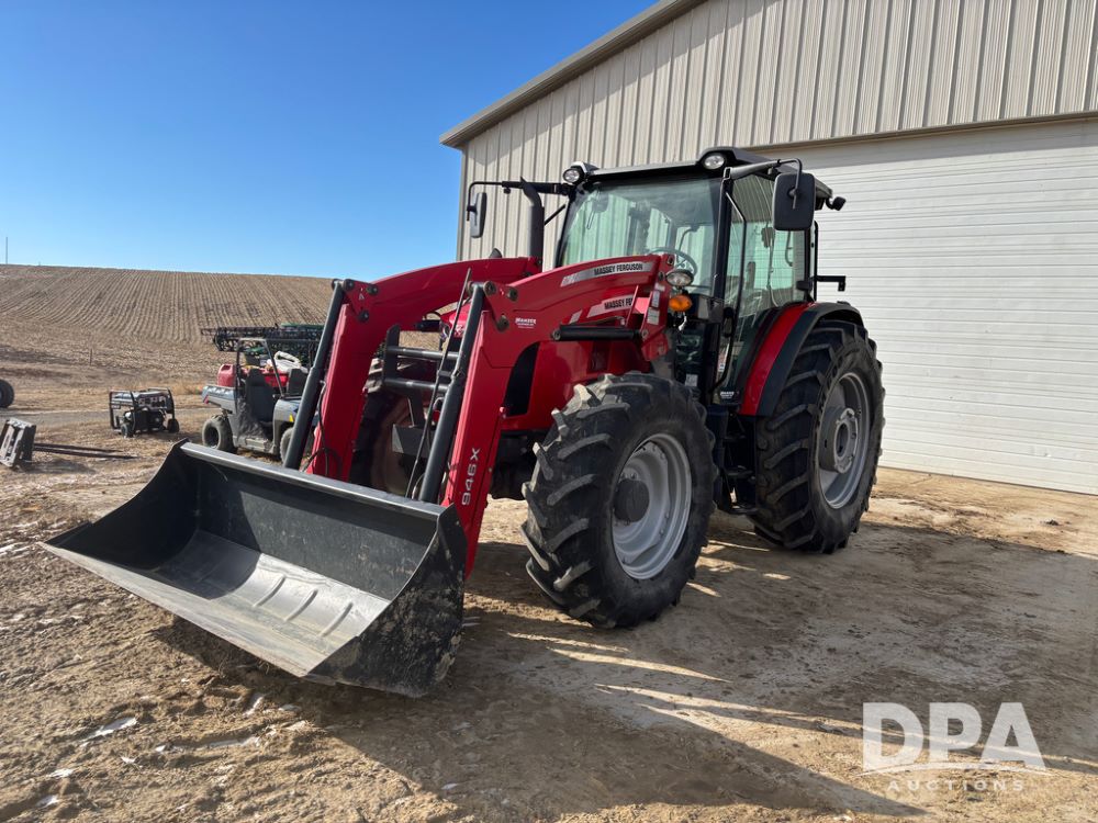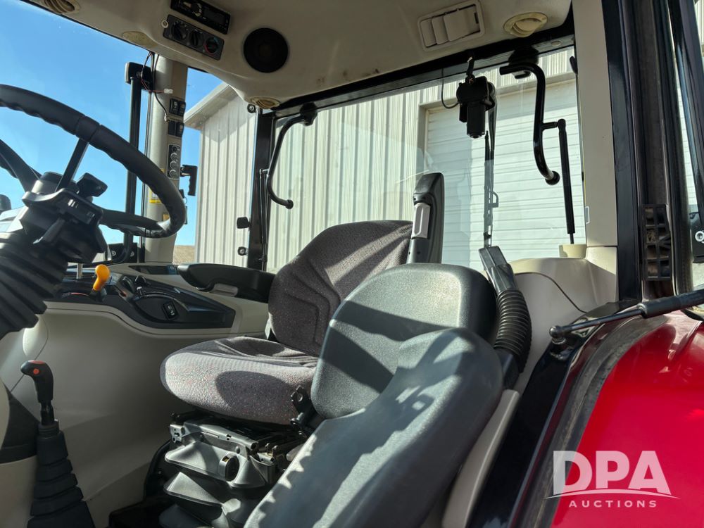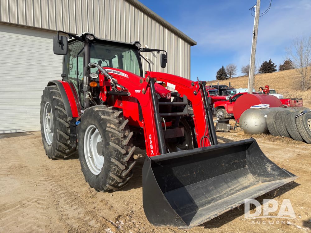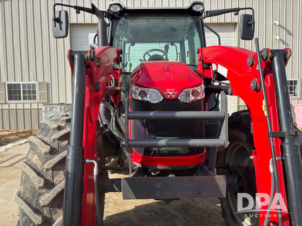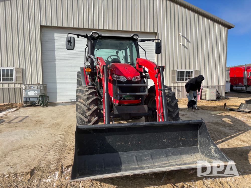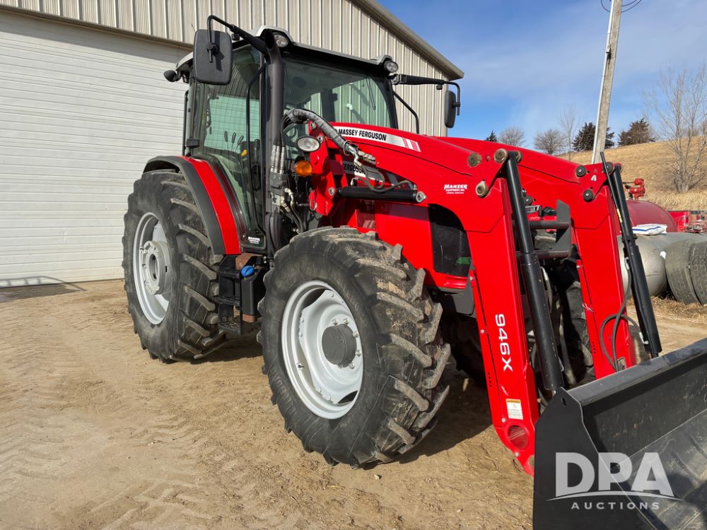 2019 Massey Ferguson 6712 MFWD Tractor (DR13207), 120hp diesel engine, 12X12 power shuttle transmission, Massey 9465X hydraulic quick mount front end loader, w/single point hookup, front bucket is hardly used, rear 3 point hitch, Joystick cab controls, rear PTO, triple remote hydraulic outlets, MFWD, cab heat/air conditioning, buddy seat, AM/FM CD radio, 460/85R38 rear tires, Trelleborg 14.9R28 front tires w/fenders, shows 2,175 hours.