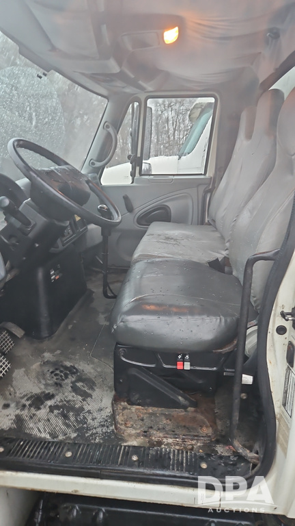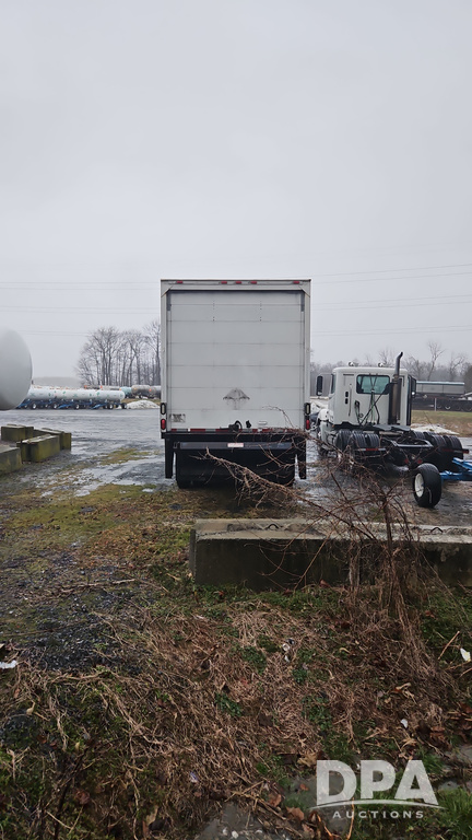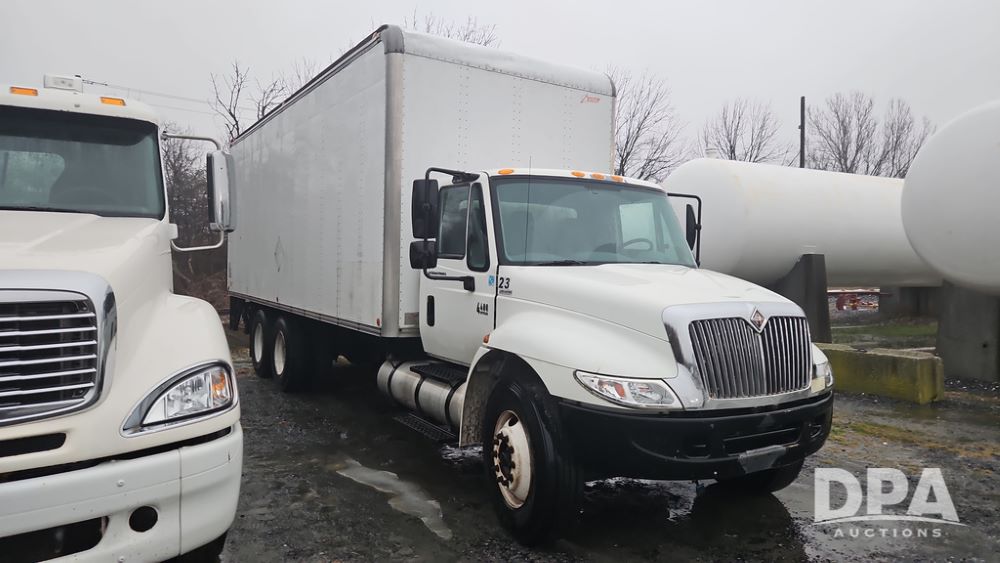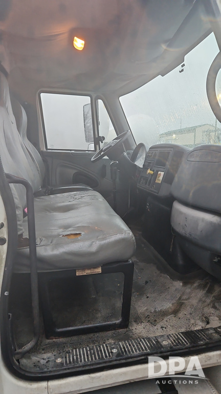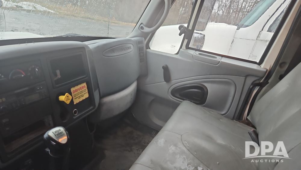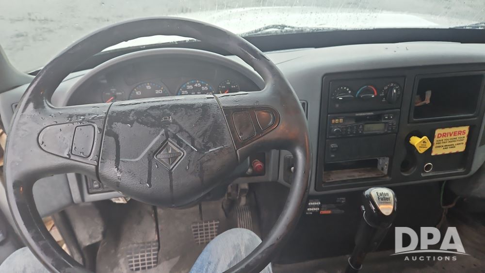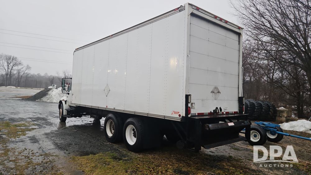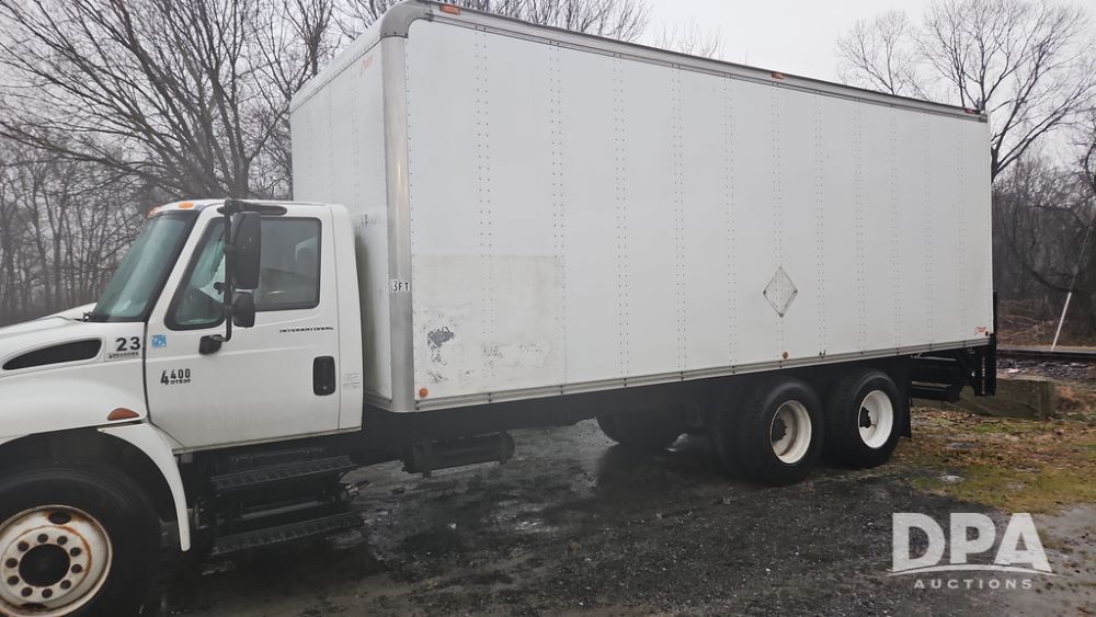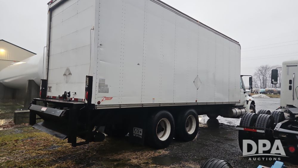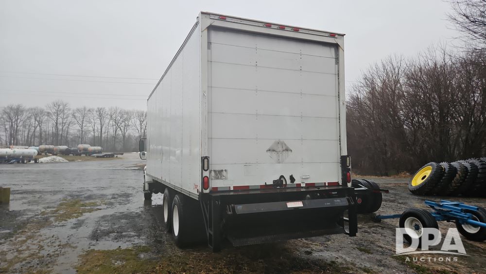 2003 IHC 4400 Van Truck (PZ14482, Unit 37266), DT530 diesel engine, Eaton Fuller transmission, heat, Am/Fm radio, tandem axle, Van body, rear roll up door, lift gate, 11R22.5 tires, shows 169,323 miles.