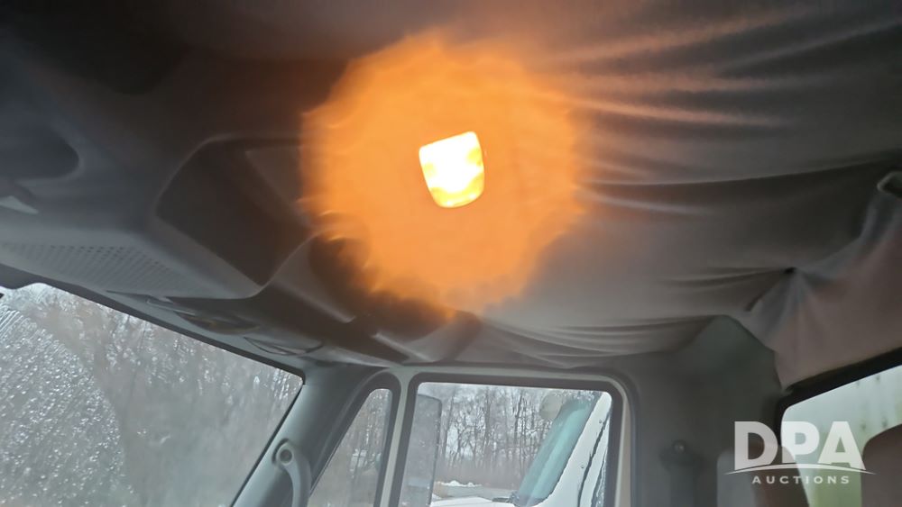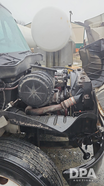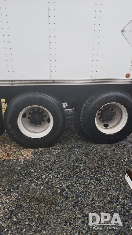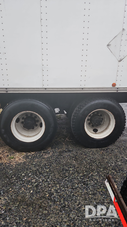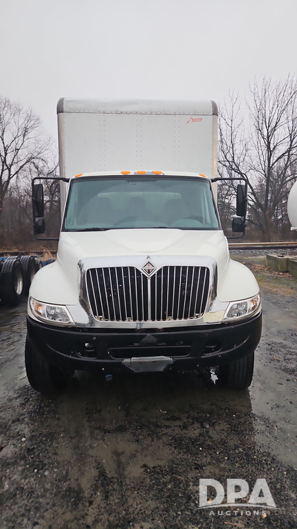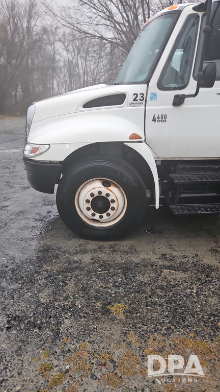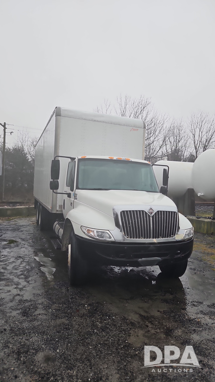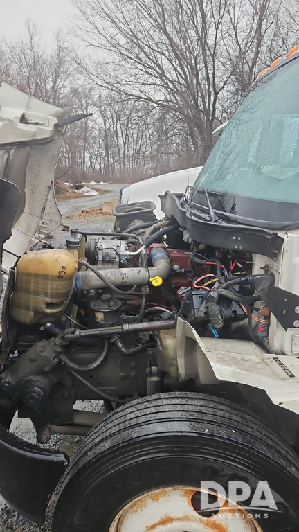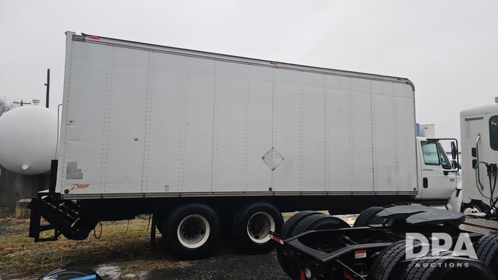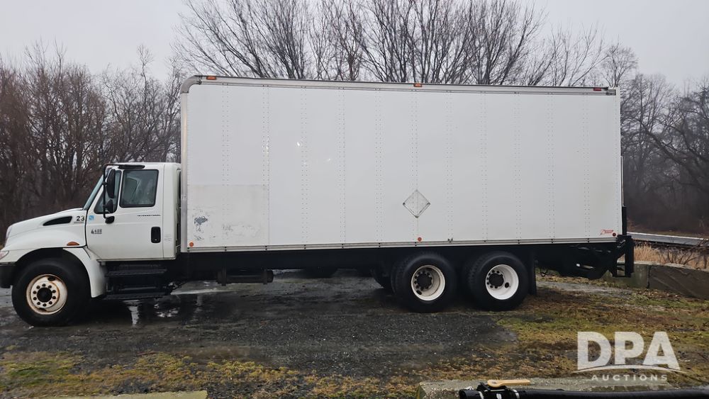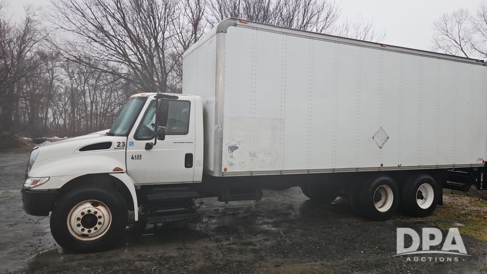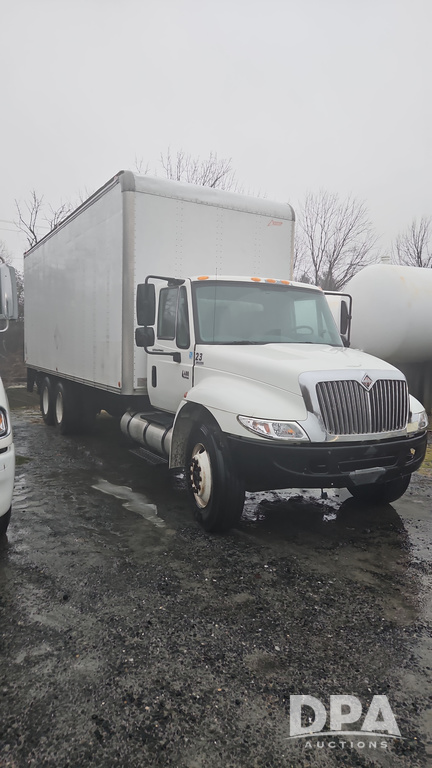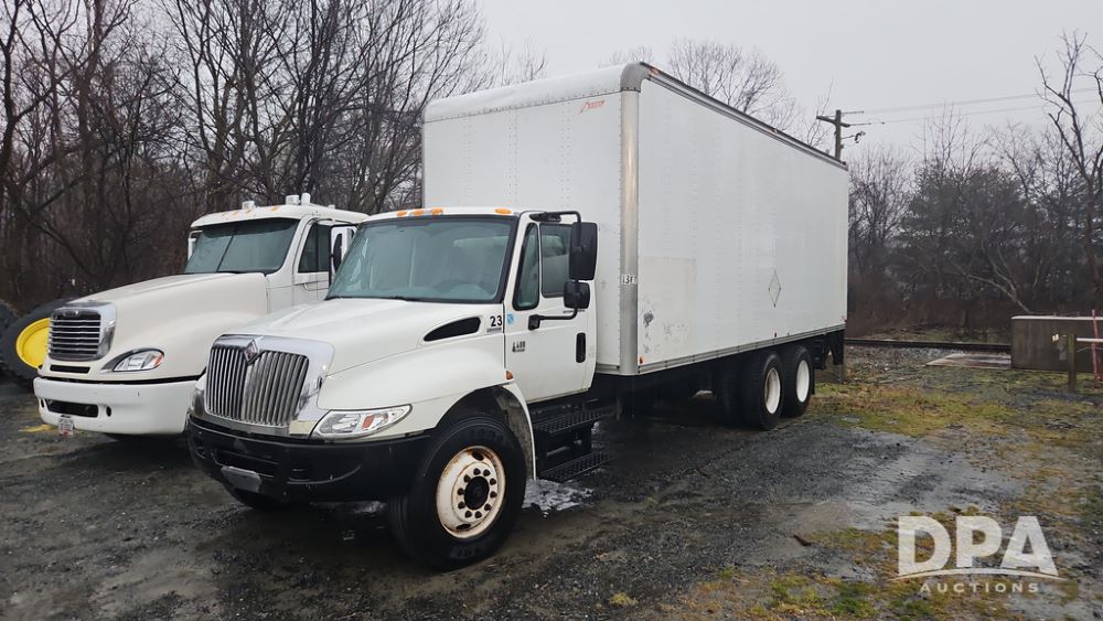 2003 IHC 4400 Van Truck (PZ14482, Unit 37266), DT530 diesel engine, Eaton Fuller transmission, heat, Am/Fm radio, tandem axle, Van body, rear roll up door, lift gate, 11R22.5 tires, shows 169,323 miles.
