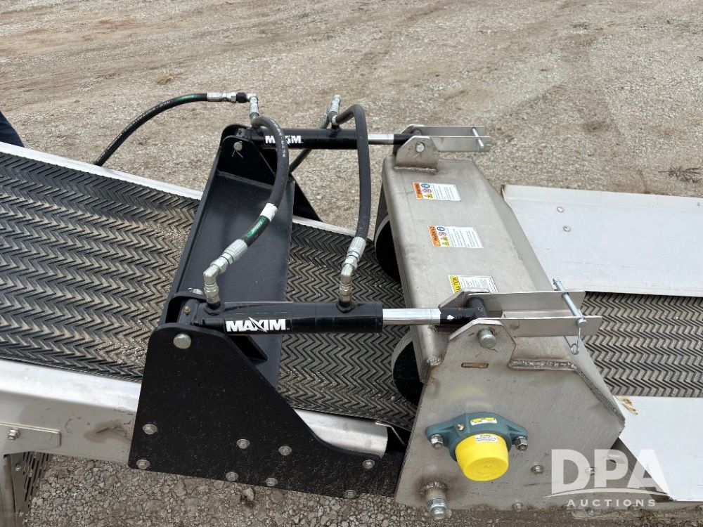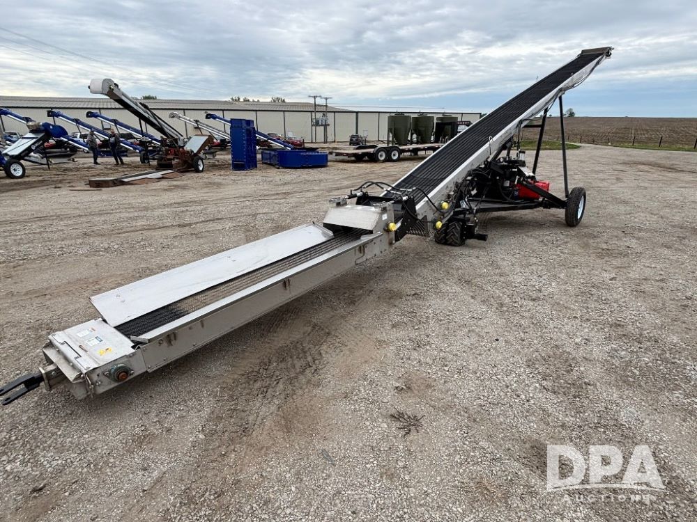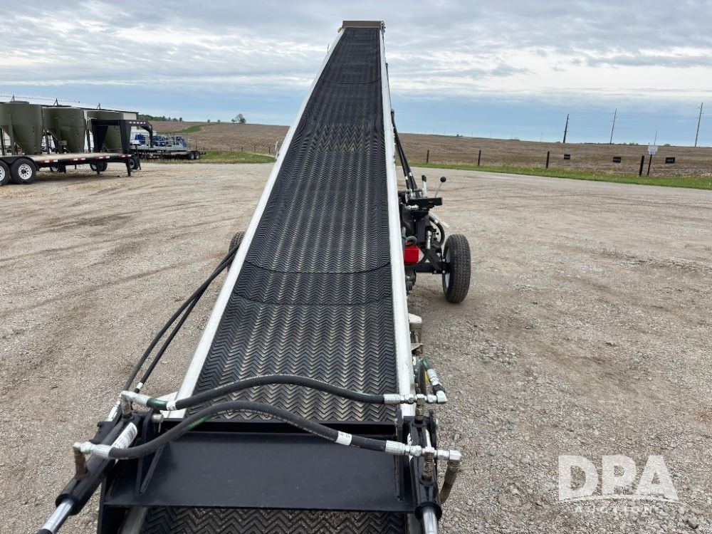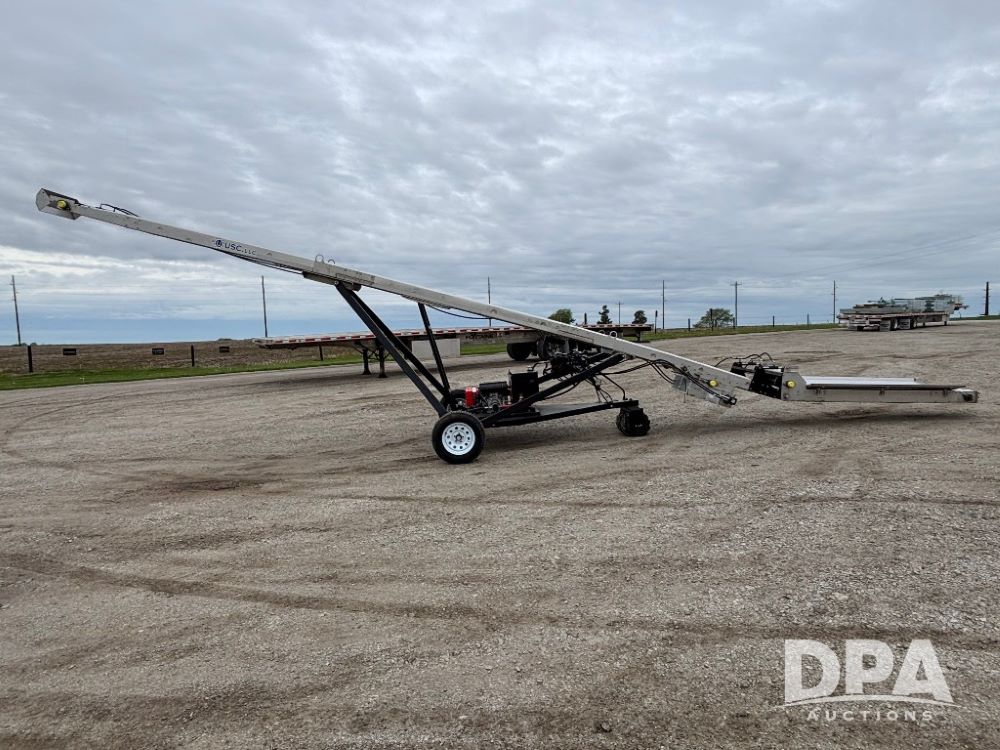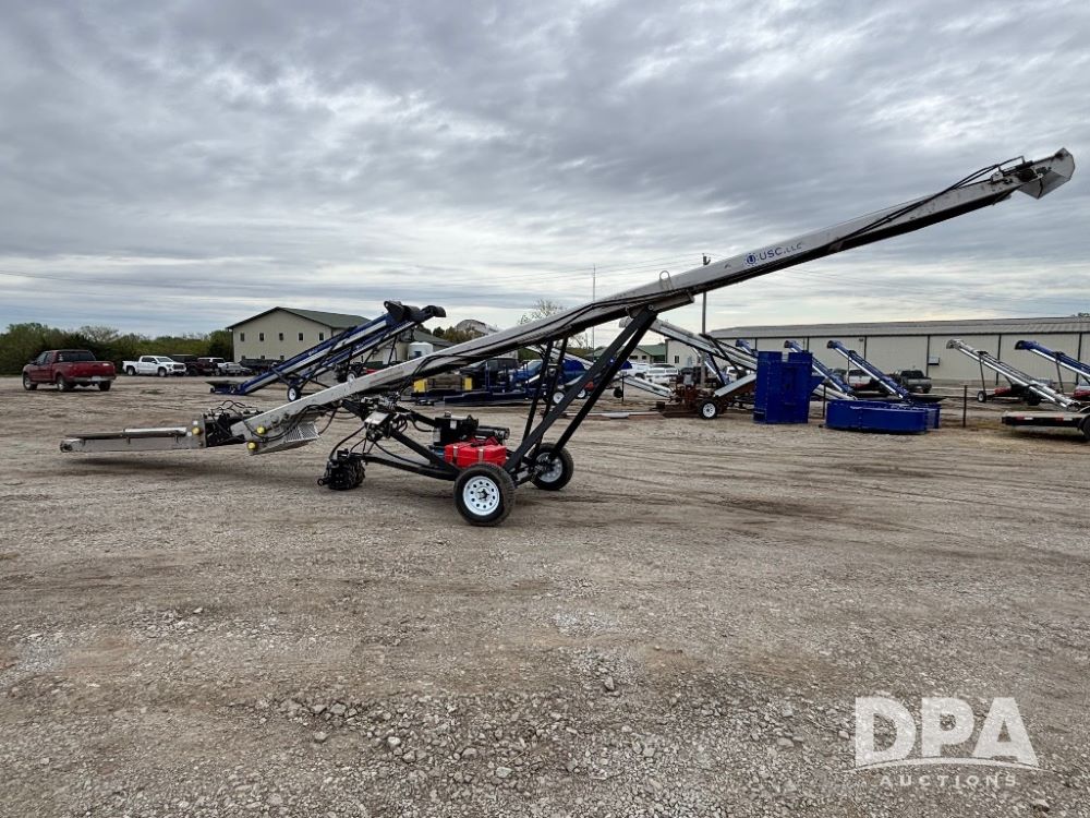 2026 USC PFL75M35S00UC Open Top Self-Mover Conveyor (NP6545), this is a pan-style 35 foot long conveyor featuring a stainless steel body paired with a carbon steel undercarriage, powered by a reliable Kohler 20HP gas engine and includes a gas-driven hydraulic pack, low profile design with travel height as low as 11' 1", 24" wide Chevron belt, hydraulic tail section for easier positioning at the inlet, hydraulic discharge spout for flexible unloading angles, self-mover system with directional control for easier mobility, clevis hitch and jack stand included, heavy-duty ST205/75D15 tires, 1.5" Dodge bearings for smooth operation.