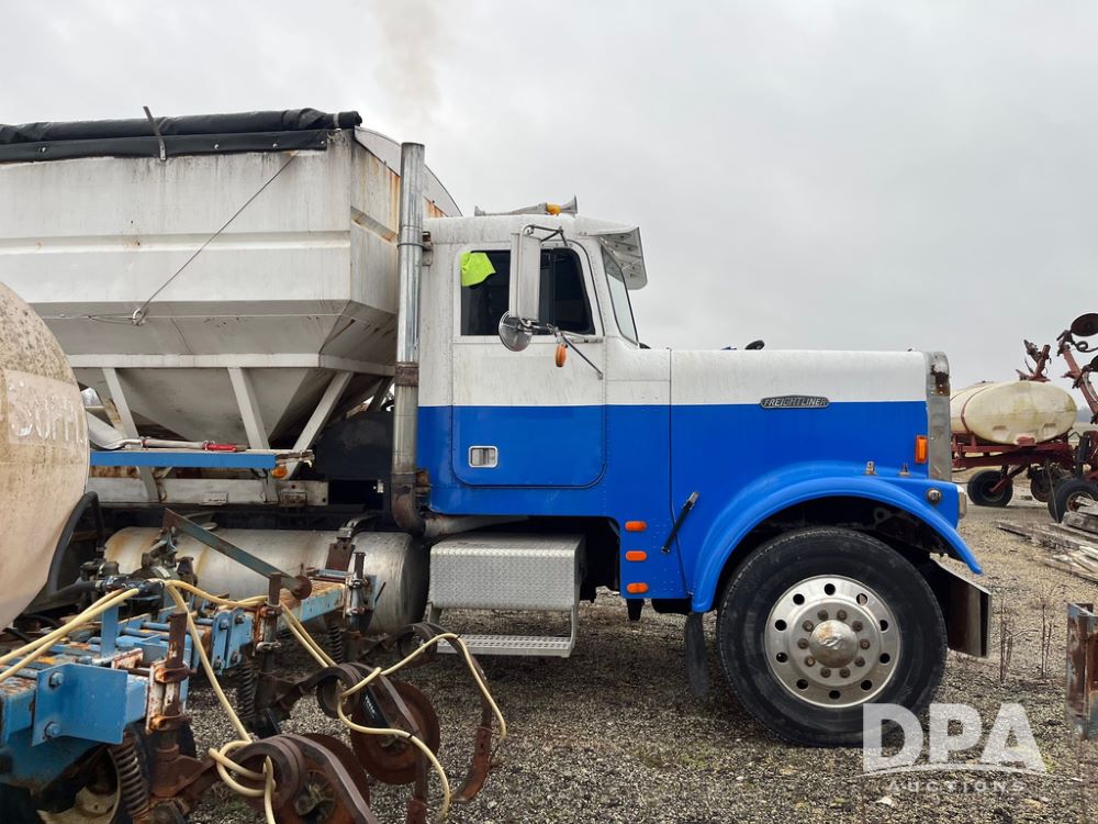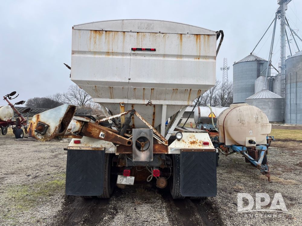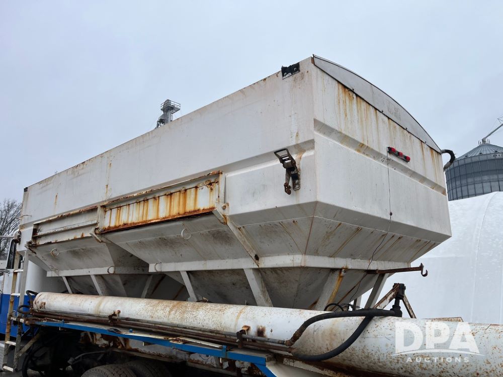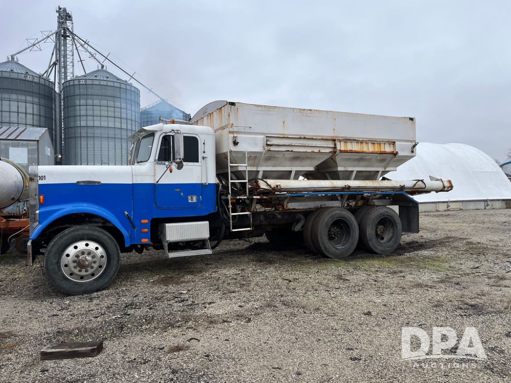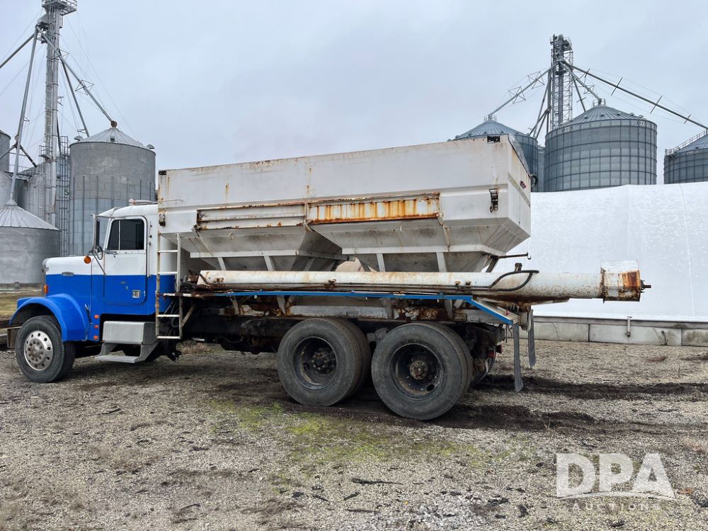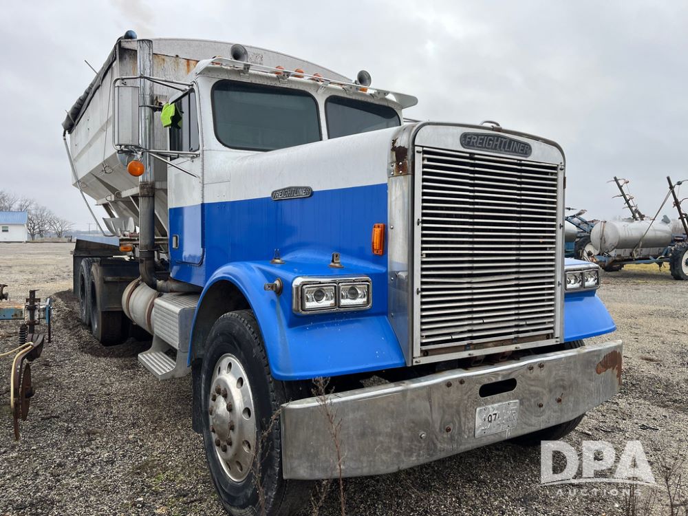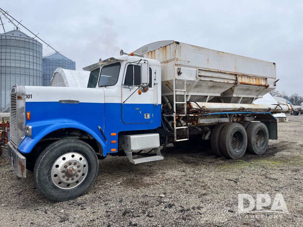 1988 Freightliner Tender Truck (JN4010), Cummins engine, Eaton Fuller transmission, 16 ton stainless steel fert bed, side discharge auger, 4 hoppers, roll tarp, tandem axle, 11R24.5 tires, shows 831,161 miles.