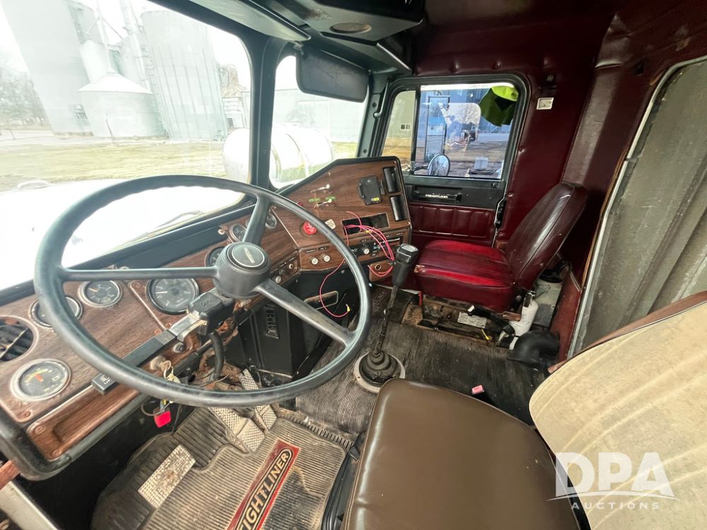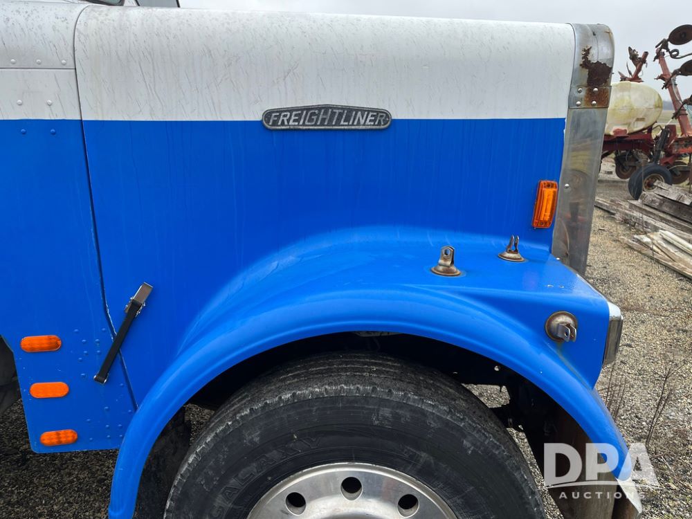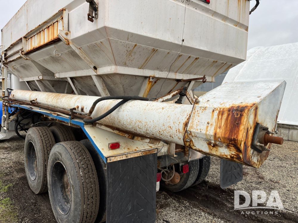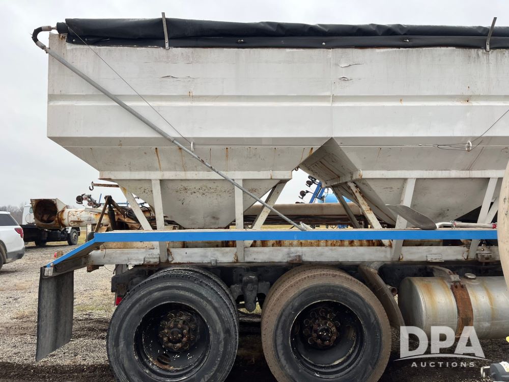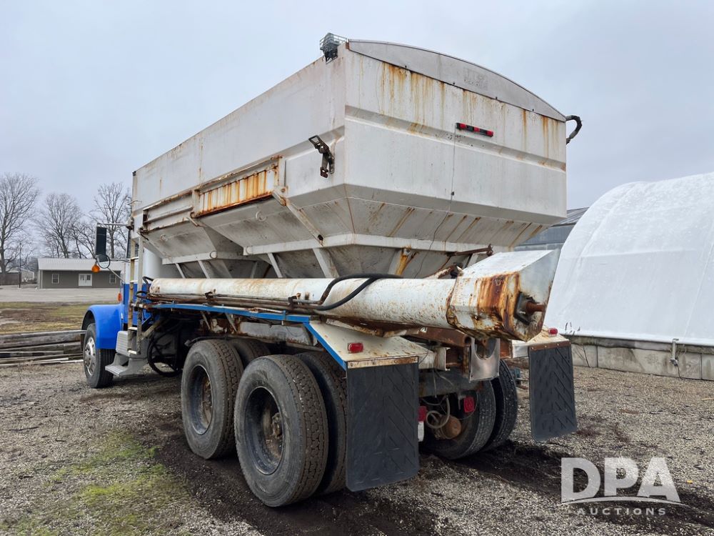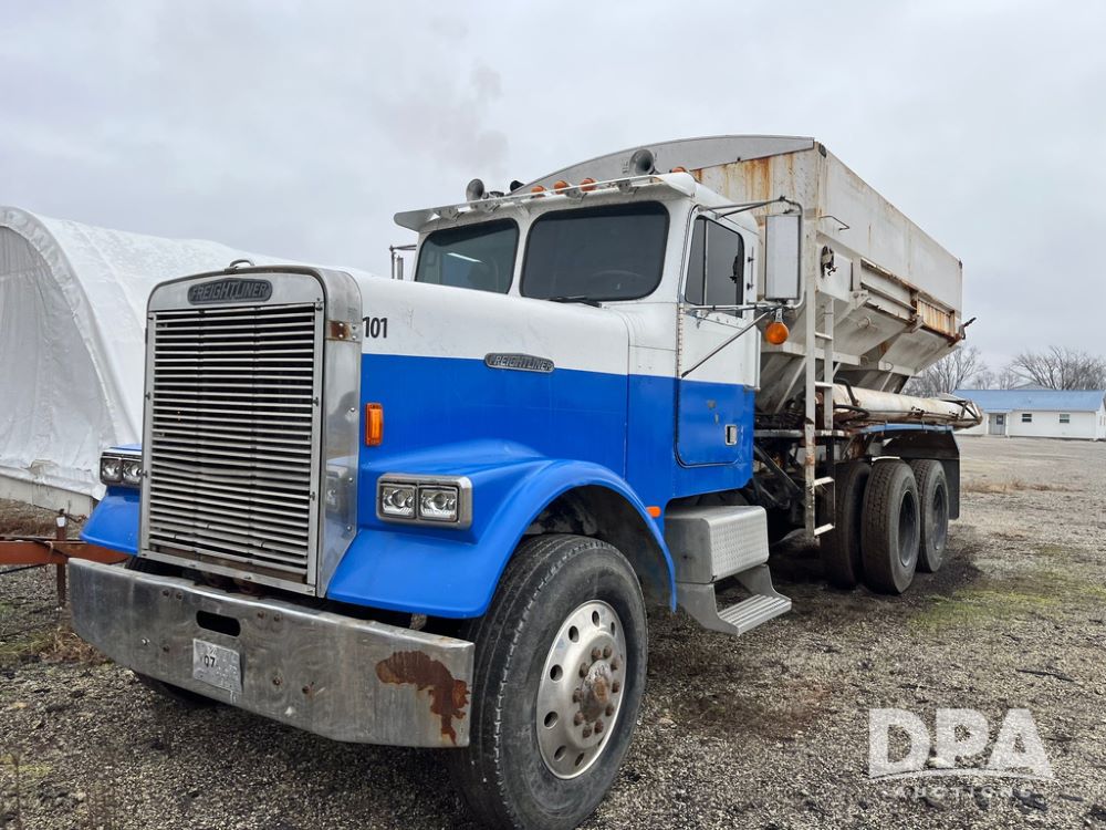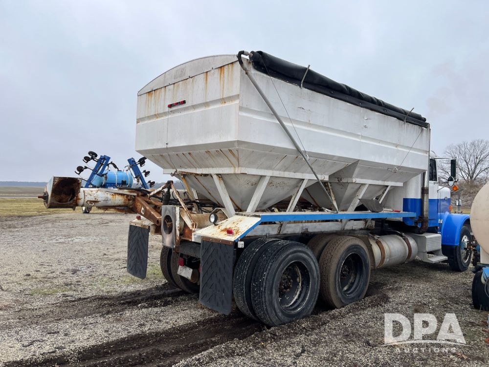 1988 Freightliner Tender Truck (JN4010), Cummins engine, Eaton Fuller transmission, 16 ton stainless steel fert bed, side discharge auger, 4 hoppers, roll tarp, tandem axle, 11R24.5 tires, shows 831,161 miles.