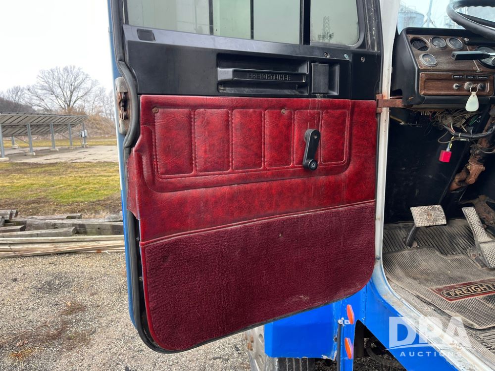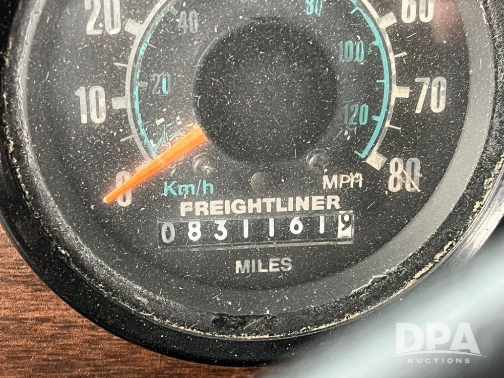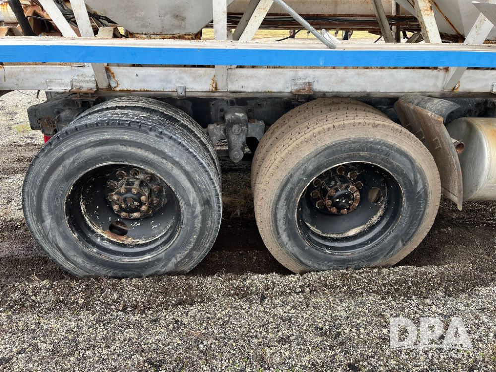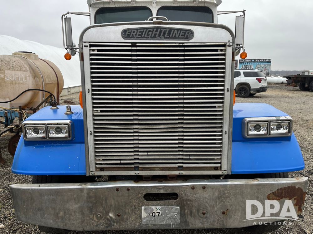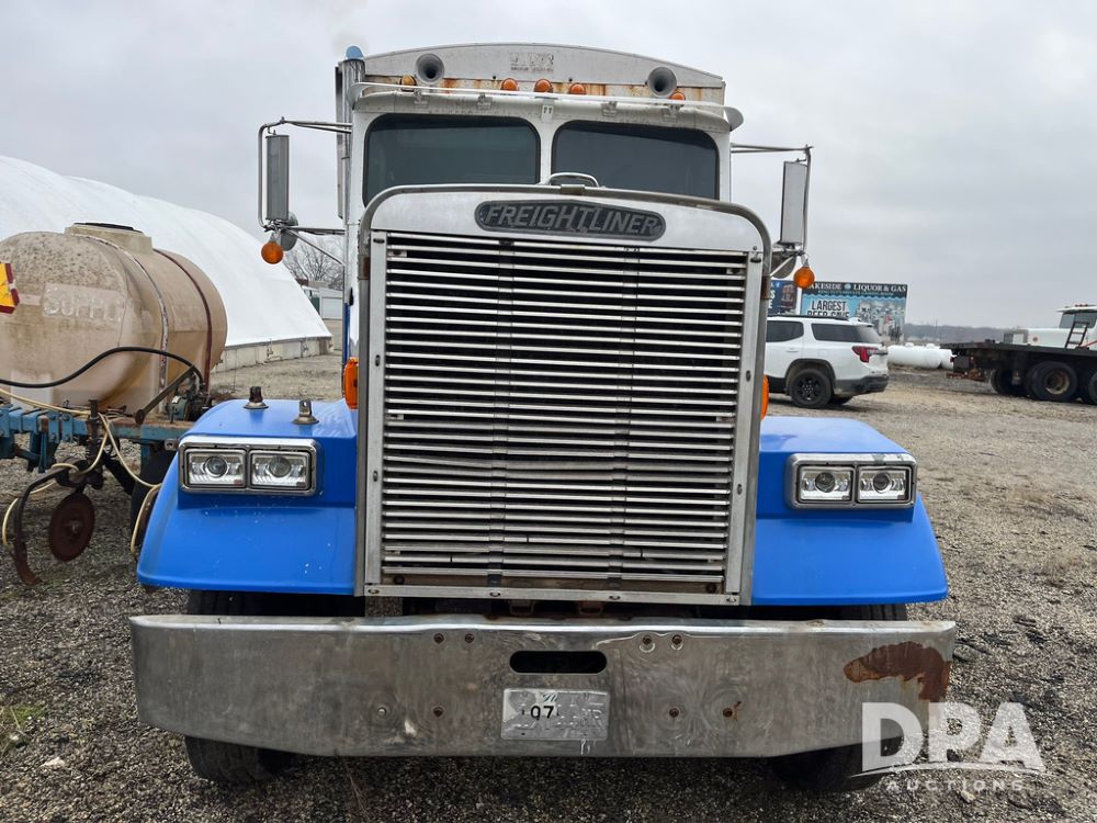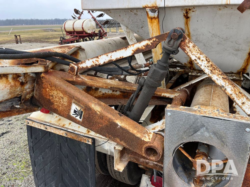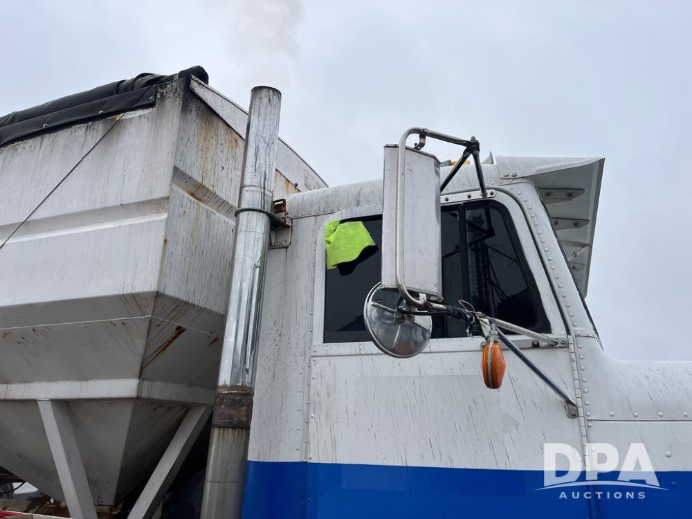 1988 Freightliner Tender Truck (JN4010), Cummins engine, Eaton Fuller transmission, 16 ton stainless steel fert bed, side discharge auger, 4 hoppers, roll tarp, tandem axle, 11R24.5 tires, shows 831,161 miles.