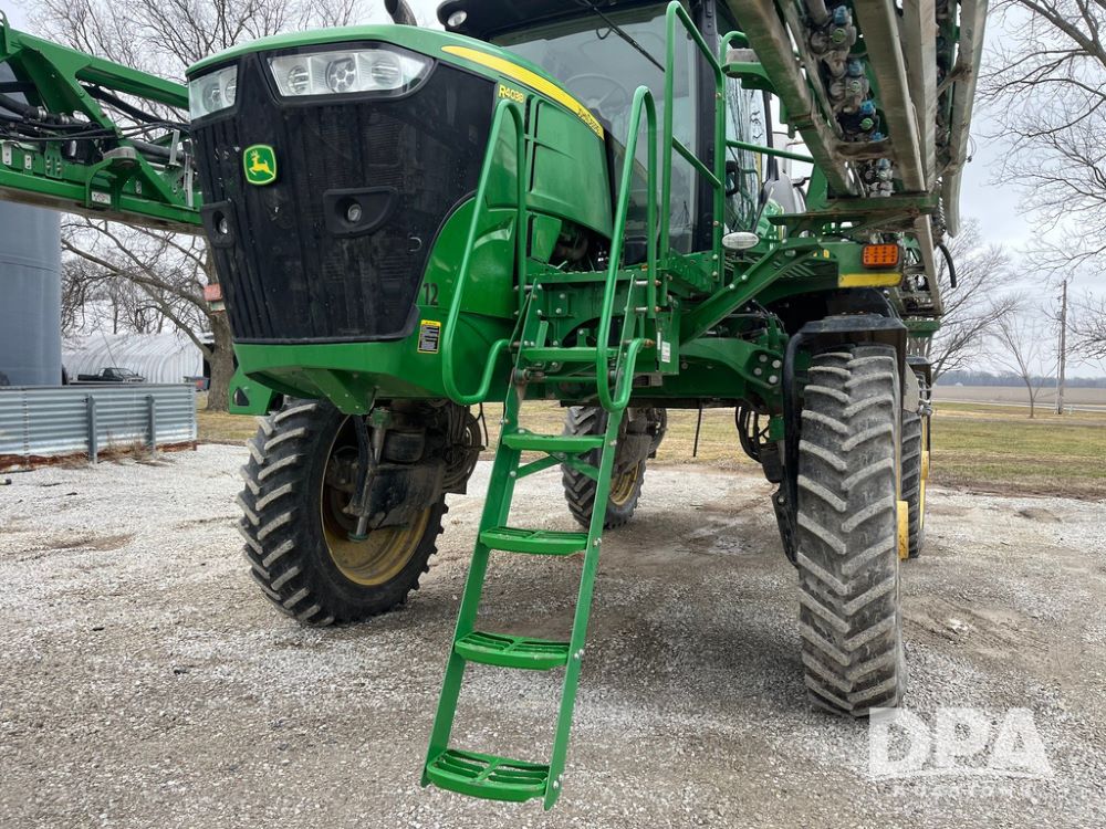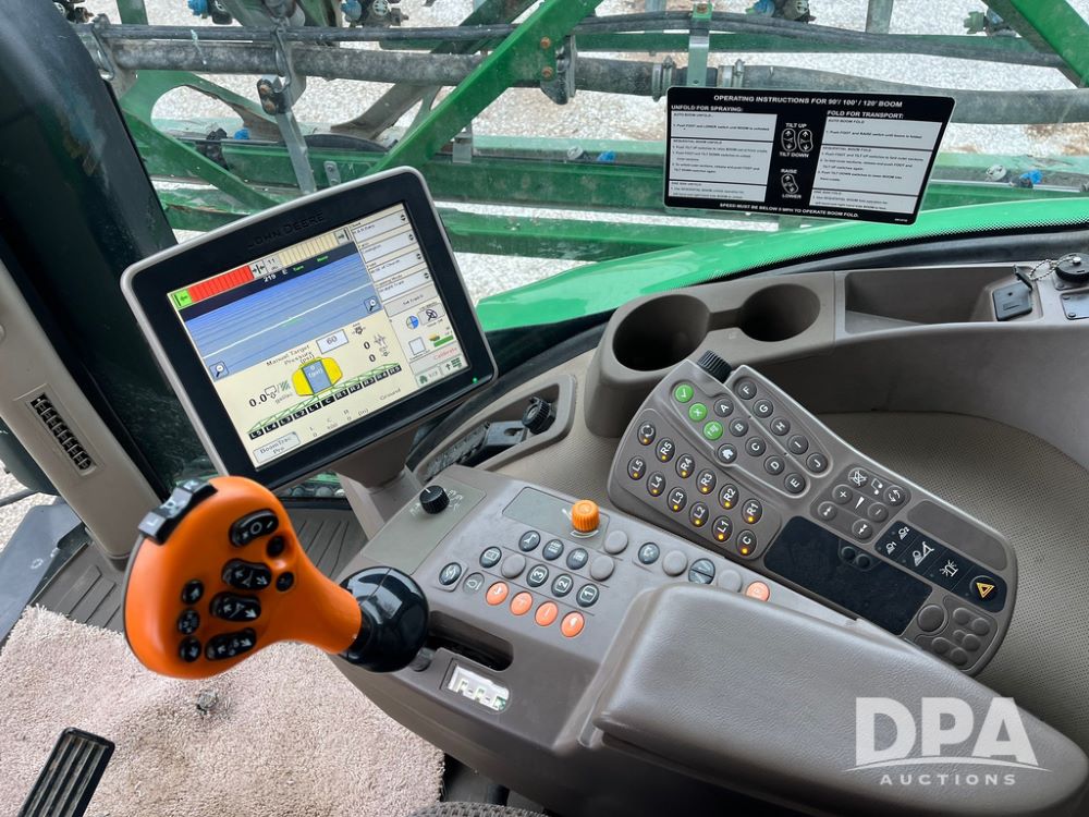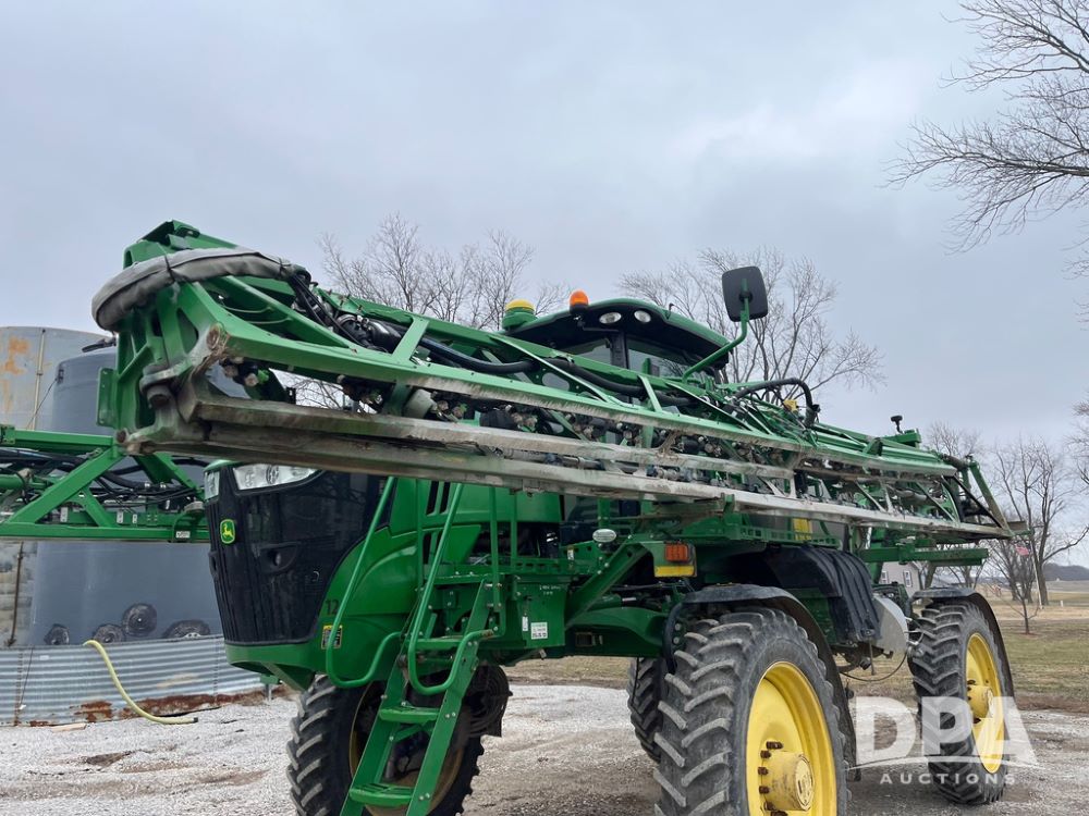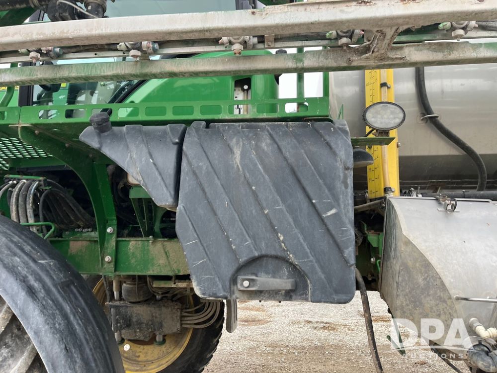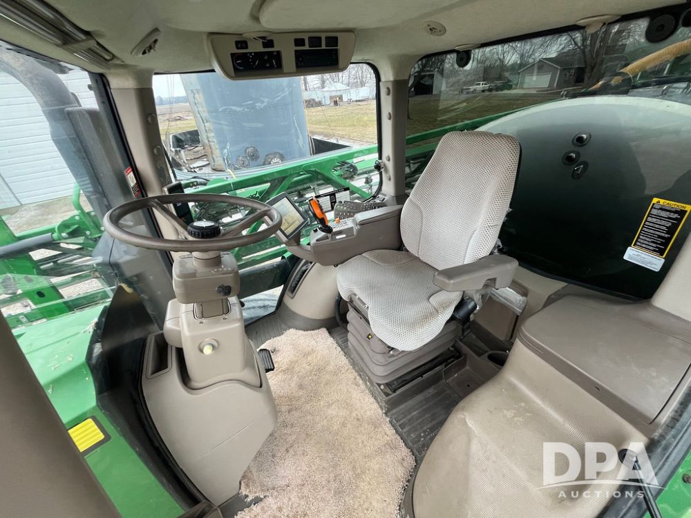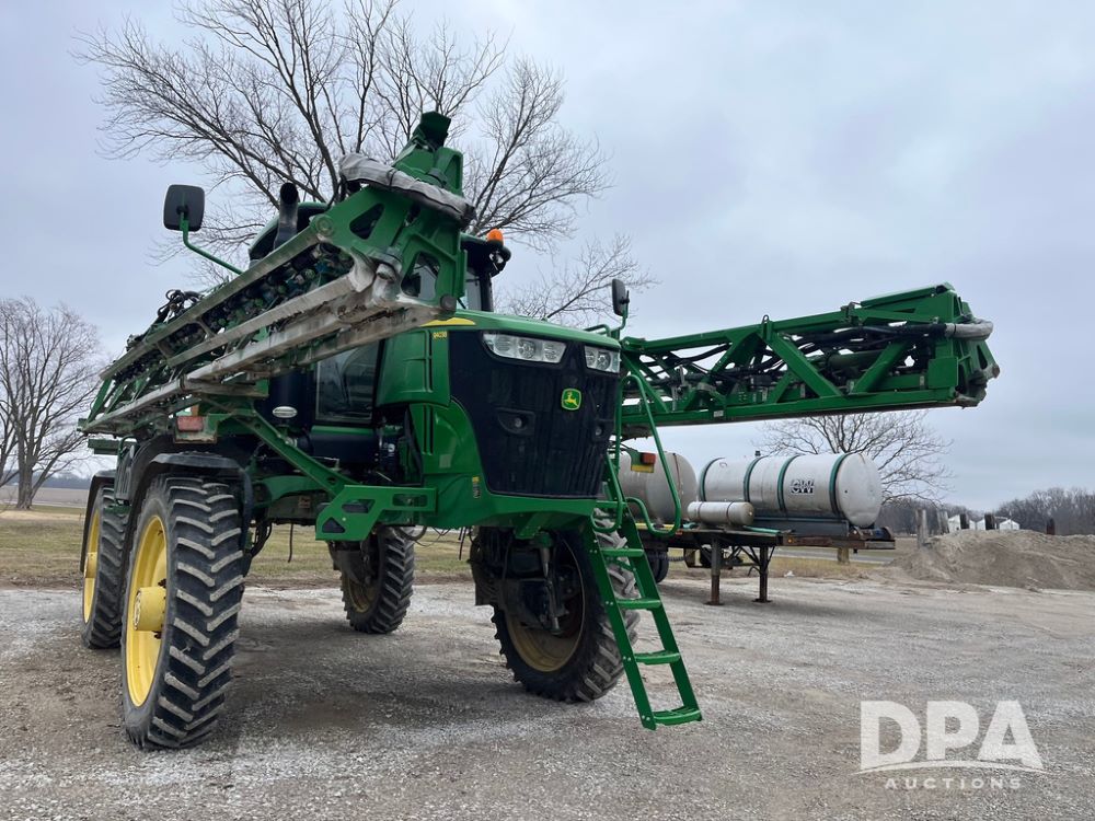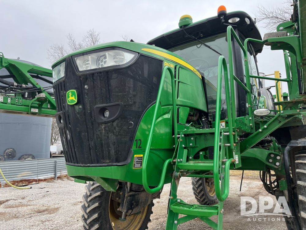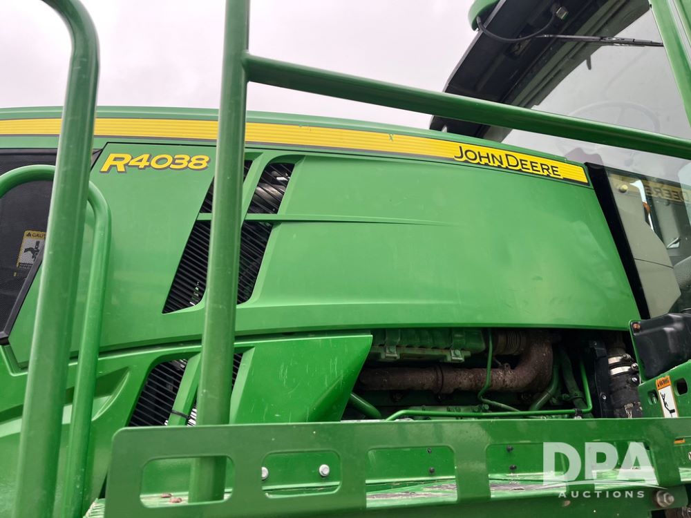 2017 John Deere R4038 Sprayer (JN4023), John Deere diesel engine (SN:RG6090U033585), hydrostatic transmission, heat, air conditioning, radio, 1,000 gallon stainless steel liquid system, 120' boom, 15" spacing, front fill, 380/90R46 row crop tires, fenders, StarFire 3000 globe, John Deere monitor, shows 3,494 hours.