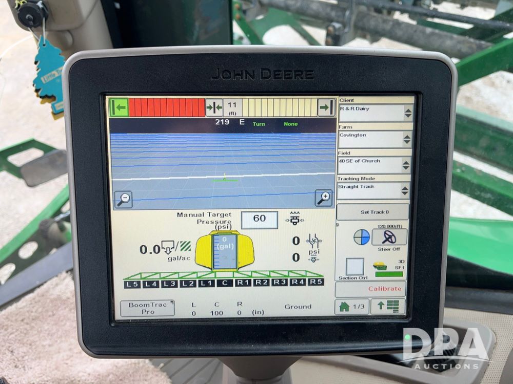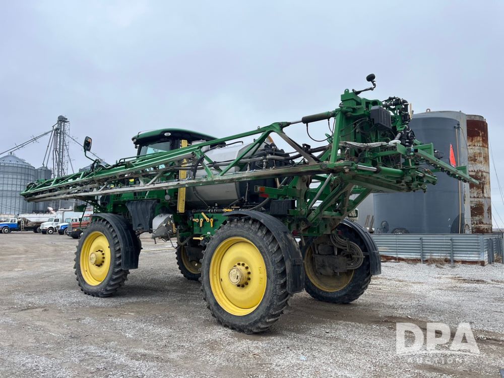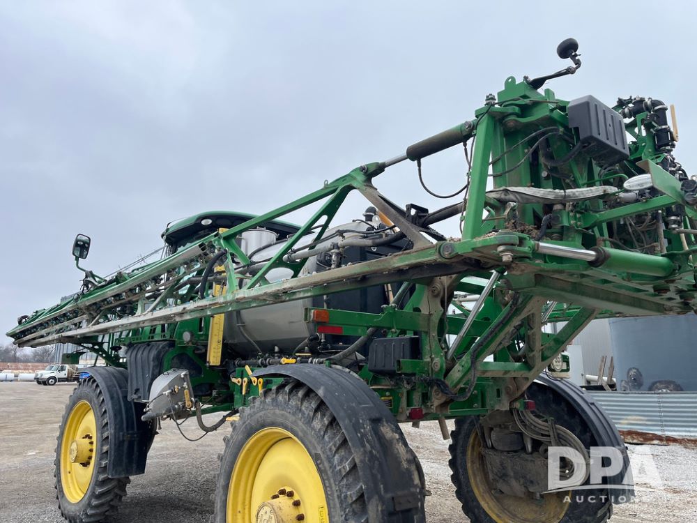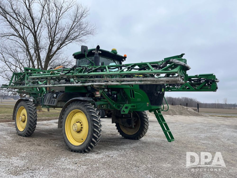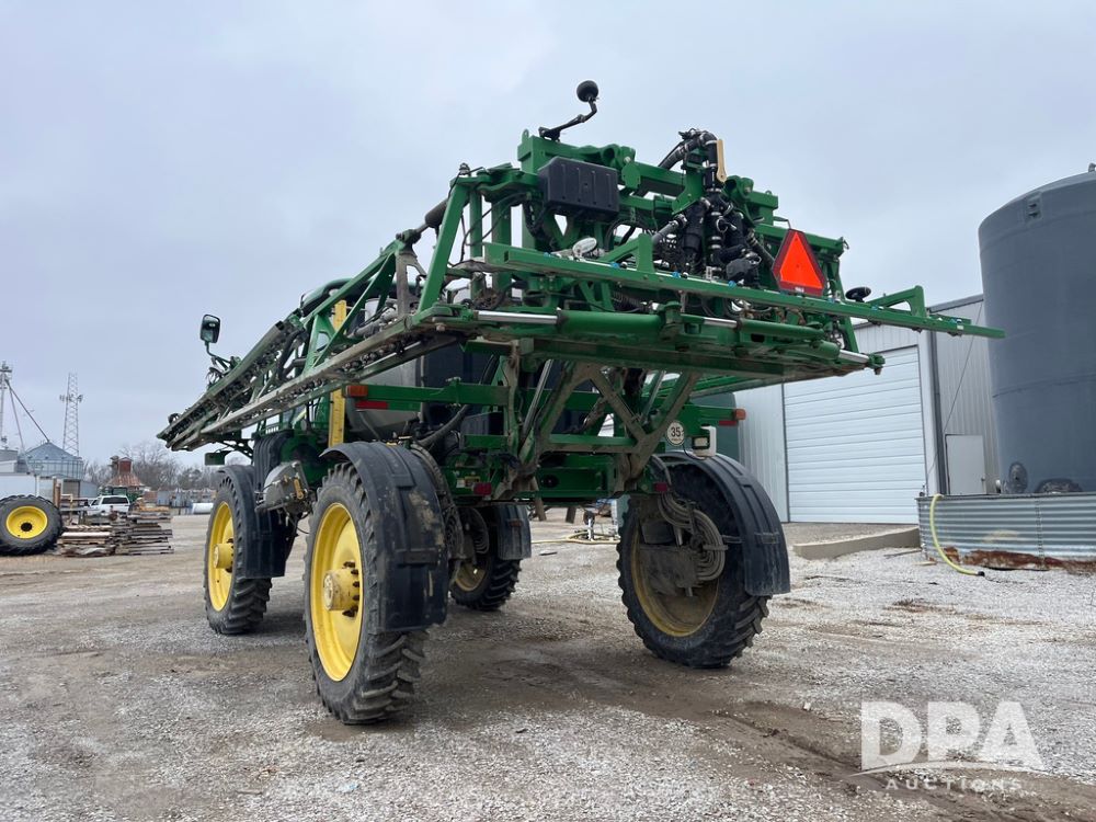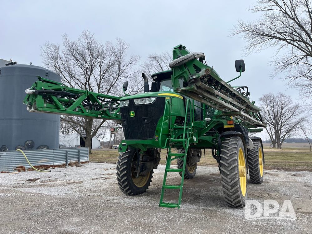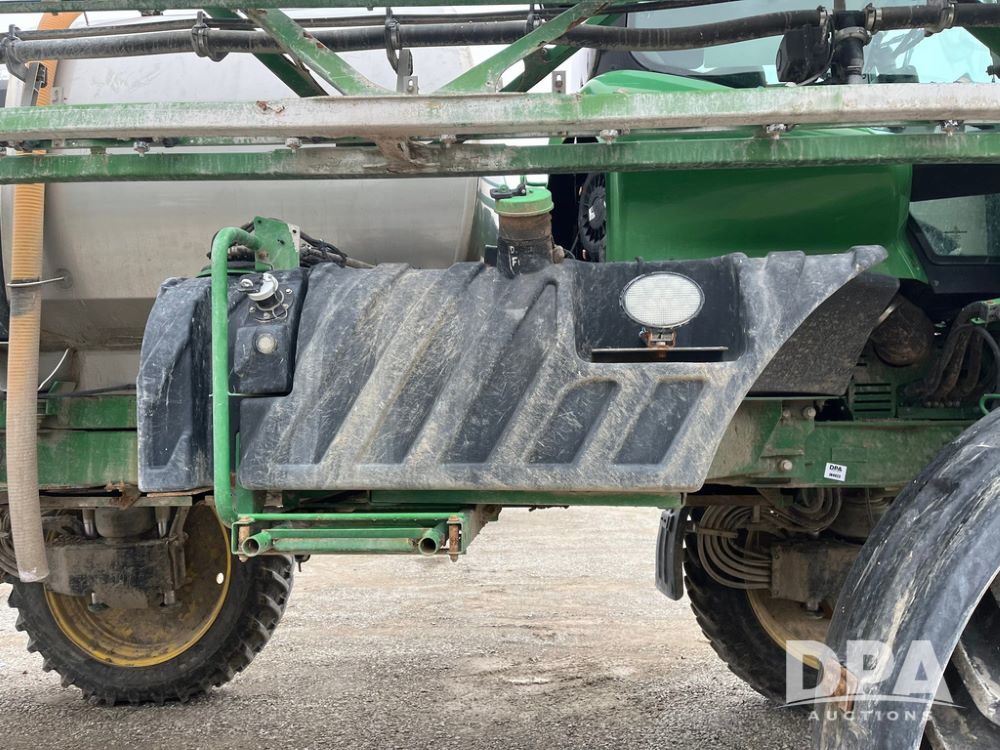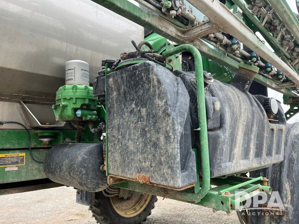 2017 John Deere R4038 Sprayer (JN4023), John Deere diesel engine (SN:RG6090U033585), hydrostatic transmission, heat, air conditioning, radio, 1,000 gallon stainless steel liquid system, 120' boom, 15" spacing, front fill, 380/90R46 row crop tires, fenders, StarFire 3000 globe, John Deere monitor, shows 3,494 hours.