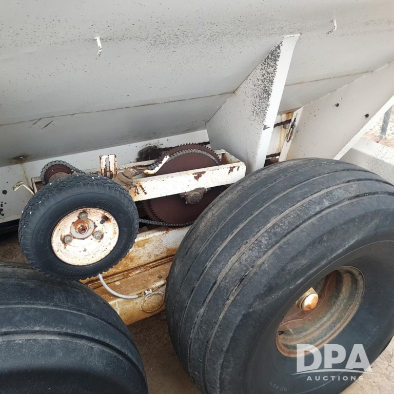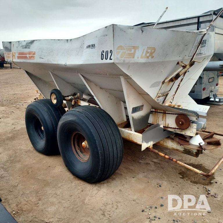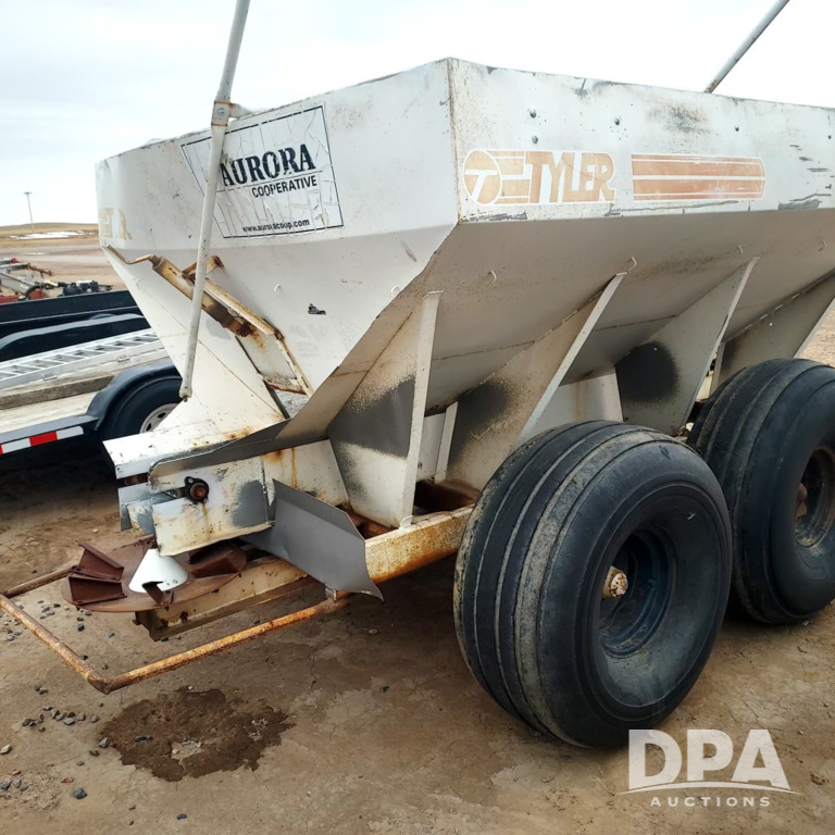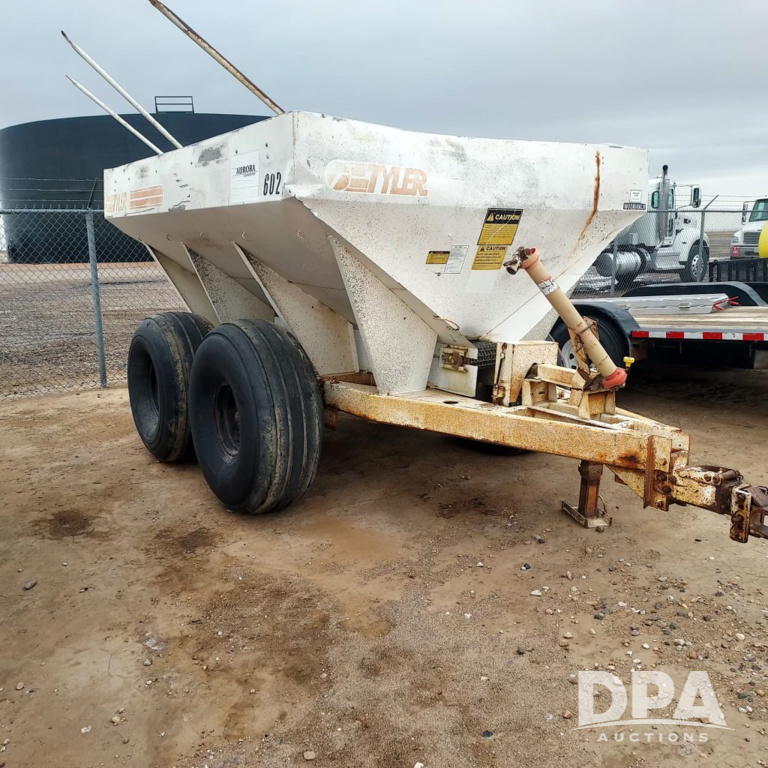 Tyler Dry Spreader (PZ14480, Unit GTA05), Tyler Moonwalk dry spreader, single spinner, PTO, tandem axle, flotation tires.