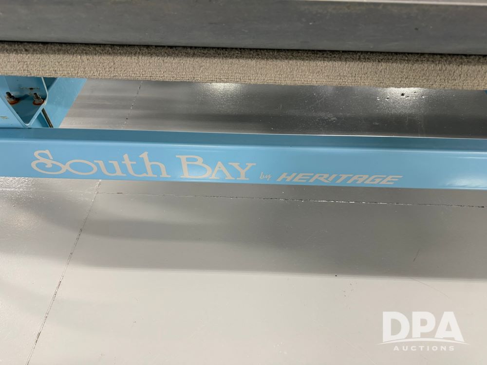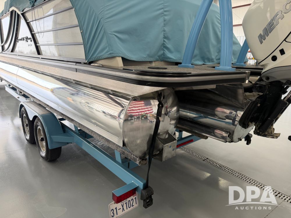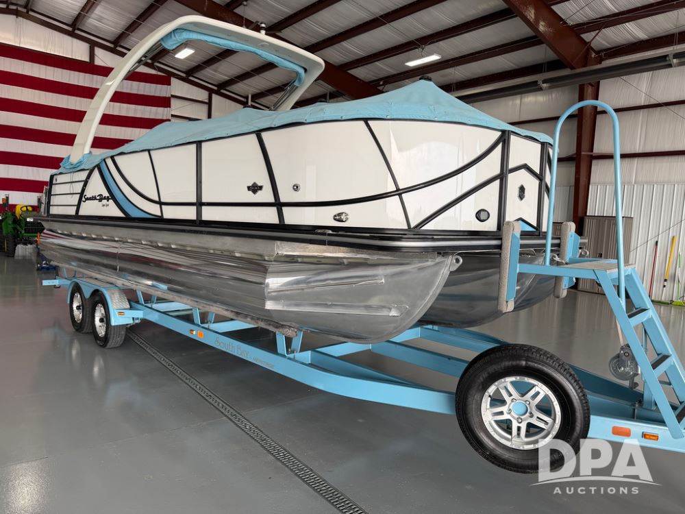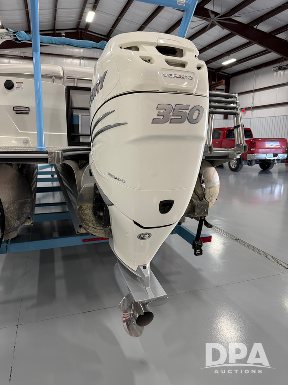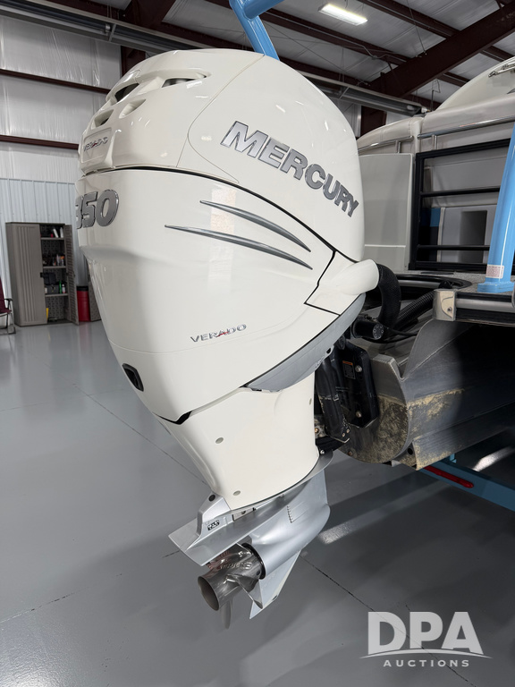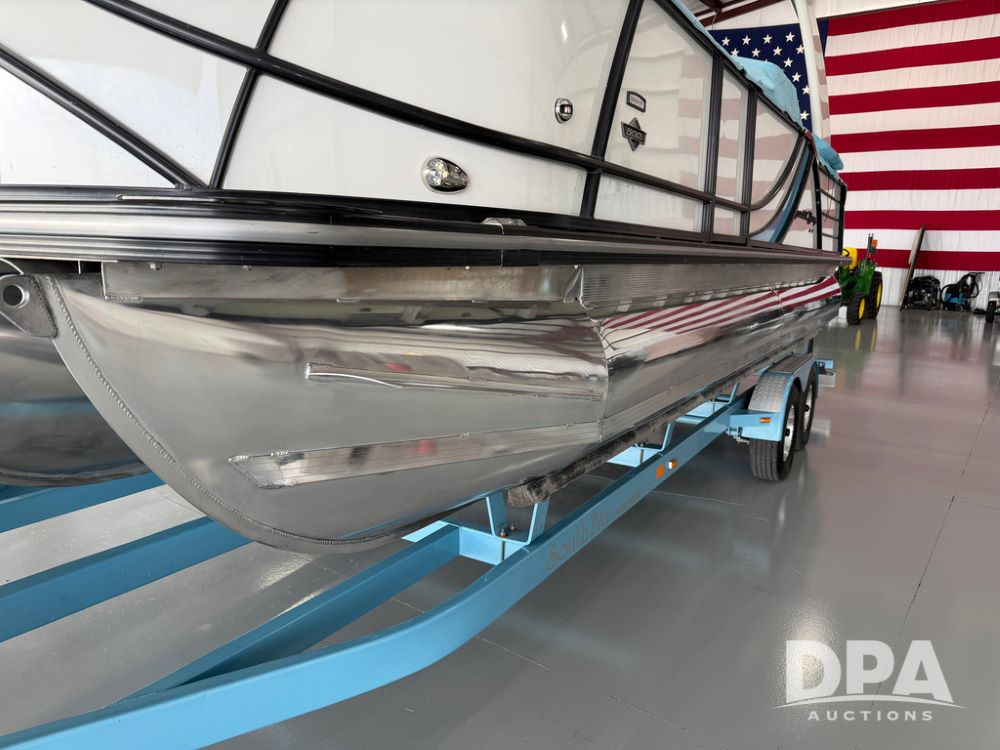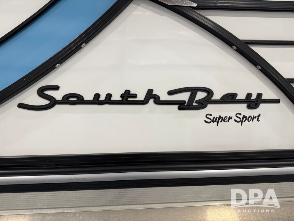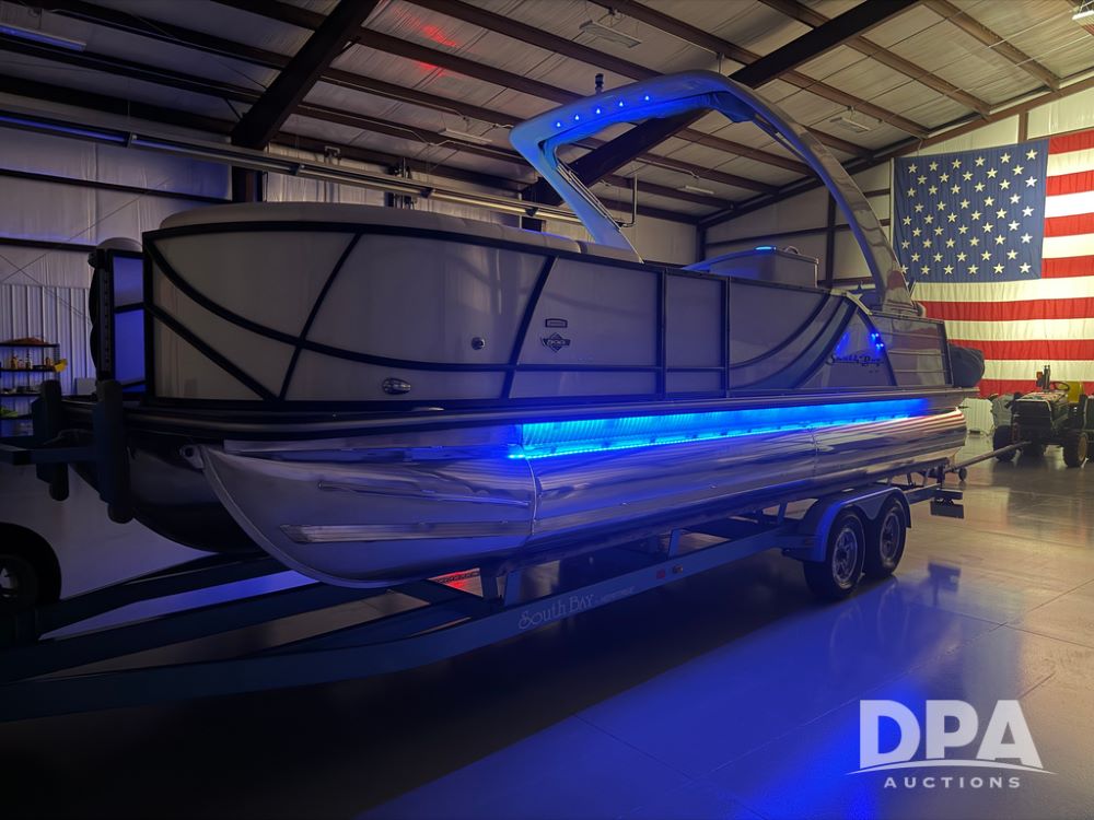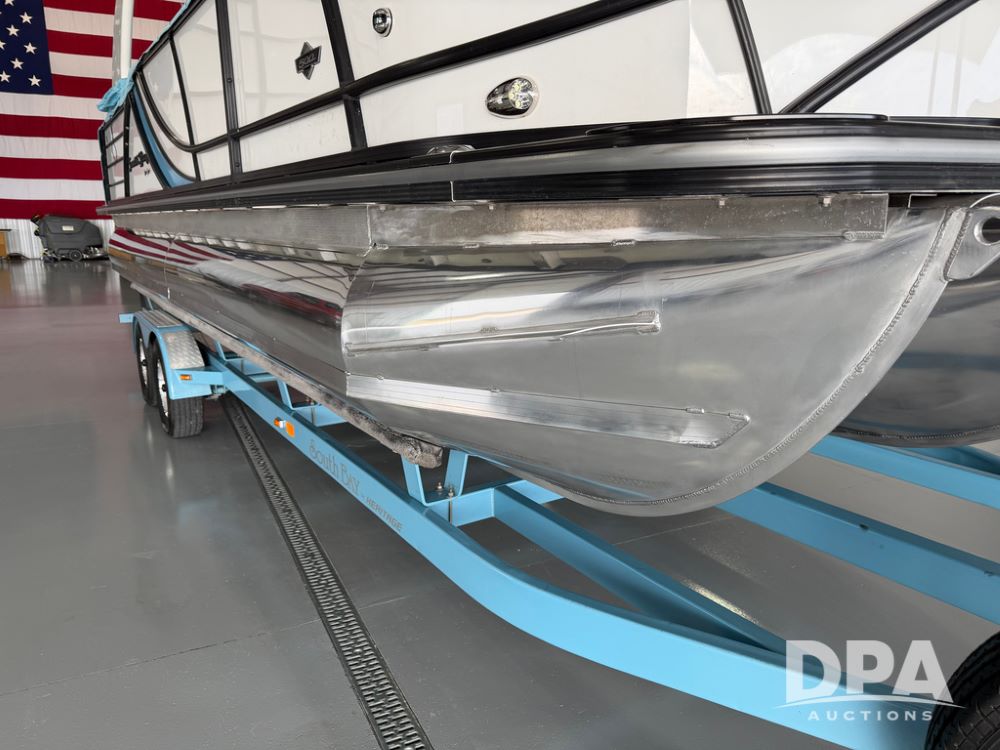 2019 South Bay 525E Arch Series 500 3.0+ Tri-Toon Pontoon (NP6559), loungers in front and rear, storage in floor, under dash and table, covered sink, overhead fiberglass canopy w/ extending Bimini sun shade, LED lights throughout and under water, Simrad LED display dash, JL Audio system and speakers, hidden trash area, double battery w/ shut off, rear 110V plug in, rear fuel cap, speed and depth finder alarms, tow frame, retractable ladder, 2019 Mercury Verado 350HP motor (S/N 2B603720), stainless steel prop, electric engine lift, 2018 Heritage tandem axle tri-toon trailer, LED lights, front ladder, rear retractable straps, spare tire, ONLY 144 hours.
