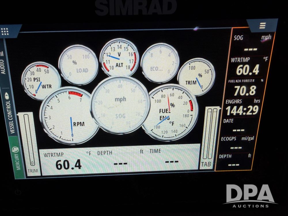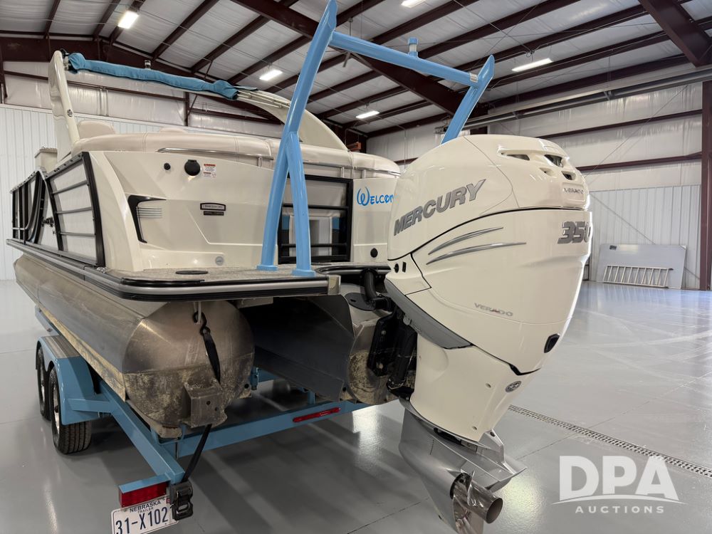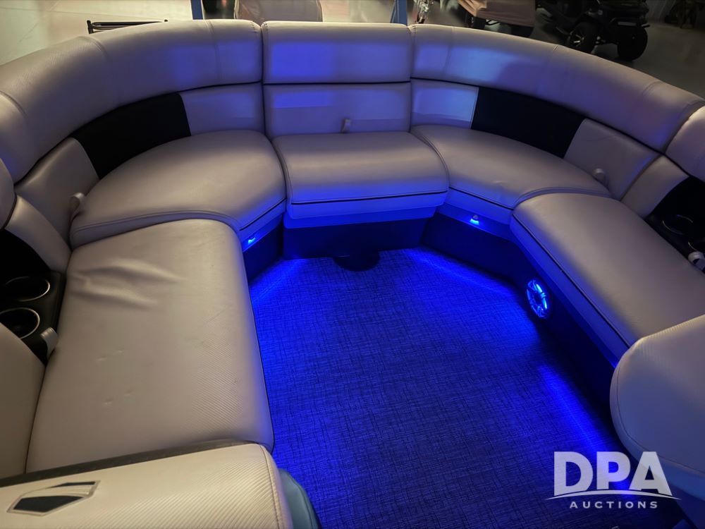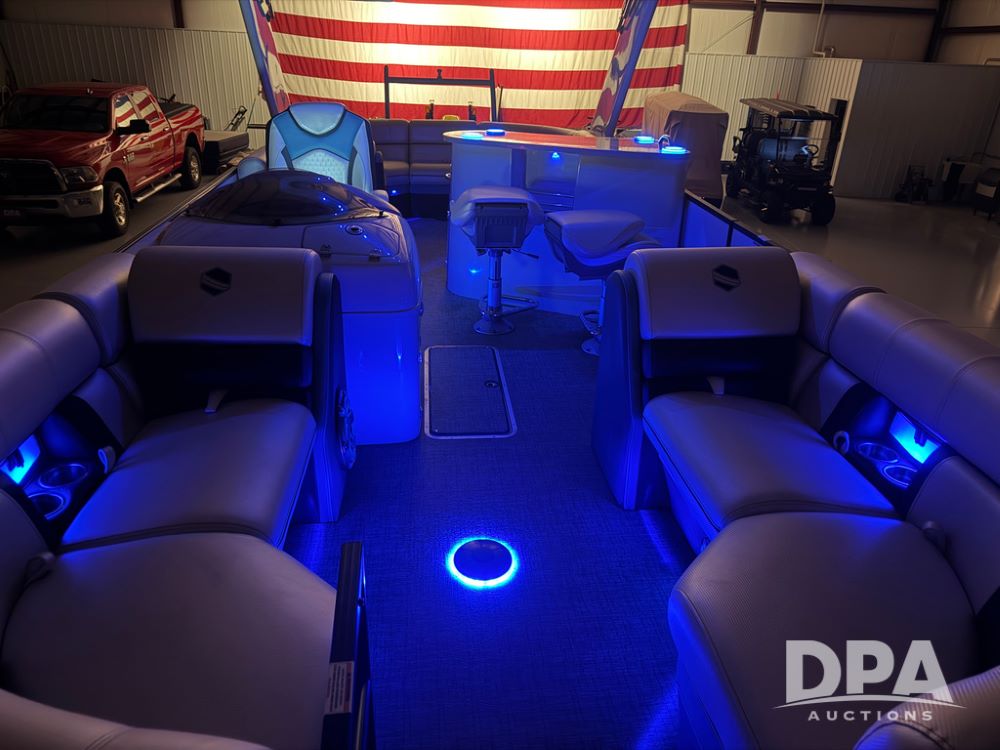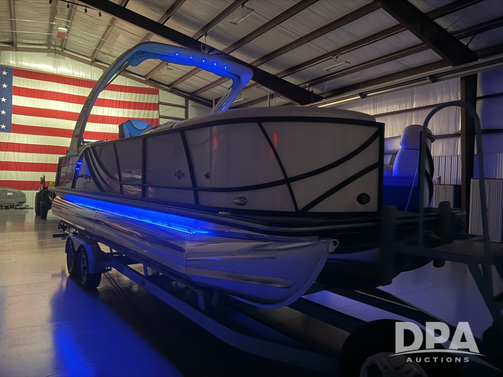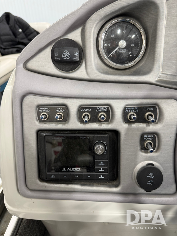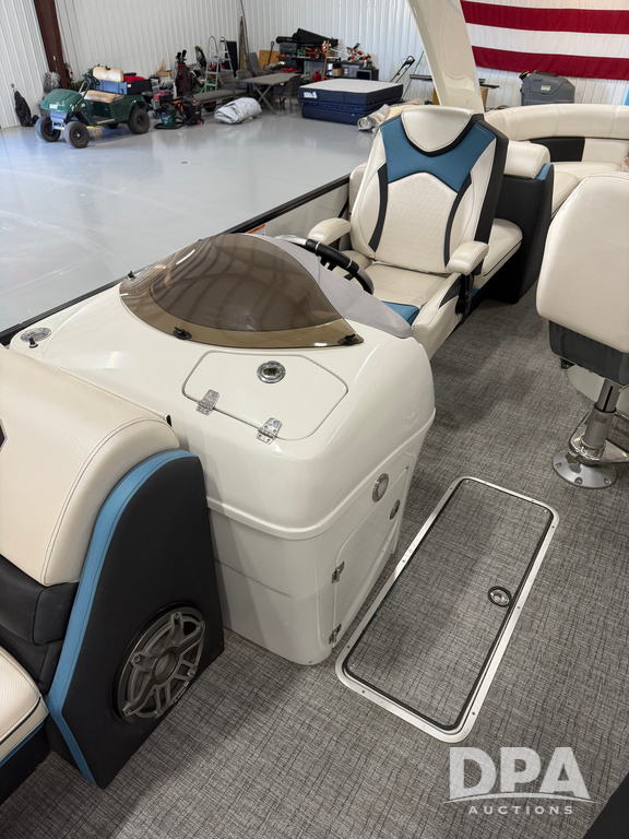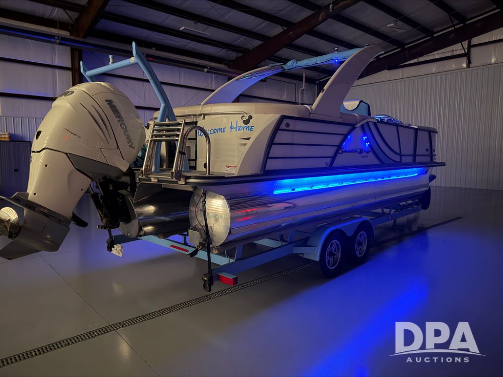 2019 South Bay 525E Arch Series 500 3.0+ Tri-Toon Pontoon (NP6559), loungers in front and rear, storage in floor, under dash and table, covered sink, overhead fiberglass canopy w/ extending Bimini sun shade, LED lights throughout and under water, Simrad LED display dash, JL Audio system and speakers, hidden trash area, double battery w/ shut off, rear 110V plug in, rear fuel cap, speed and depth finder alarms, tow frame, retractable ladder, 2019 Mercury Verado 350HP motor (S/N 2B603720), stainless steel prop, electric engine lift, 2018 Heritage tandem axle tri-toon trailer, LED lights, front ladder, rear retractable straps, spare tire, ONLY 144 hours.