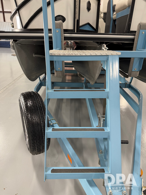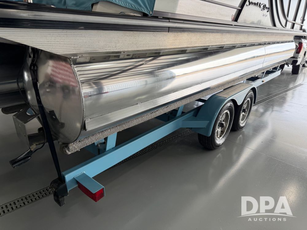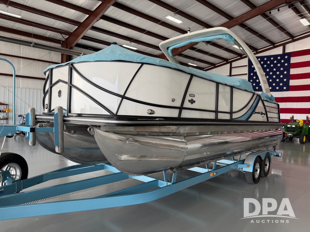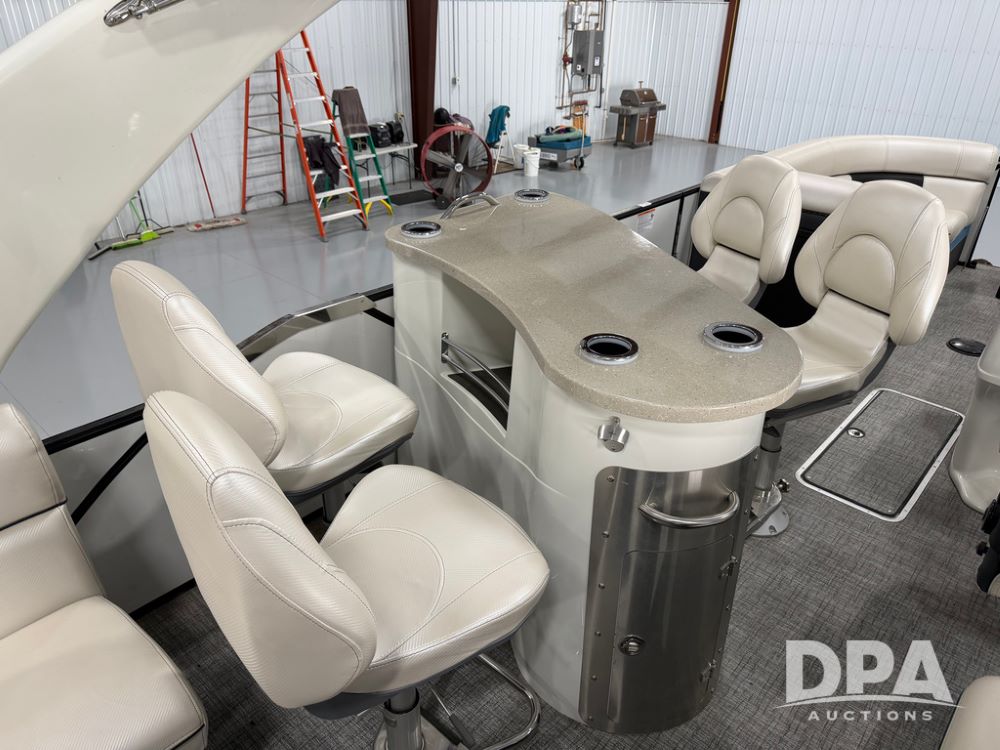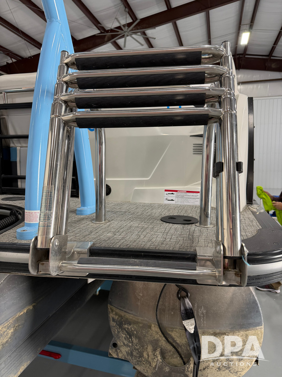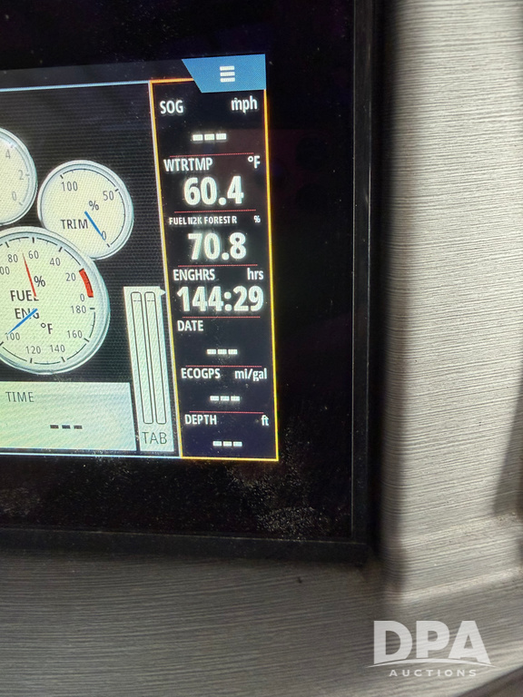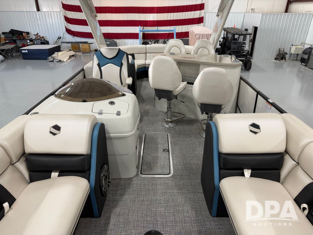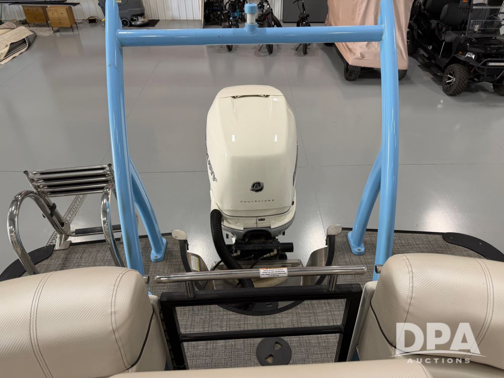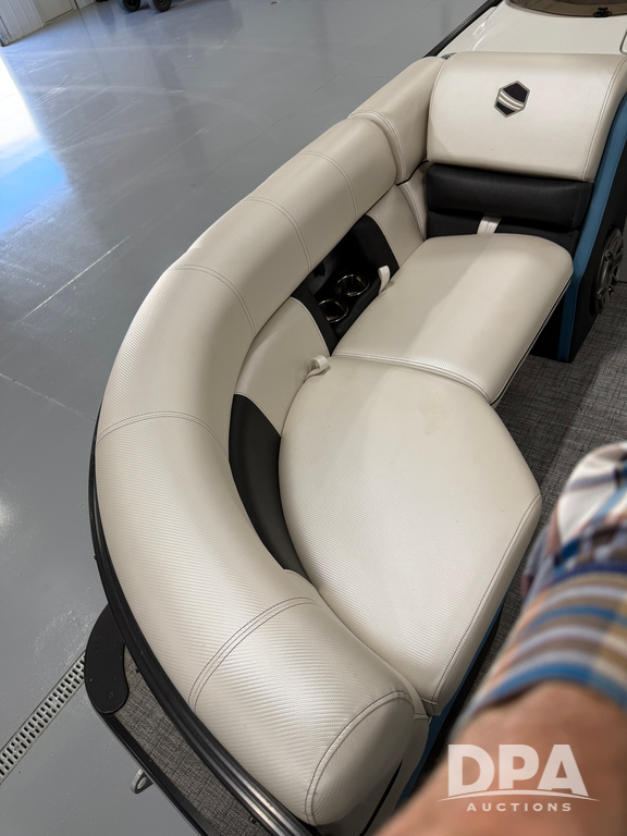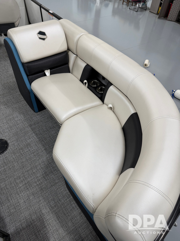 2019 South Bay 525E Arch Series 500 3.0+ Tri-Toon Pontoon (NP6559), loungers in front and rear, storage in floor, under dash and table, covered sink, overhead fiberglass canopy w/ extending Bimini sun shade, LED lights throughout and under water, Simrad LED display dash, JL Audio system and speakers, hidden trash area, double battery w/ shut off, rear 110V plug in, rear fuel cap, speed and depth finder alarms, tow frame, retractable ladder, 2019 Mercury Verado 350HP motor (S/N 2B603720), stainless steel prop, electric engine lift, 2018 Heritage tandem axle tri-toon trailer, LED lights, front ladder, rear retractable straps, spare tire, ONLY 144 hours.