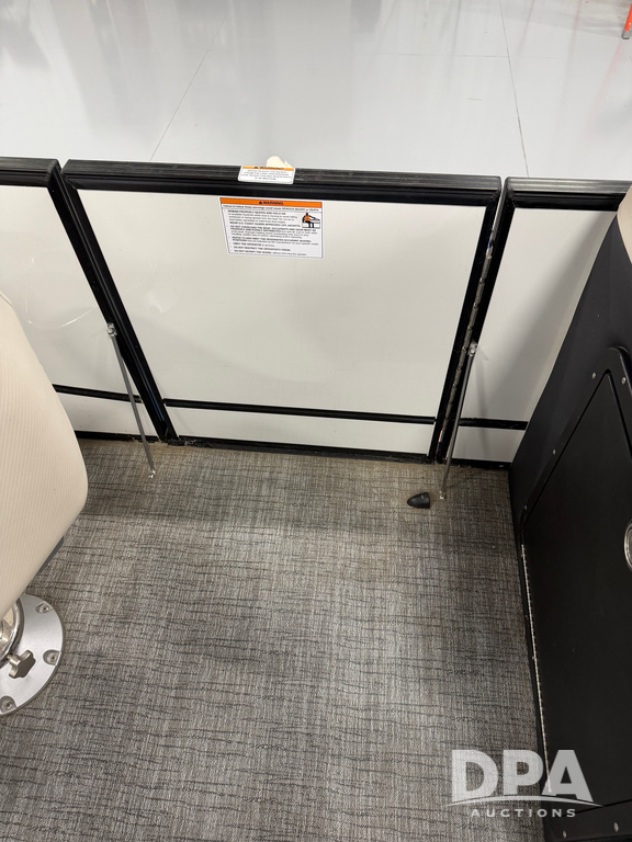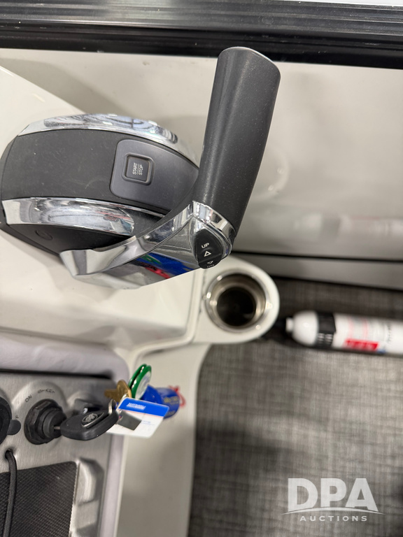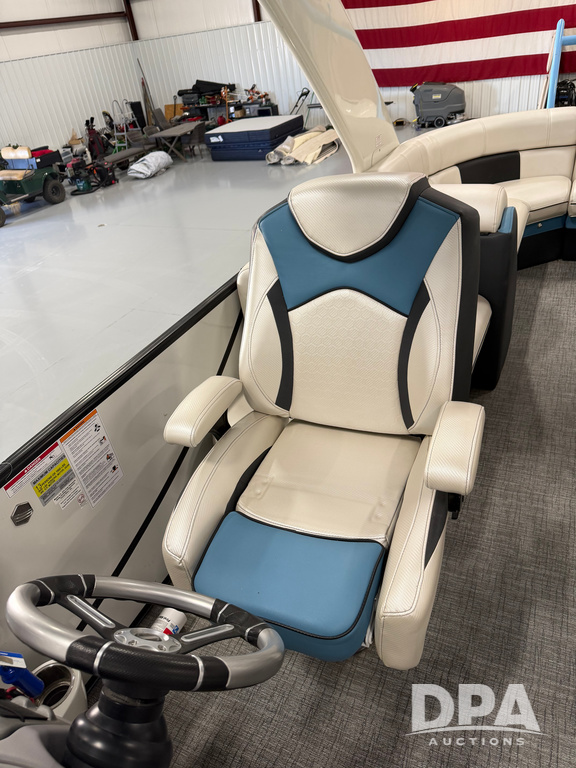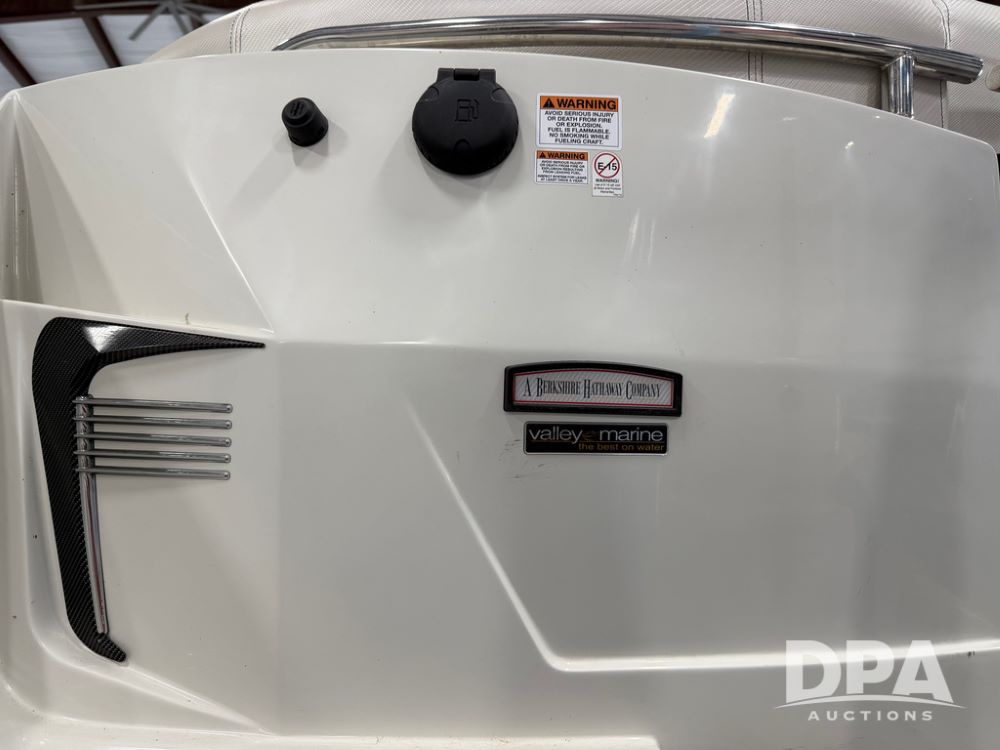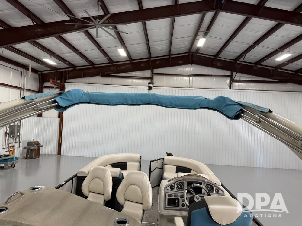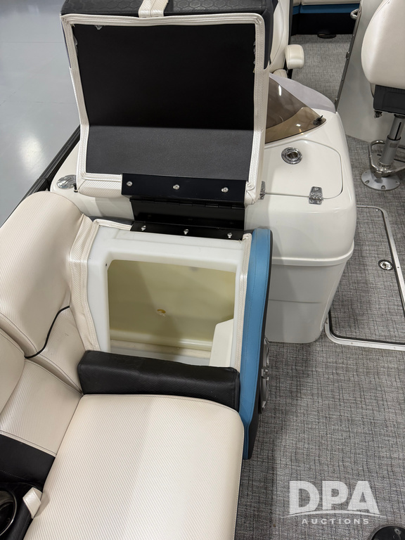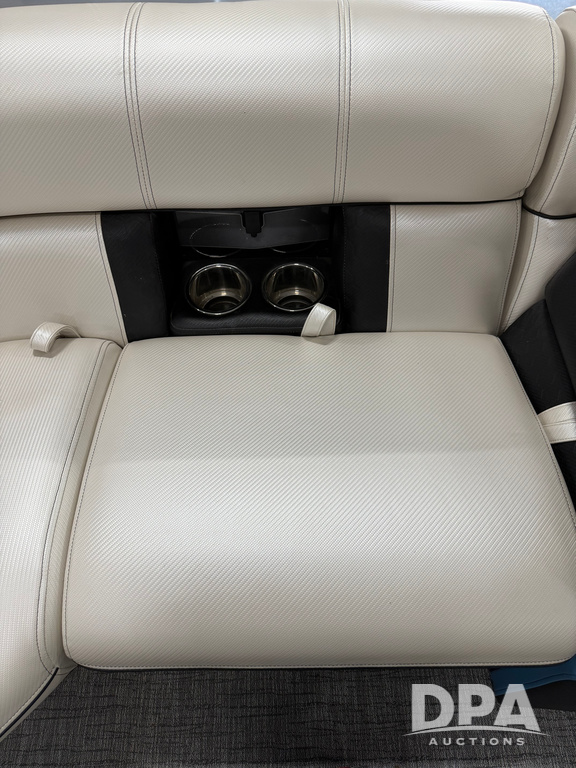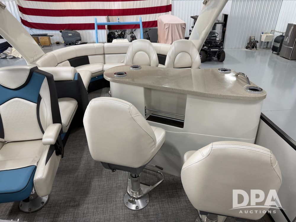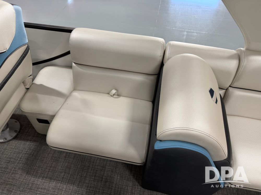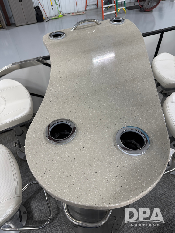 2019 South Bay 525E Arch Series 500 3.0+ Tri-Toon Pontoon (NP6559), loungers in front and rear, storage in floor, under dash and table, covered sink, overhead fiberglass canopy w/ extending Bimini sun shade, LED lights throughout and under water, Simrad LED display dash, JL Audio system and speakers, hidden trash area, double battery w/ shut off, rear 110V plug in, rear fuel cap, speed and depth finder alarms, tow frame, retractable ladder, 2019 Mercury Verado 350HP motor (S/N 2B603720), stainless steel prop, electric engine lift, 2018 Heritage tandem axle tri-toon trailer, LED lights, front ladder, rear retractable straps, spare tire, ONLY 144 hours.